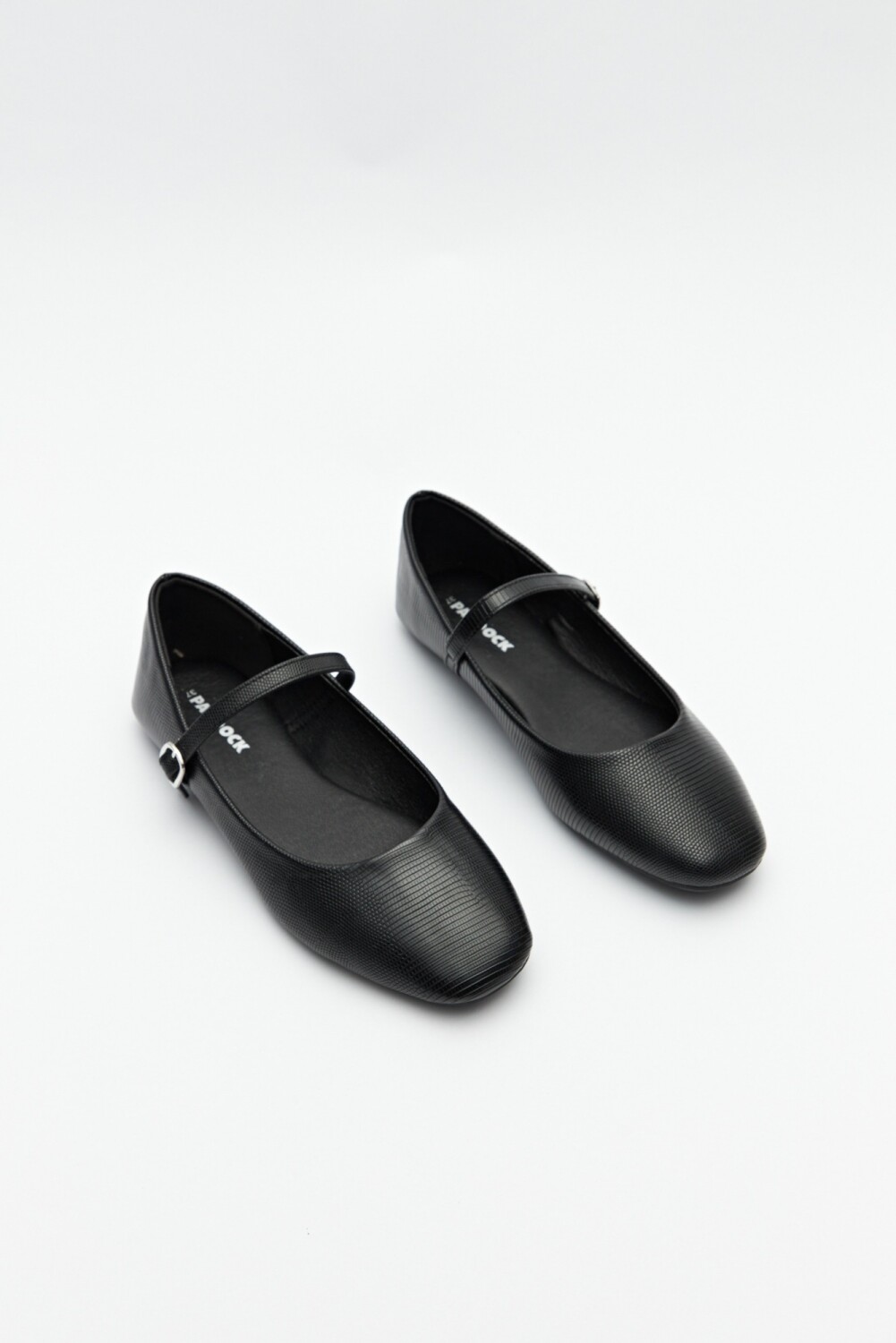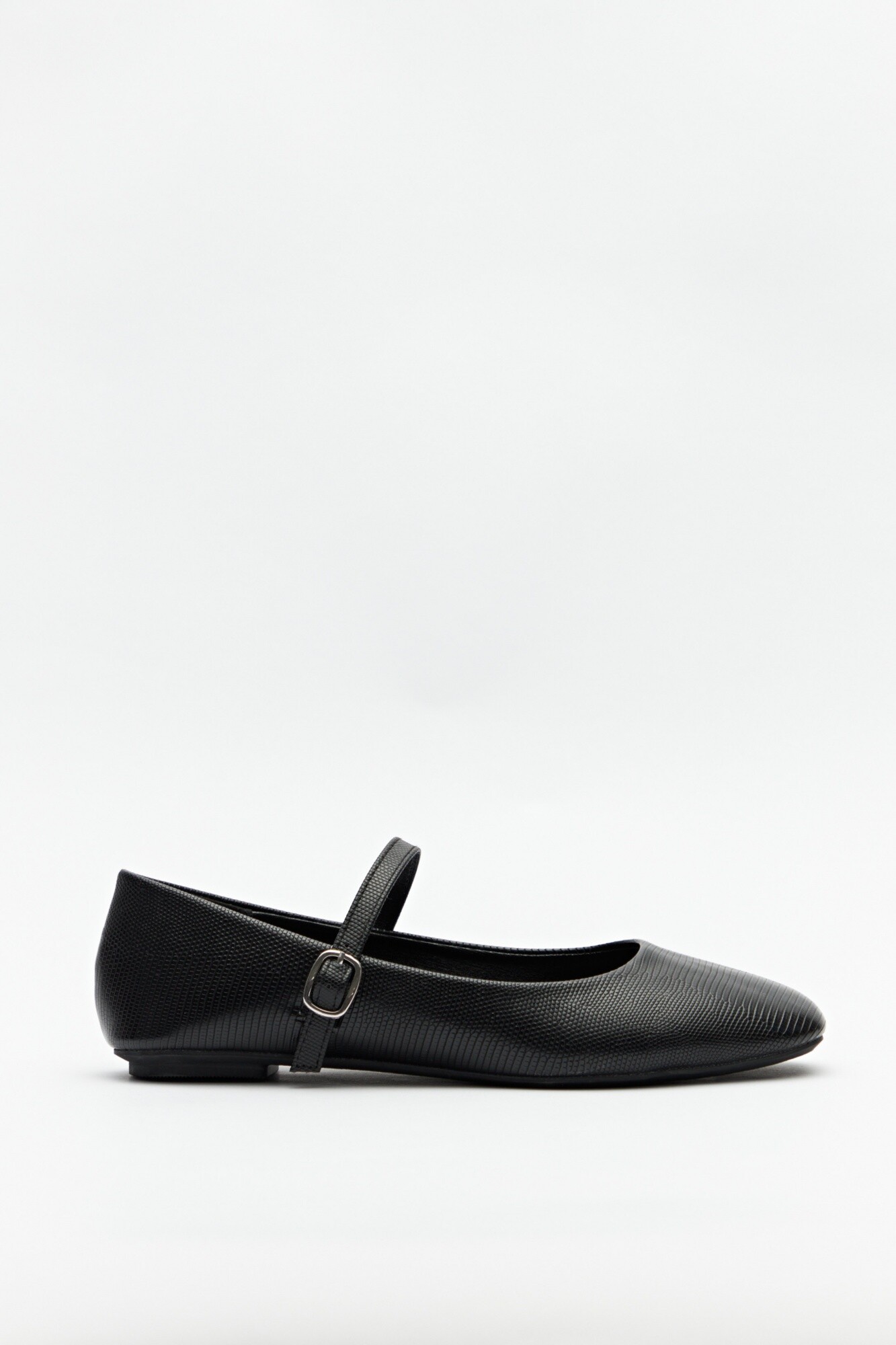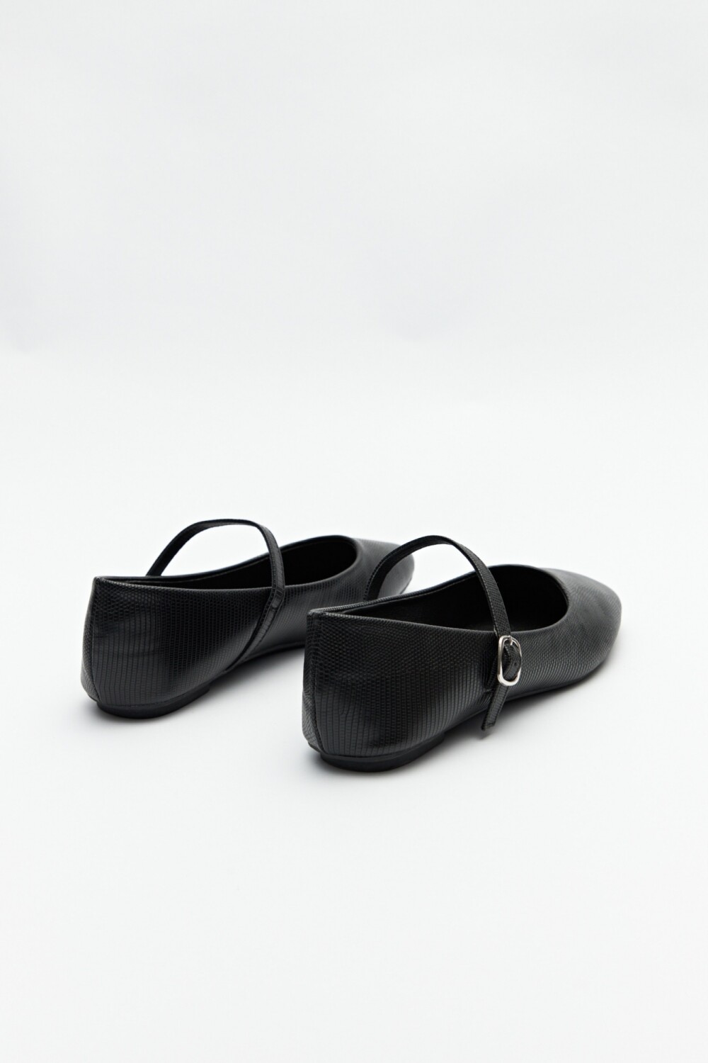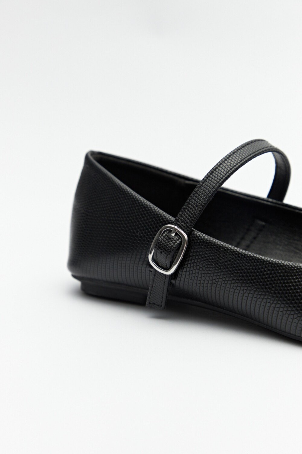 Balerinas en sími cuero texturizado con tira y hebilla metálica ajustable.
