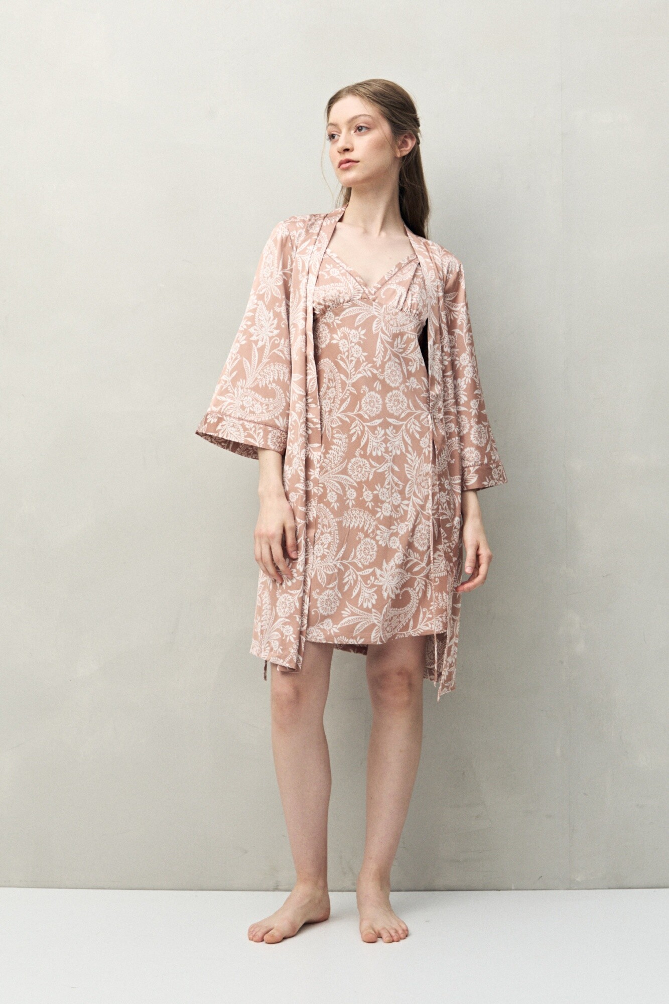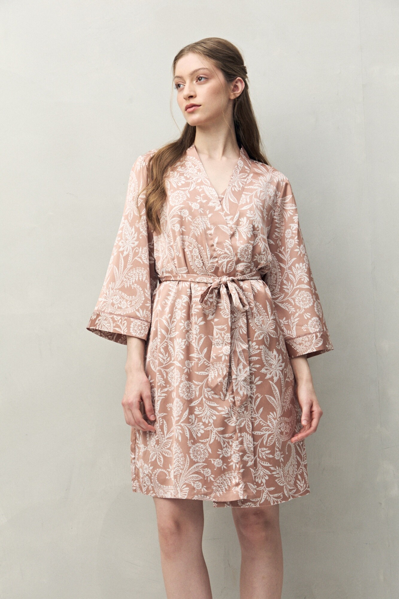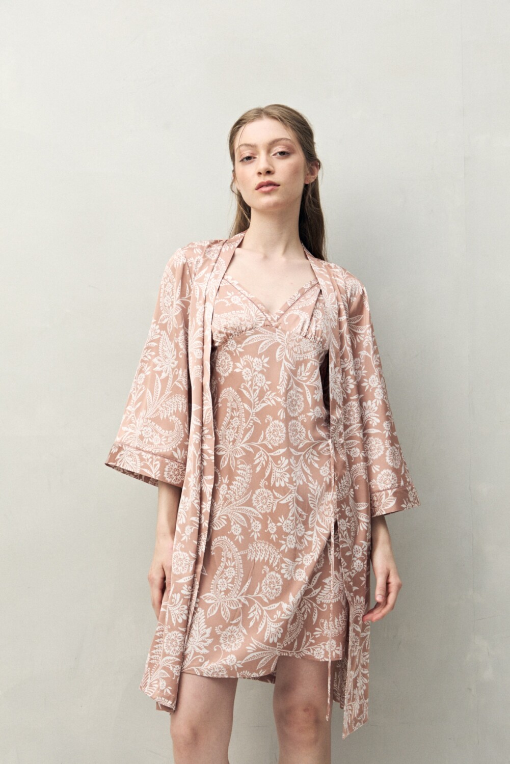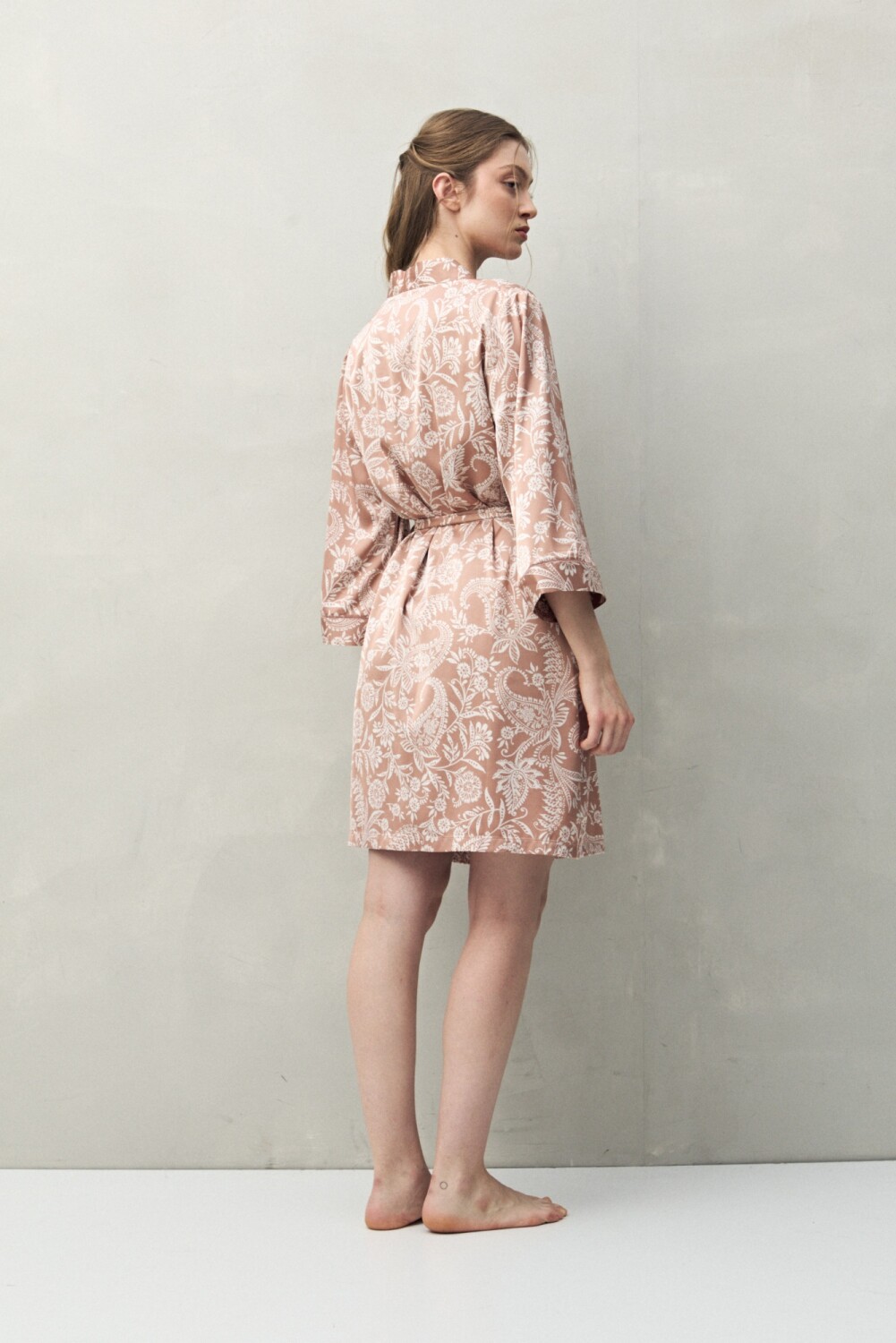 Bata de pijama de silueta relajada, pensada para acompañar momentos de descanso con una impronta cuidada. El diseño tipo kimono presenta cruce frontal y lazo regulable en la cintura, que permite ajustar el calce de forma cómoda y favorecedora. Las mangas amplias y el largo por encima de la rodilla refuerzan esa sensación liviana y fluida, ideal tanto para usar sobre el pijama como sola en casa. Una prenda versátil dentro del universo sleepwear, donde el confort y el diseño conviven en equilibrio.