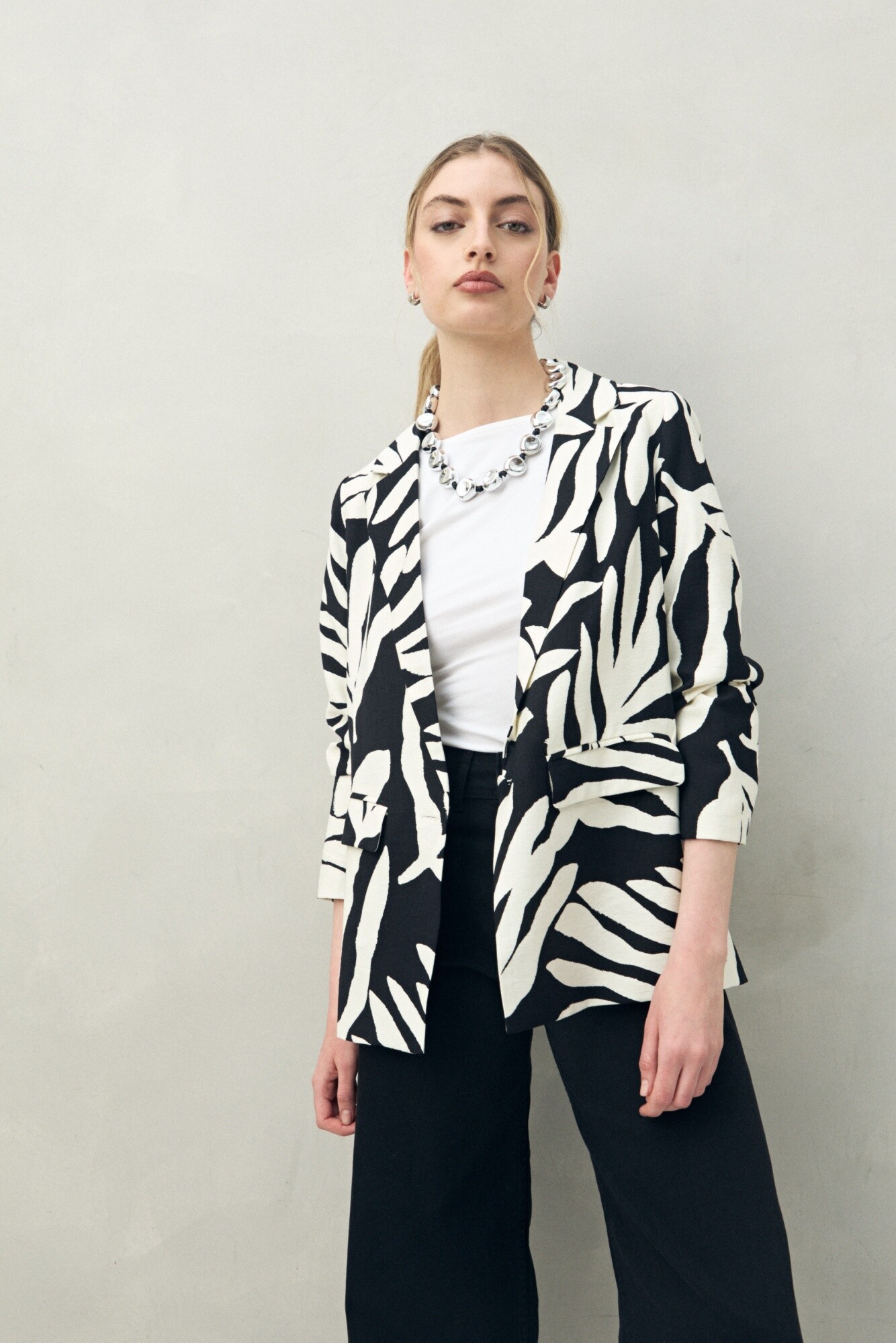 Un blazer que se roba todas las miradas. Su estampa de hojas orgánicas porta dinamismo y modernidad, convirtiéndolo en un statement piece ideal para looks de oficina o salidas más relajadas. Con corte recto, solapas clásicas y bolsillos con tapa, logra un equilibrio perfecto entre estructura y fluidez gracias a su tejido liviano y suave al tacto.
