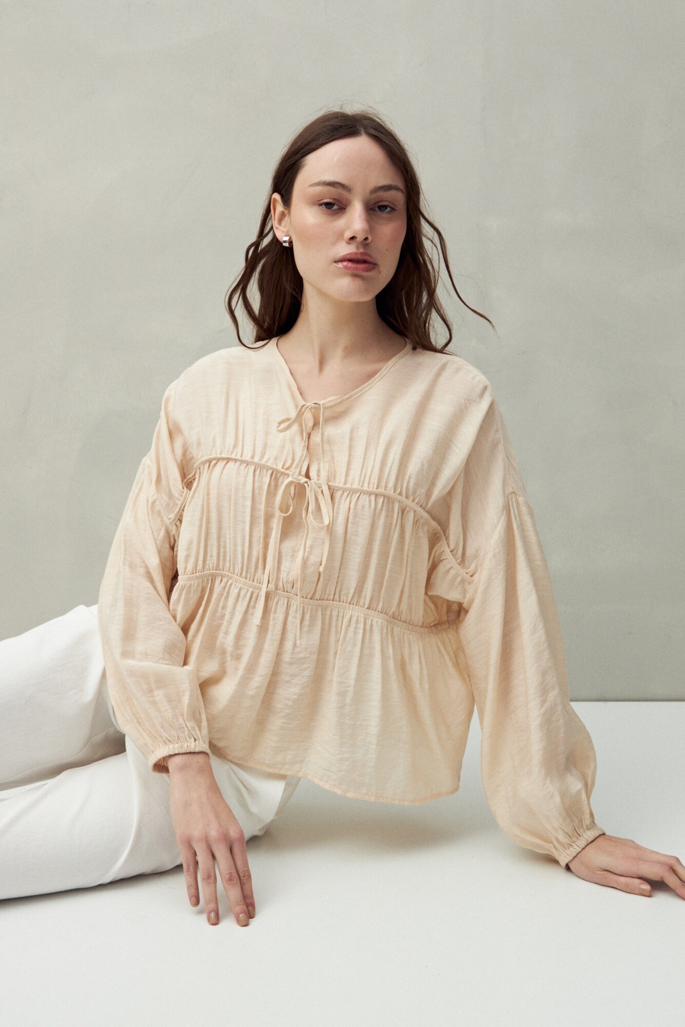 Blusa de caída fluida con cuello redondo y dos lazos frontales que aportan un toque delicado y femenino. Su diseño con cortes horizontales y frunces genera un volumen sutil, mientras que las mangas largas con puños elastizados suman comodidad. Una prenda ligera y versátil, perfecta para un look relajado pero cuidado.