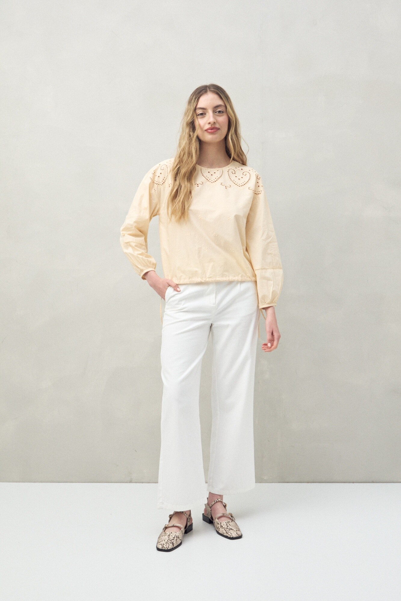 20 Blusa de algodón con cuello a la base y delicados bordados calados en el canesú que aportan un aire artesanal y femenino. Presenta mangas largas con pequeñas aberturas lineales y ajuste con elástico en el puño, sumando comodidad y un toque sutil de volumen. El cordón en la base permite entallarla o llevarla más suelta según el estilo.