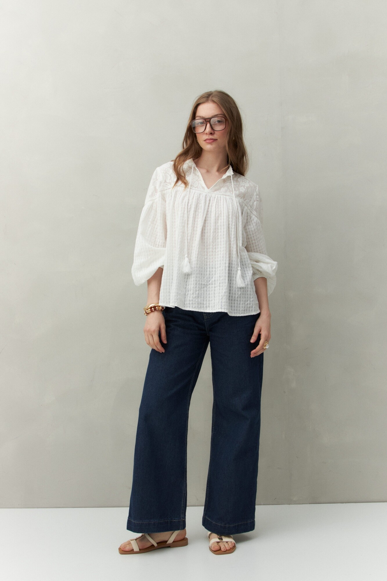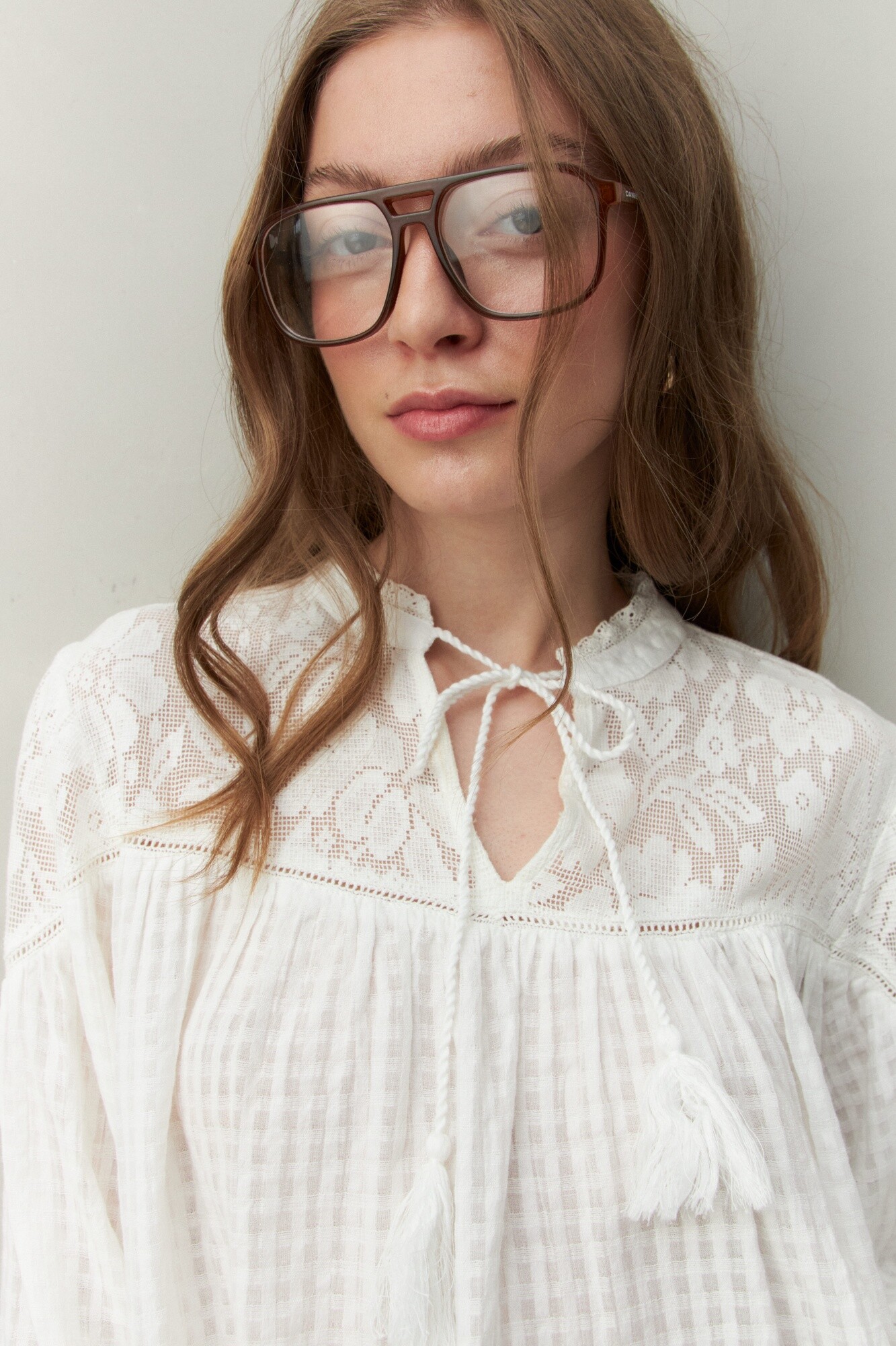 Esta blusa combina el encanto romántico del encaje con la frescura del algodón, logrando una prenda etérea y femenina. Su diseño destaca por la yoke superior de encaje floral que aporta textura y transparencia, contrastando con el cuerpo de cuadrillé. Las mangas amplias terminan en puños suaves, generando un efecto abullonado que suma movimiento y delicadeza. El escote con lazo o cuello partido refuerza su aire boho chic, ideal para looks relajados pero con estilo.