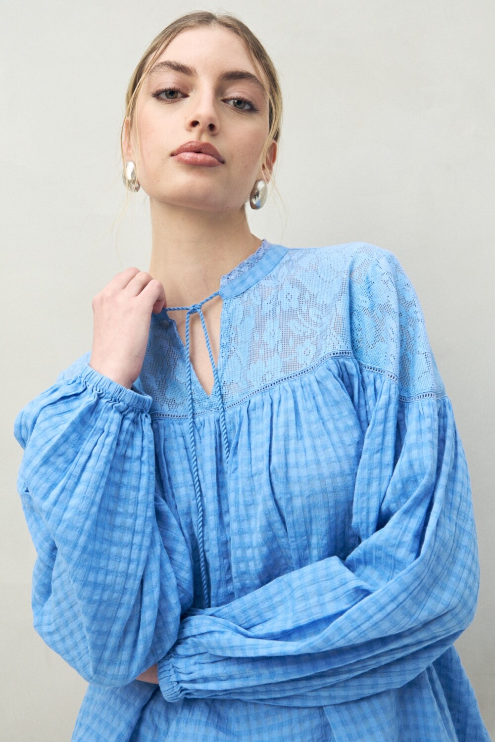 Esta blusa combina el encanto romántico del encaje con la frescura del algodón, logrando una prenda etérea y femenina. Su diseño destaca por la yoke superior de encaje floral que aporta textura y transparencia, contrastando con el cuerpo de cuadrillé. Las mangas amplias terminan en puños suaves, generando un efecto abullonado que suma movimiento y delicadeza. El escote con lazo o cuello partido refuerza su aire boho chic, ideal para looks relajados pero con estilo.