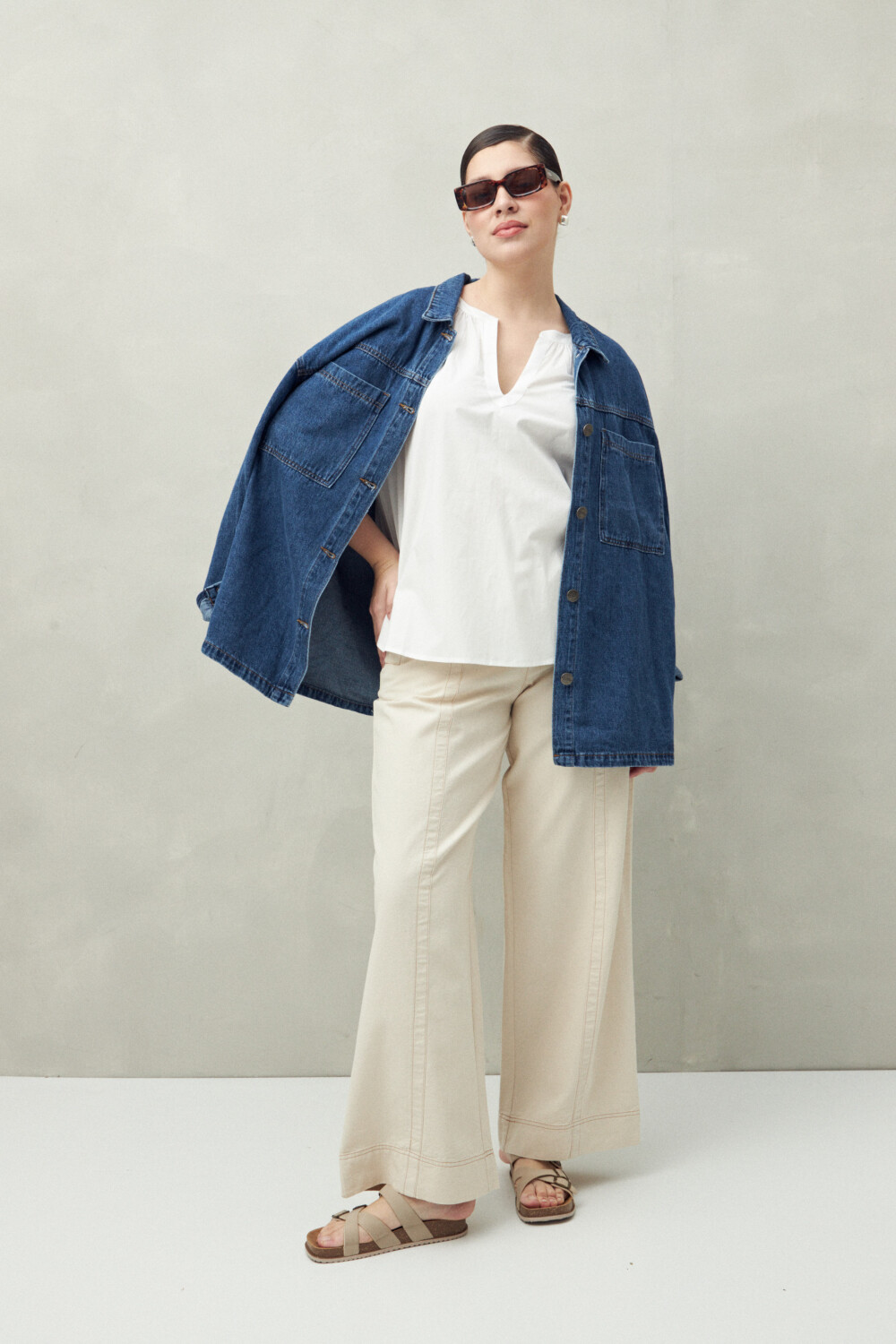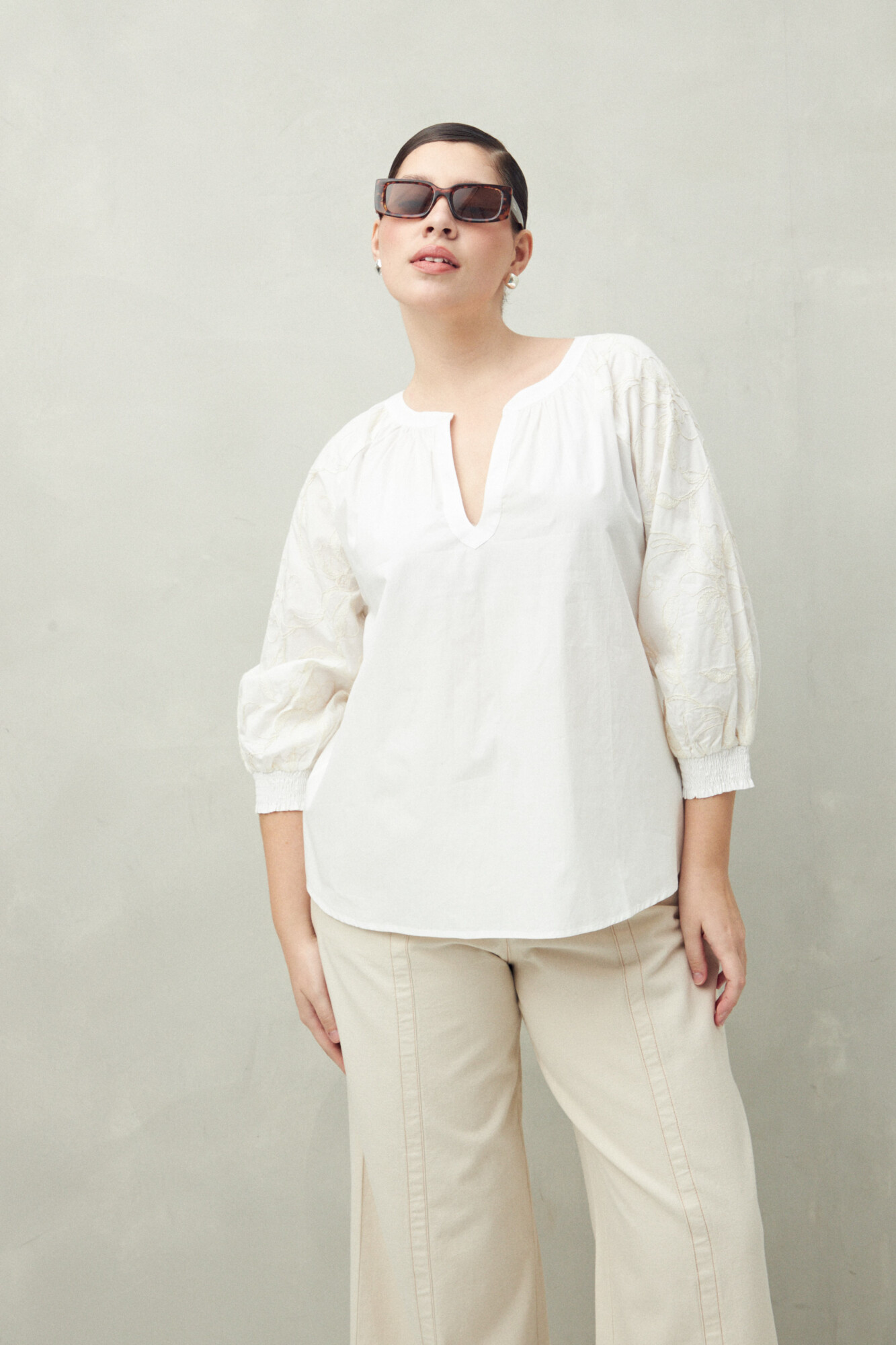 Blusa de algodón con bordado delicado en las mangas y escote en “V” que enmarca el cuello con naturalidad. Las mangas 3/4 con terminación elastizada aportan volumen y un aire bohemio sutil, ideal para elevar un look relajado de día.