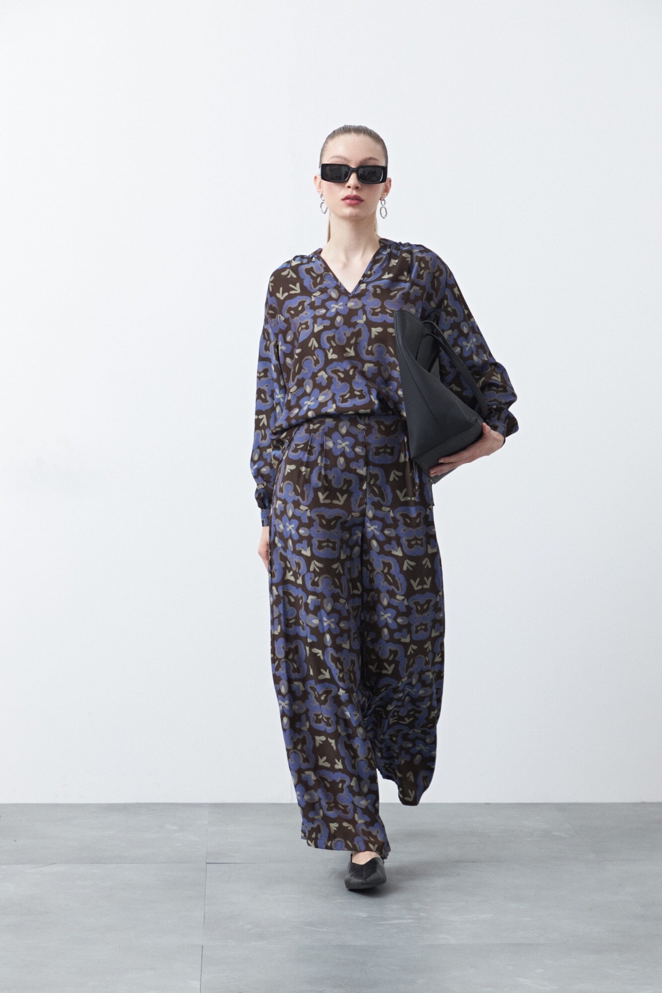Blusa estampada de manga larga, diseñada para equilibrar comodidad y estilo en una silueta fluida pero femenina. El corte está pensado para acentuar la cintura de forma sutil, logrando una caída favorecedora sin perder movimiento.