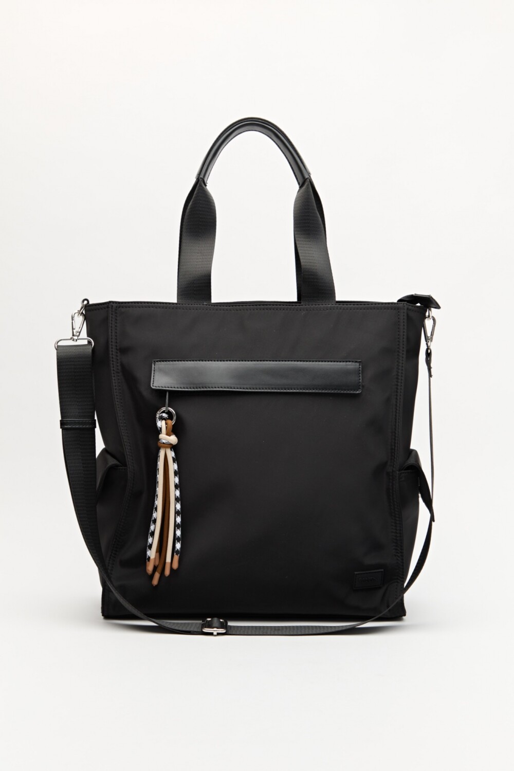 Presenta doble asa superior y correa desmontable para llevar al hombro o cruzado, además de bolsillo frontal con tapa y detalle colgante que aporta un acento distintivo. Su interior cuenta con compartimentos funcionales que facilitan la organización, mientras que los bolsillos laterales suman capacidad y comodidad de uso.