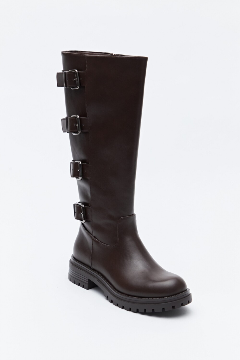 20 Botas tipo biker de caña alta en símil cuero, un diseño de inspiración urbana que combina actitud y versatilidad. Presentan múltiples tiras con hebillas metálicas que aportan carácter al modelo, junto con una suela robusta con relieve que brinda estabilidad y un look contemporáneo. Una prenda clave para sumar personalidad a distintos outfits de temporada.