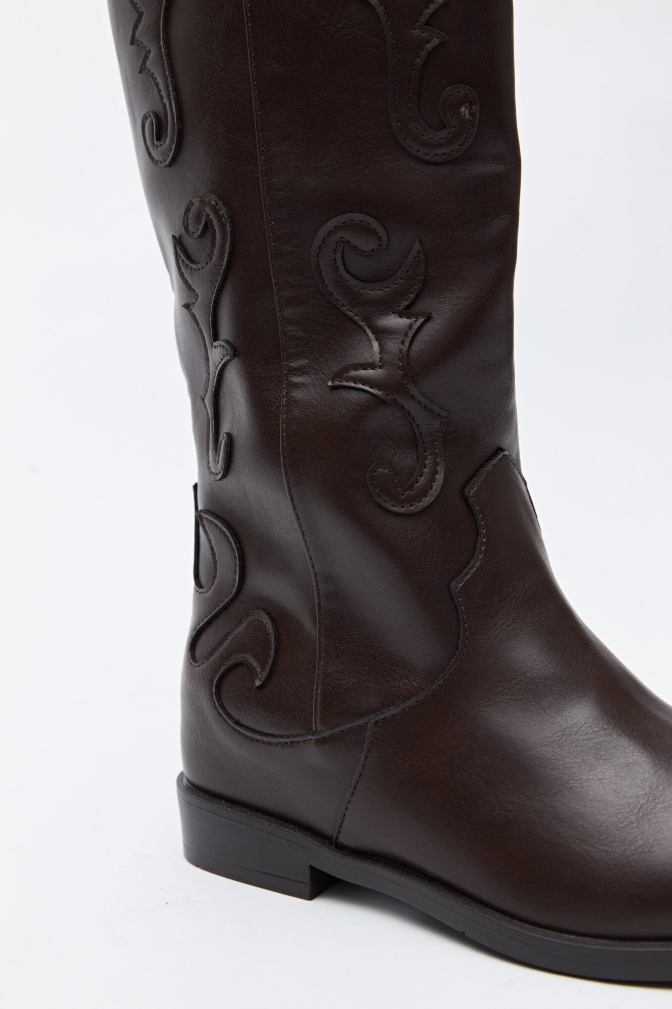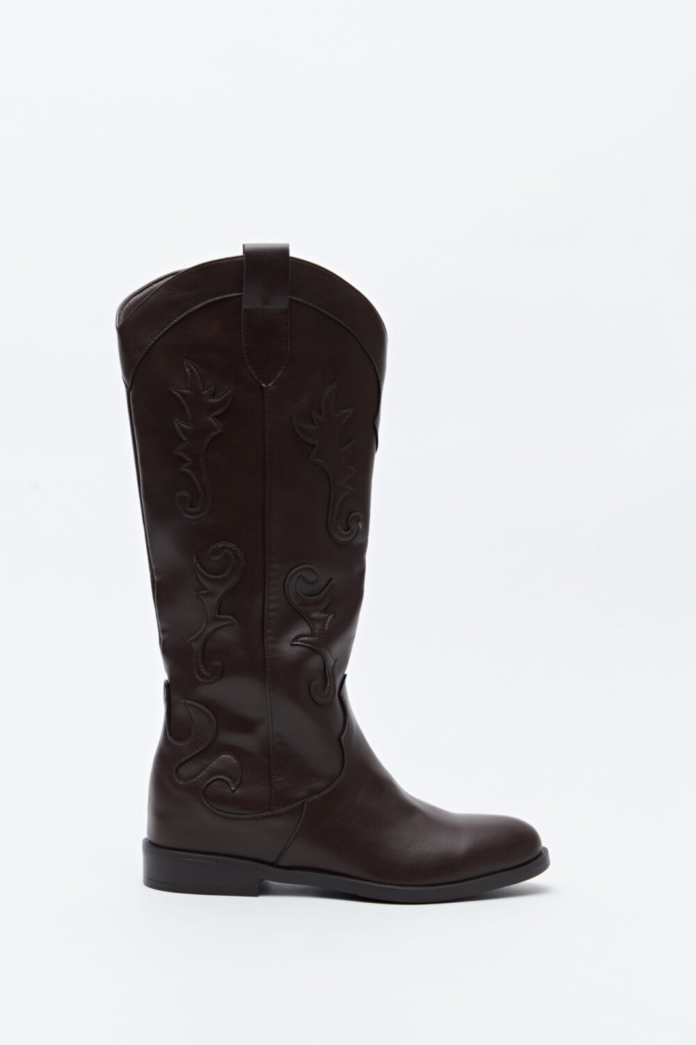 Botas de caña alta tipo western en símil cuero, inspiradas en la estética clásica del universo cowboy. Presentan bordados en relieve a lo largo de la caña que refuerzan su identidad y aportan textura al diseño. La silueta estilizada con puntera afinada y el tirador superior facilitan el calce, mientras que la base baja acompaña con comodidad. Un modelo con personalidad que suma carácter a cualquier look.