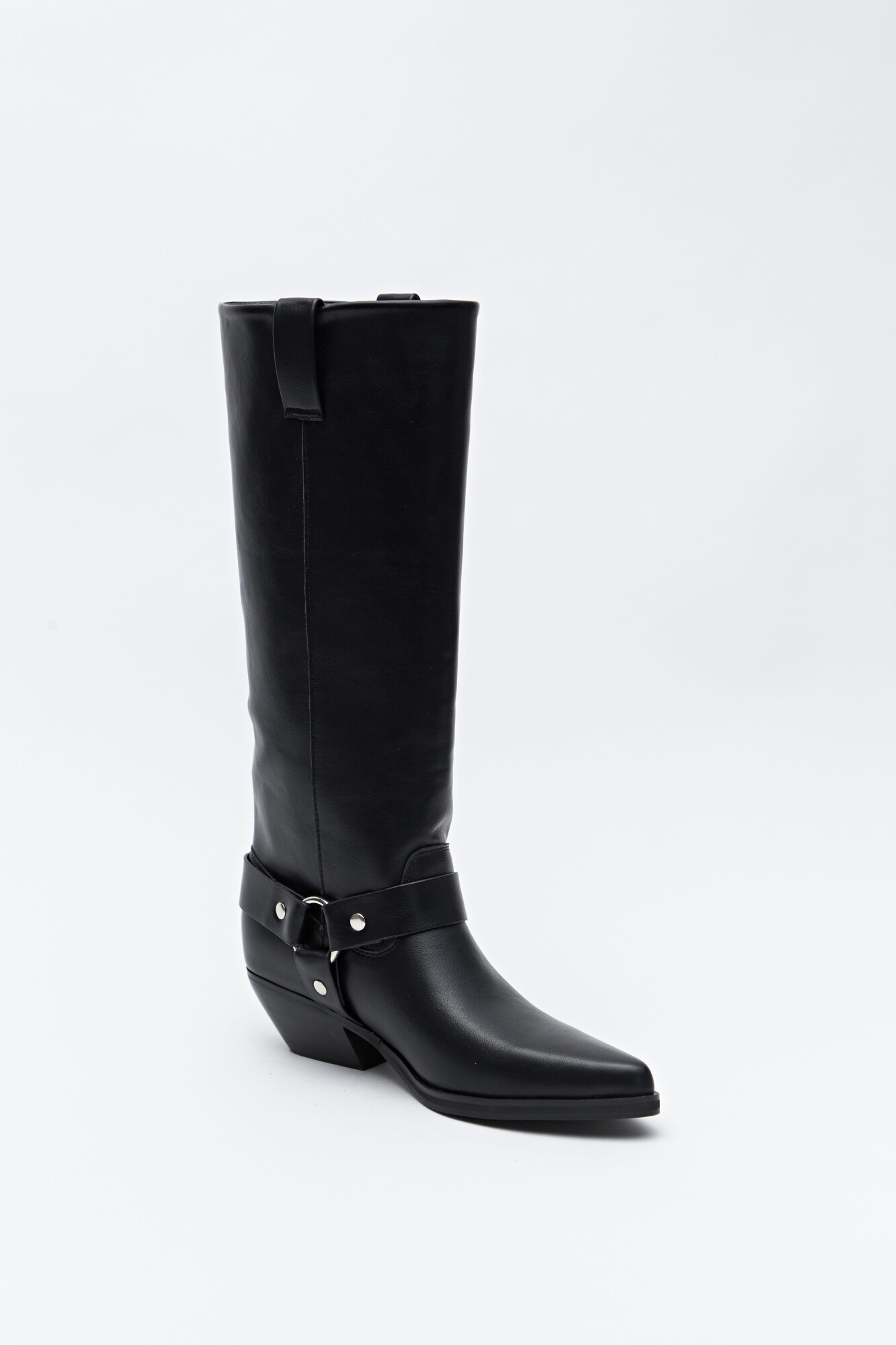 Bota de caña alta con diseño western, confeccionada en poliuretano de acabado liso y estructura firme. Presenta punta levemente afinada, taco bajo estable y detalle de arnés con herrajes metálicos que suma carácter. En sintonía con las tendencias de calzado 2026, las botas altas con estética utilitaria y detalles protagonistas se consolidan como un infaltable urbano, clave para elevar cualquier look.