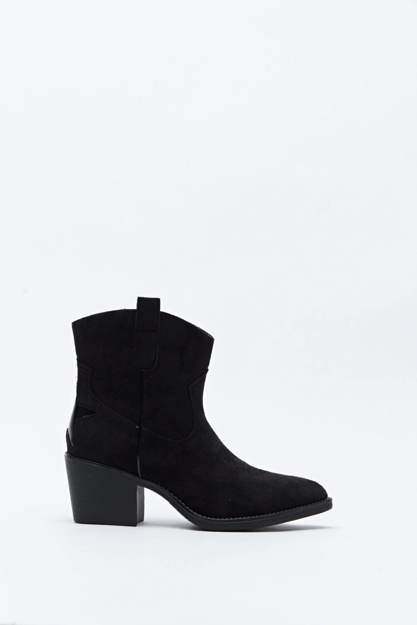 Botas de caña baja estilo western en gamuza, un diseño que combina carácter y actitud. Su silueta inspirada en el universo cowboy se destaca por el taco medio y la puntera estilizada, mientras que el detalle de estrella aplicada en el lateral aporta un acento distintivo. El tirador trasero facilita el calce y completa una prenda ideal para sumar personalidad a looks urbanos o más relajados.