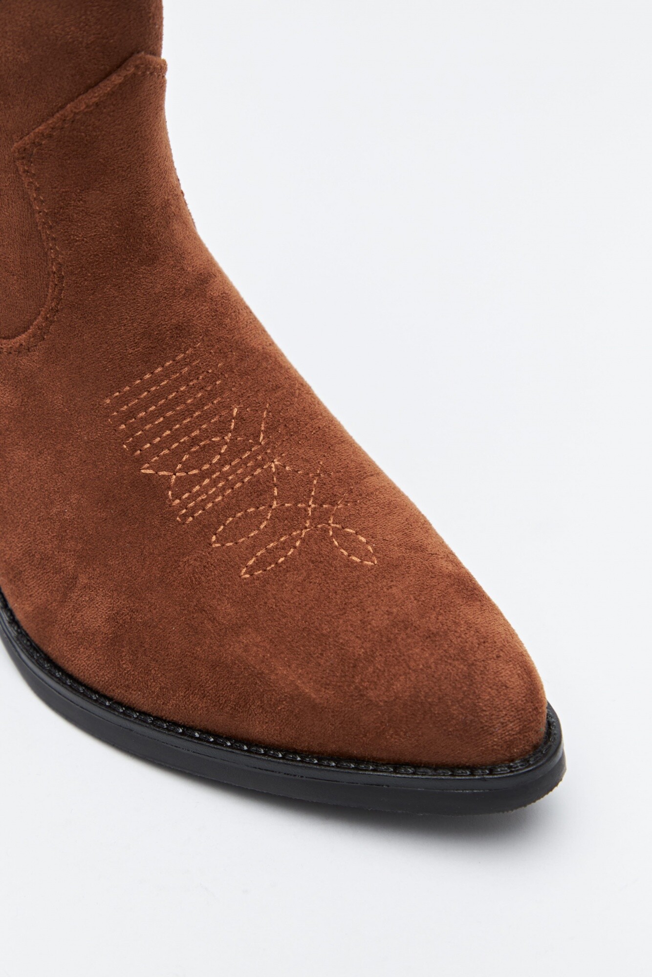 Botas de caña baja estilo western en gamuza, un diseño que combina carácter y actitud. Su silueta inspirada en el universo cowboy se destaca por el taco medio y la puntera estilizada, mientras que el detalle de estrella aplicada en el lateral aporta un acento distintivo. El tirador trasero facilita el calce y completa una prenda ideal para sumar personalidad a looks urbanos o más relajados.