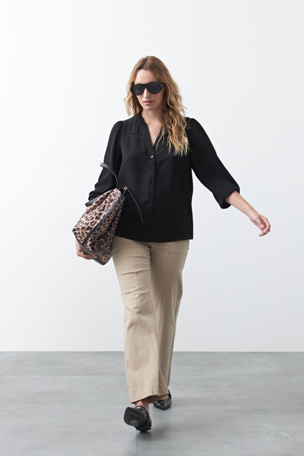 Camisa de estilo clásico con detalles delicados que elevan el look de oficina con una impronta actual. El diseño presenta escote en V con botones frontales y sutiles recortes calados en la zona de los hombros, que aportan textura y un toque distintivo sin perder sobriedad. Una opción versátil, ideal para combinar con sastrería o denim prolijo y lograr un outfit de trabajo canchero y equilibrado.