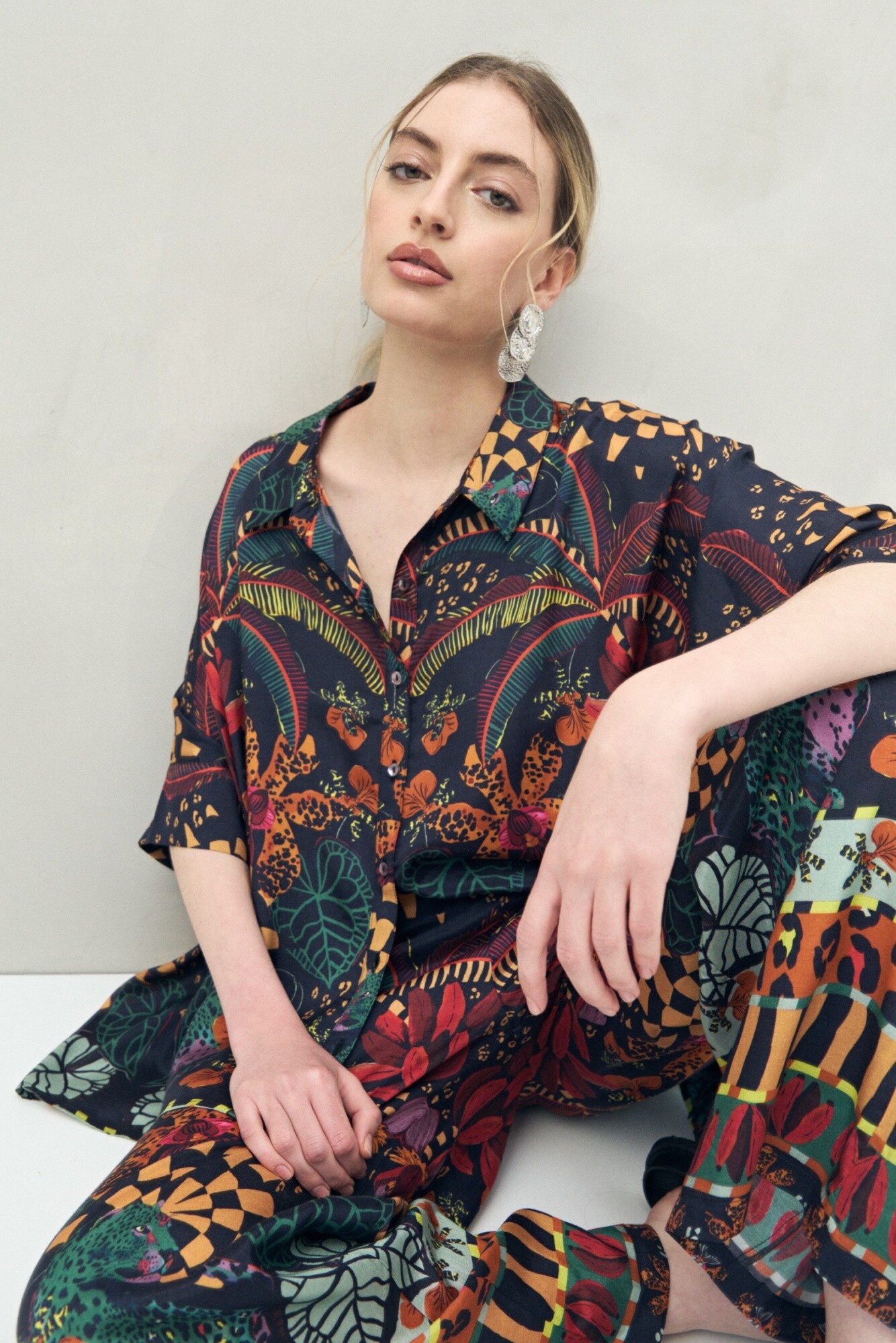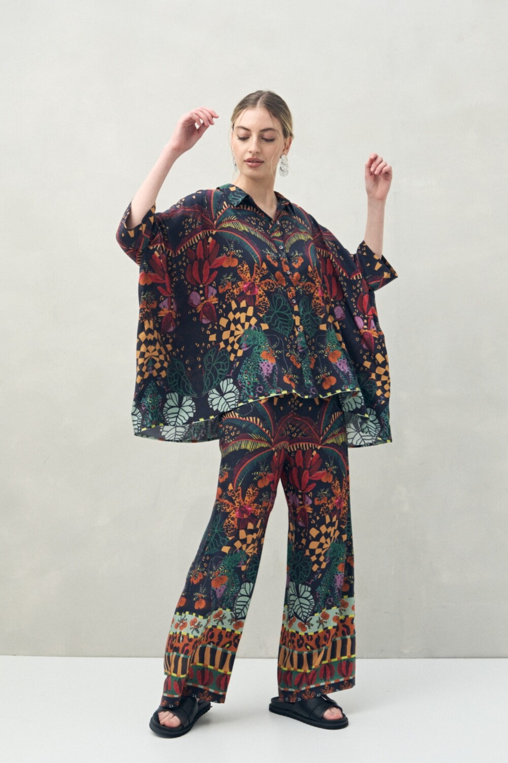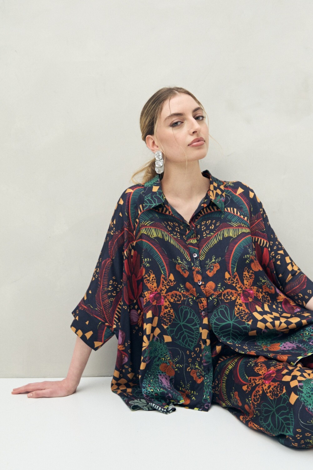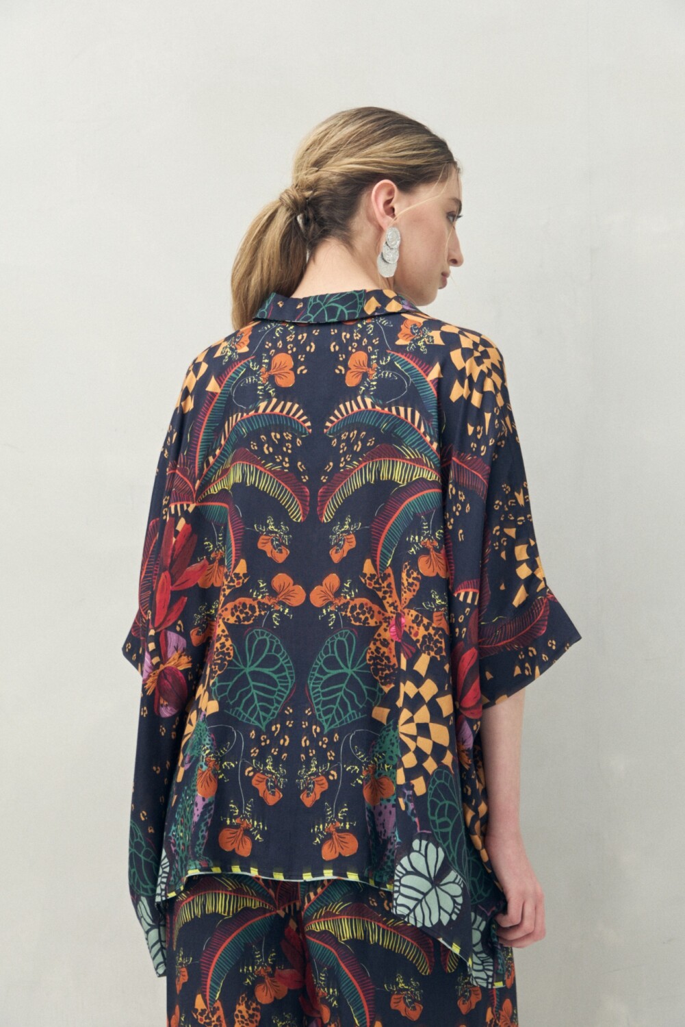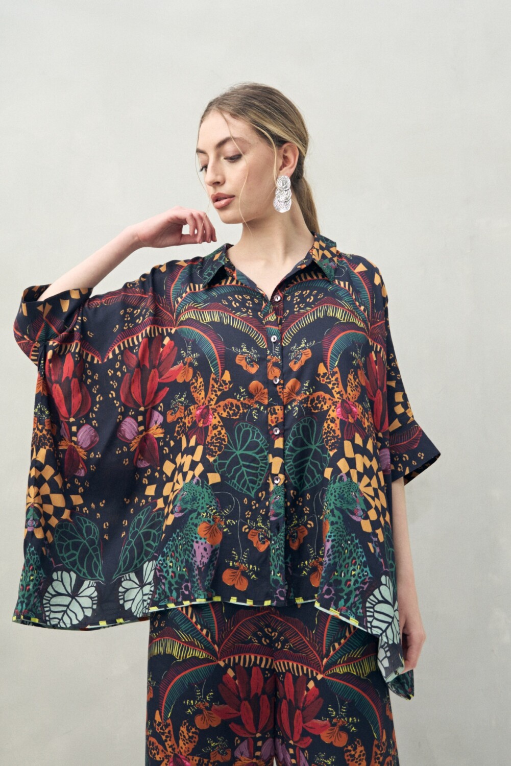 Camisa de manga 3/4 confeccionada en 100% viscosa, con caída fluida y textura suave que aporta movimiento y frescura. Su silueta amplia y diseño estampado de inspiración botánica la convierten en una prenda protagonista, perfecta para lograr un look artístico y relajado.