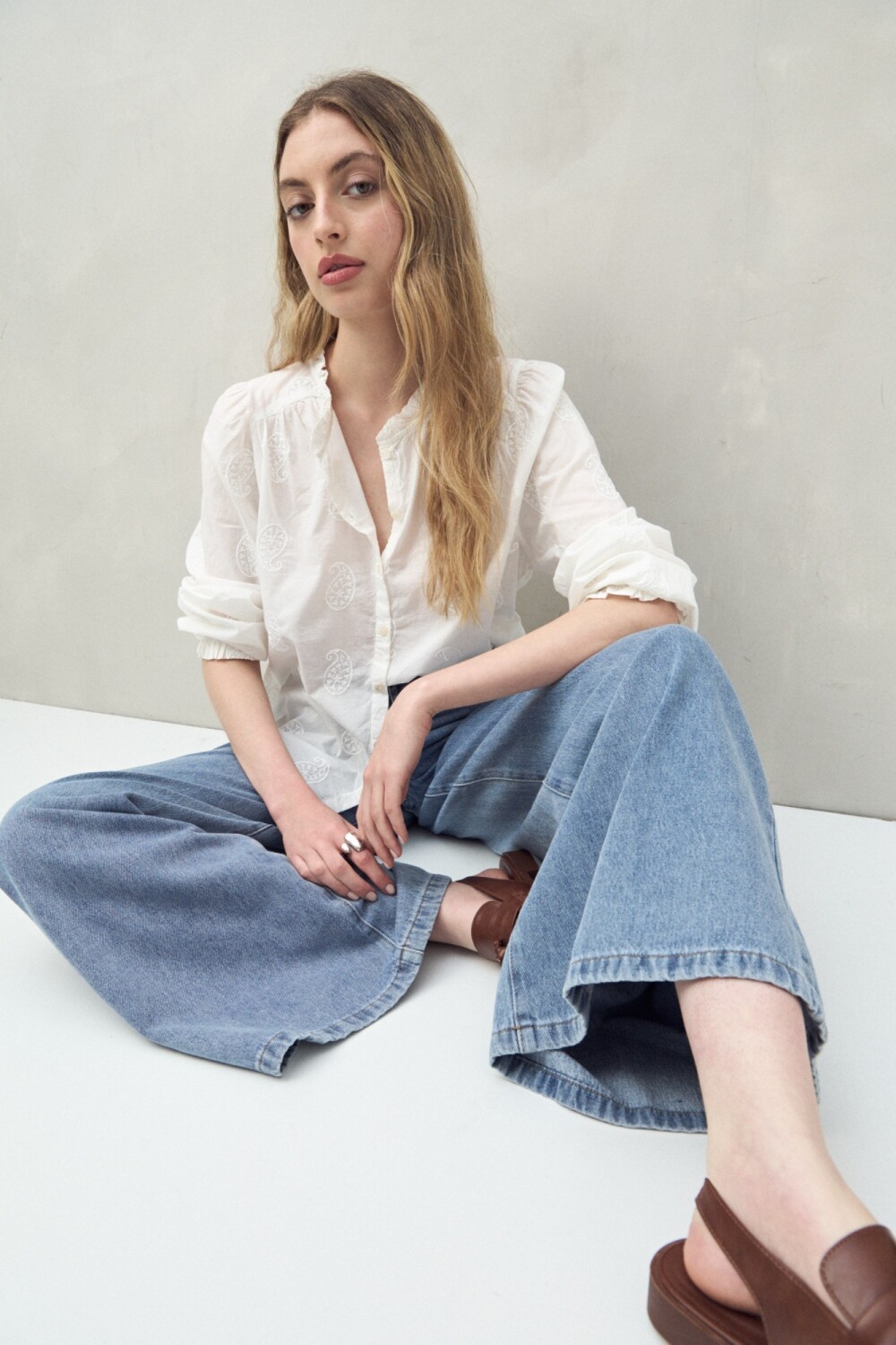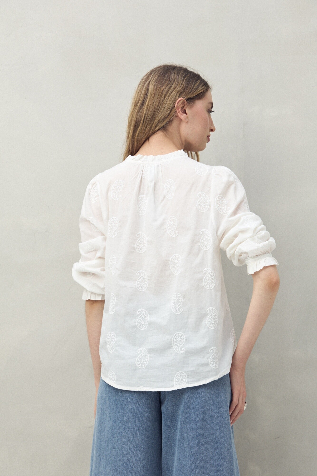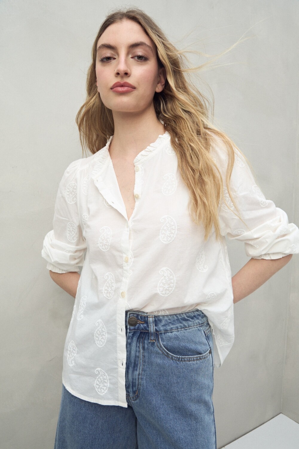 Camisa de manga larga confeccionada en algodón liviano con bordado en relieve de diseño paisley. Su cuello con pequeño volado y la botonadura al frente aportan un aire romántico y natural, ideal para looks relajados con jeans o pantalones amplios.