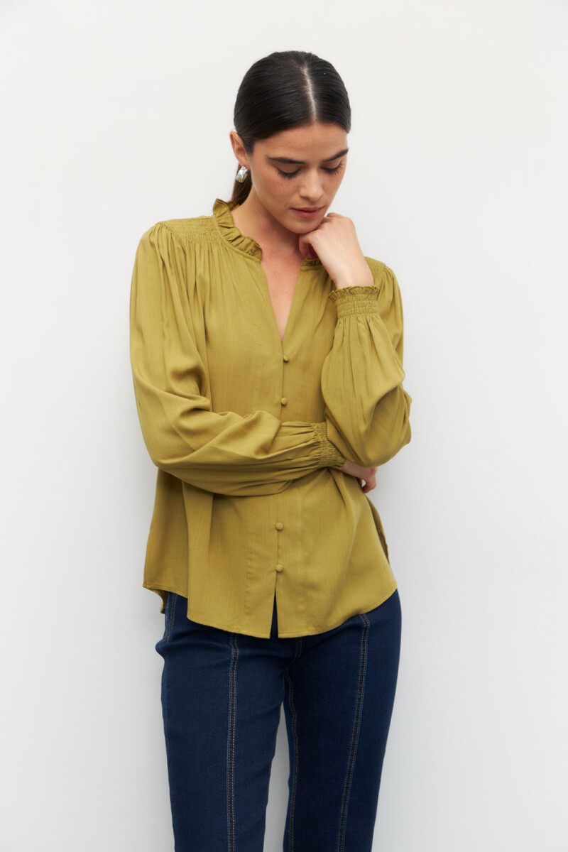 Camisa de manga larga con puños elastizados, cuello mao y escote en v, botones forrados en la misma tela.