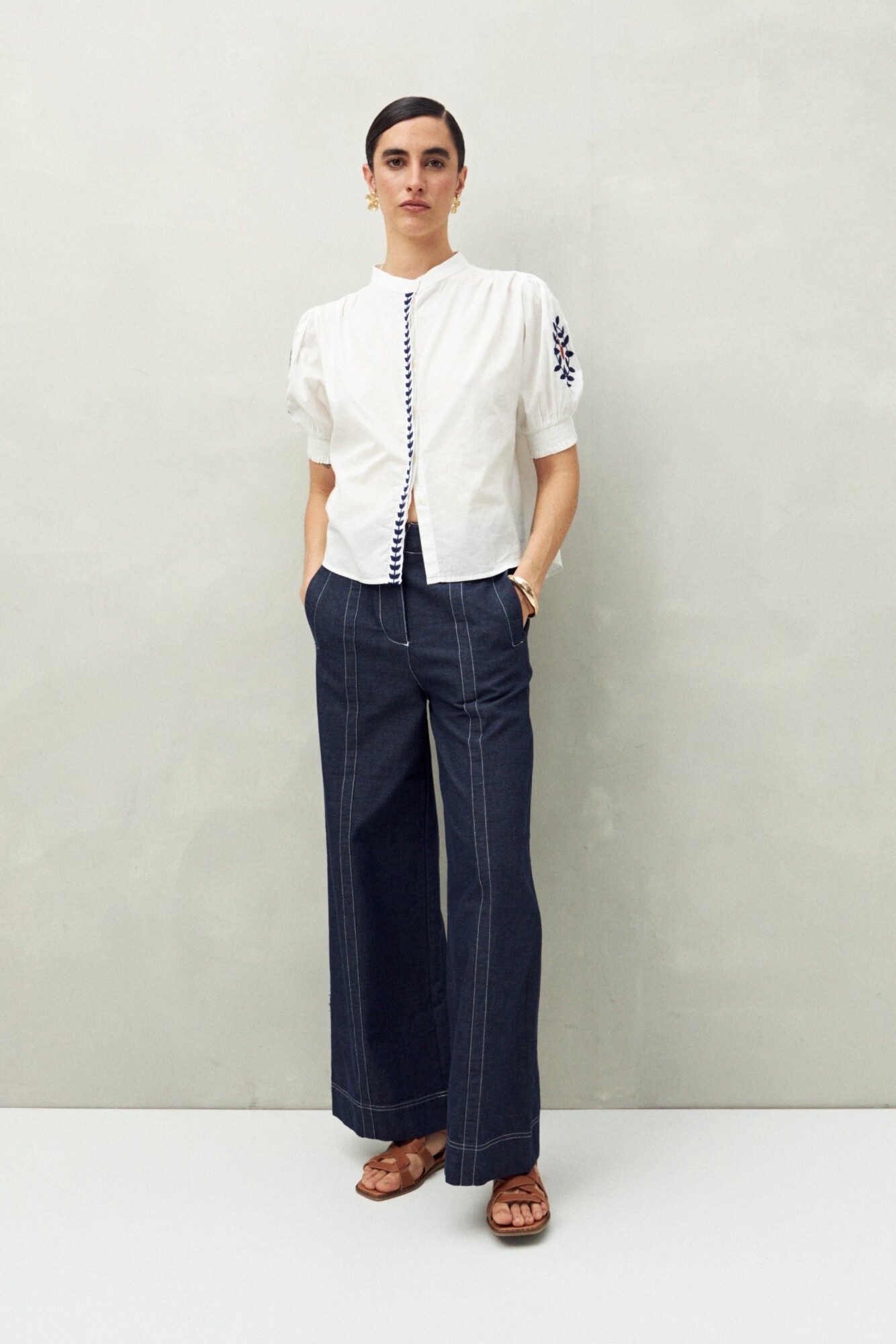 20 Camisa de mangas abullonadas con bordados a contratono que recorren el frente y los hombros, aportando un aire artesanal y femenino. Con cuello mao y puños elastizados, combina detalles delicados con una silueta relajada y contemporánea. Ideal para elevar un look casual con un toque distintivo.