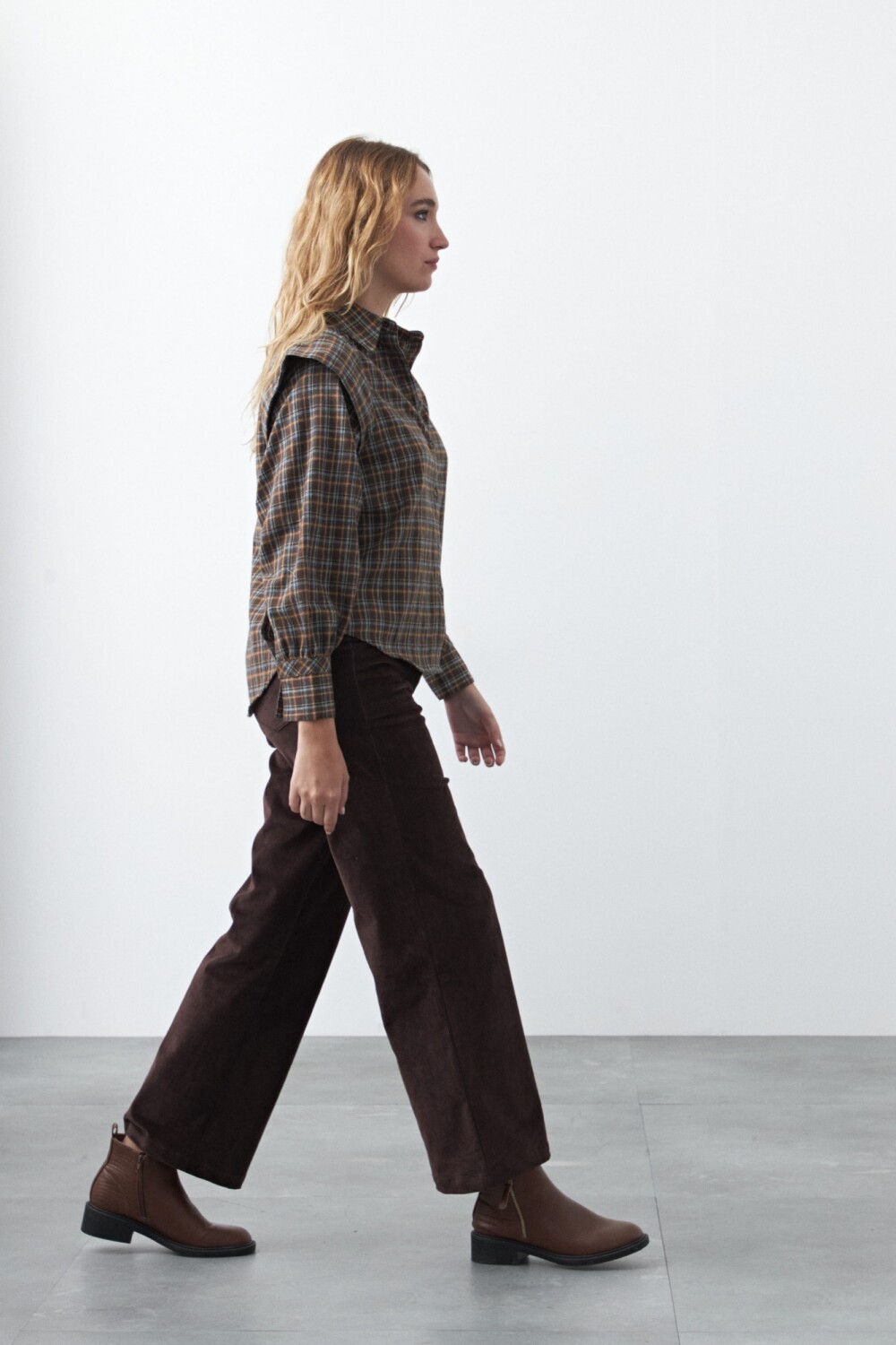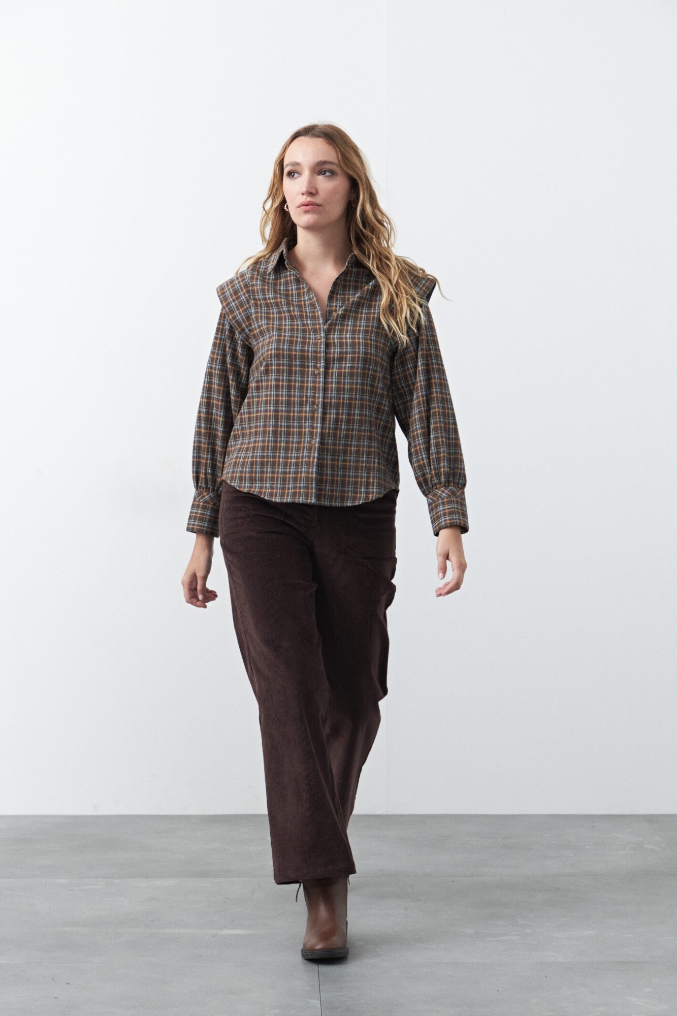 Camisa a cuadros de inspiración clásica con un giro actual. Su diseño incorpora hombros levemente estructurados que aportan presencia y elevan la silueta, mientras que la botonadura frontal mantiene su impronta atemporal. De calce relajado y tejido confortable, es una prenda versátil que se adapta tanto a looks de oficina como a propuestas más casuales.