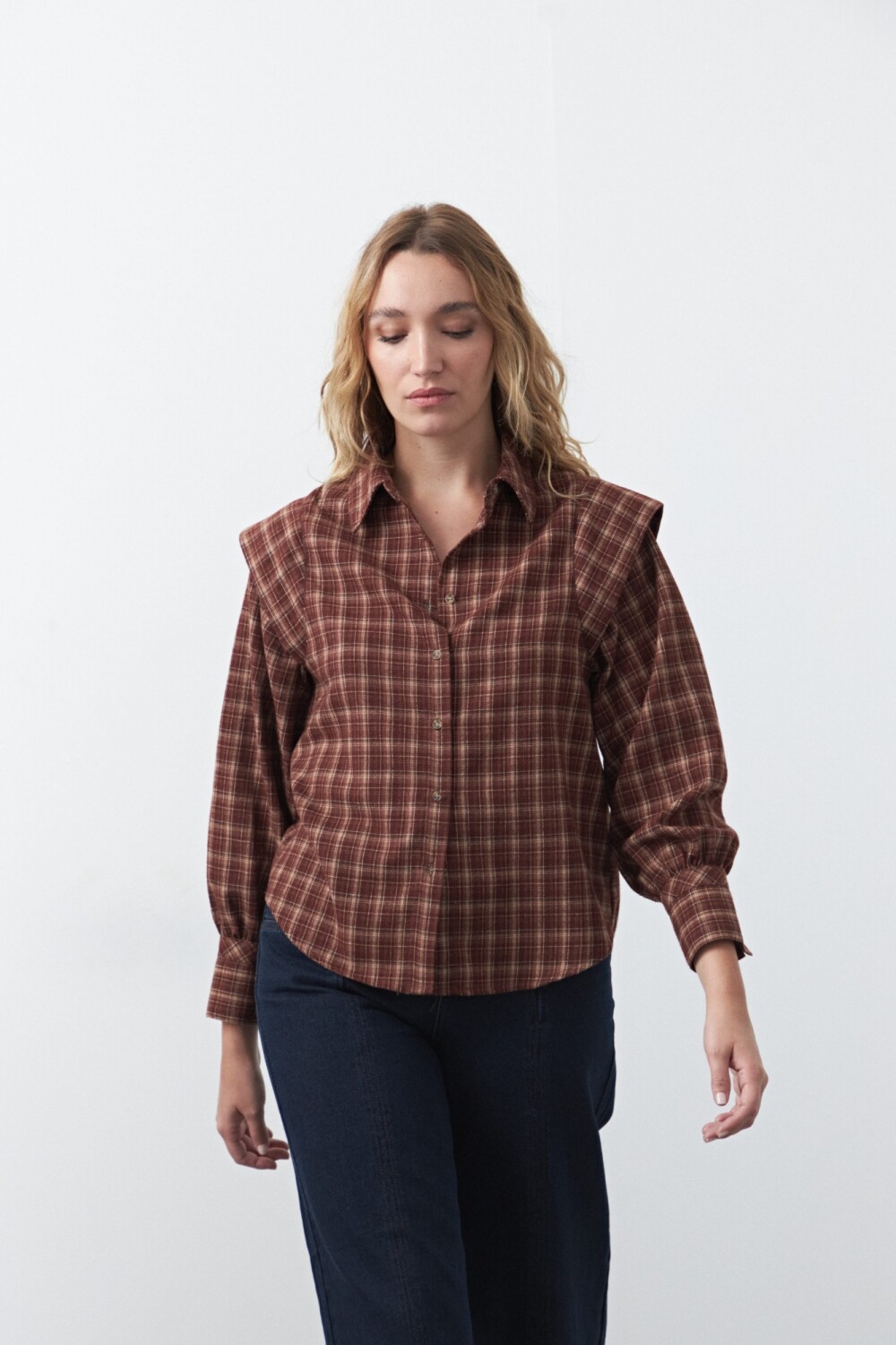Camisa a cuadros de inspiración clásica con un giro actual. Su diseño incorpora hombros levemente estructurados que aportan presencia y elevan la silueta, mientras que la botonadura frontal mantiene su impronta atemporal. De calce relajado y tejido confortable, es una prenda versátil que se adapta tanto a looks de oficina como a propuestas más casuales.