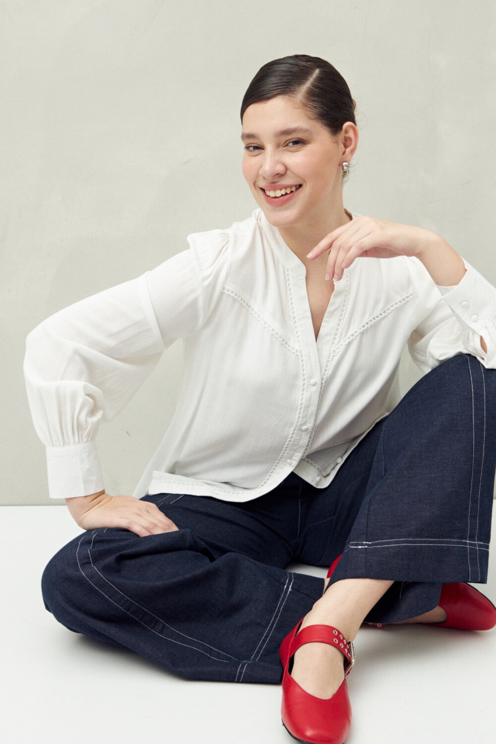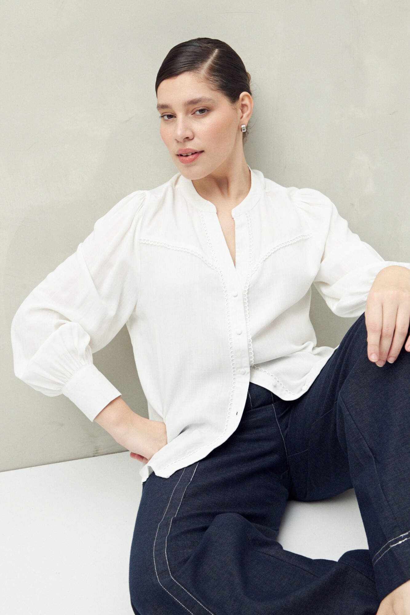 Confeccionada en viscosa de caída suave, esta prenda se distingue por sus delicados detalles de pasamanería que realzan el frente y las mangas. Los botones forrados al tono y el corte fluido la vuelven una opción ideal tanto para looks de oficina como para elevar un outfit casual. Atemporal, versátil y con ese toque artesanal que suma elegancia sin esfuerzo.