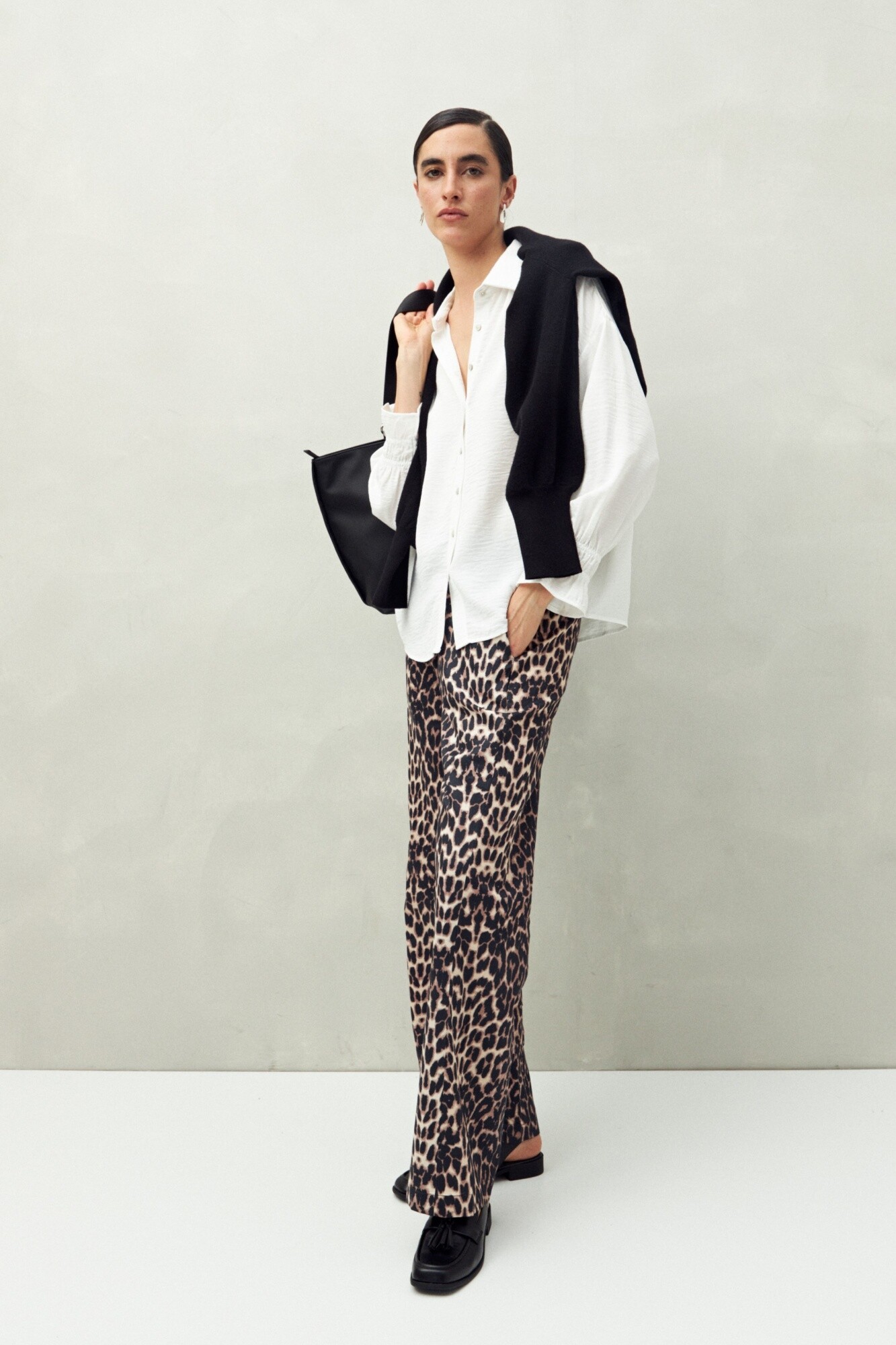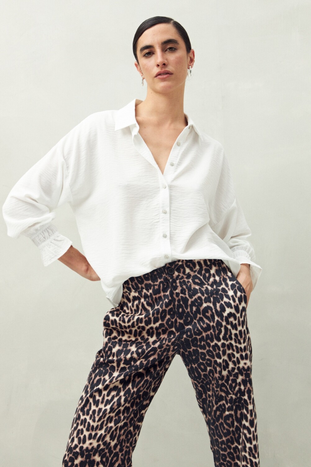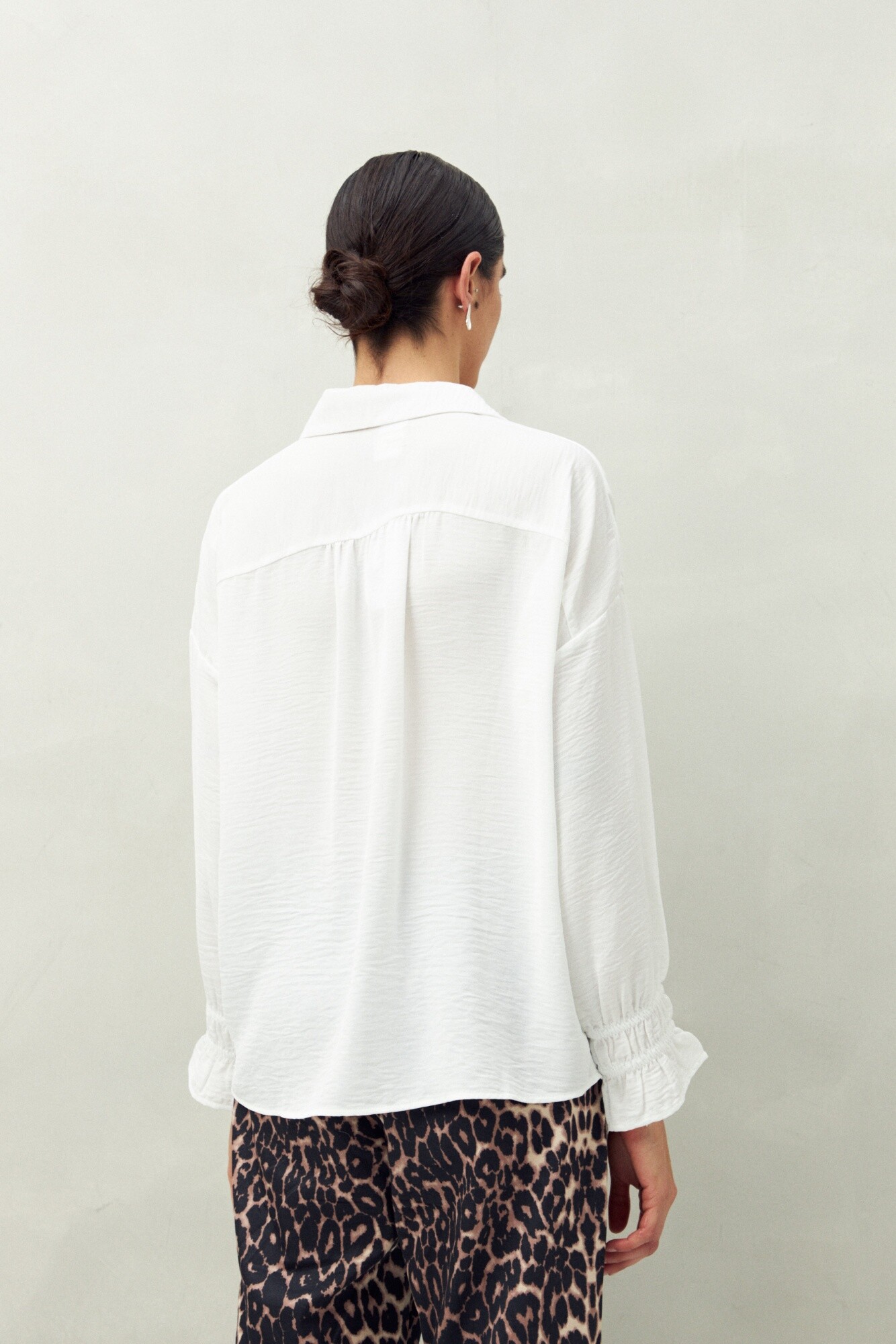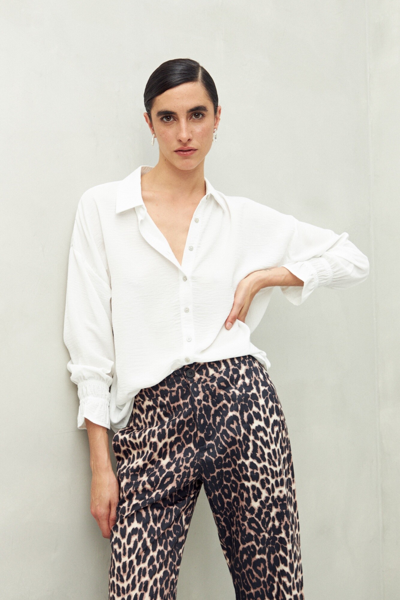 Su tejido liviano y con leve textura la convierte en un aliado de oficina que no pasa desapercibido. El corte relajado y los puños con frunces aportan comodidad y un toque actual, ideal para combinar con pantalones sastreros o denim. Una prenda versátil que fluye entre lo formal y lo casual con total naturalidad.