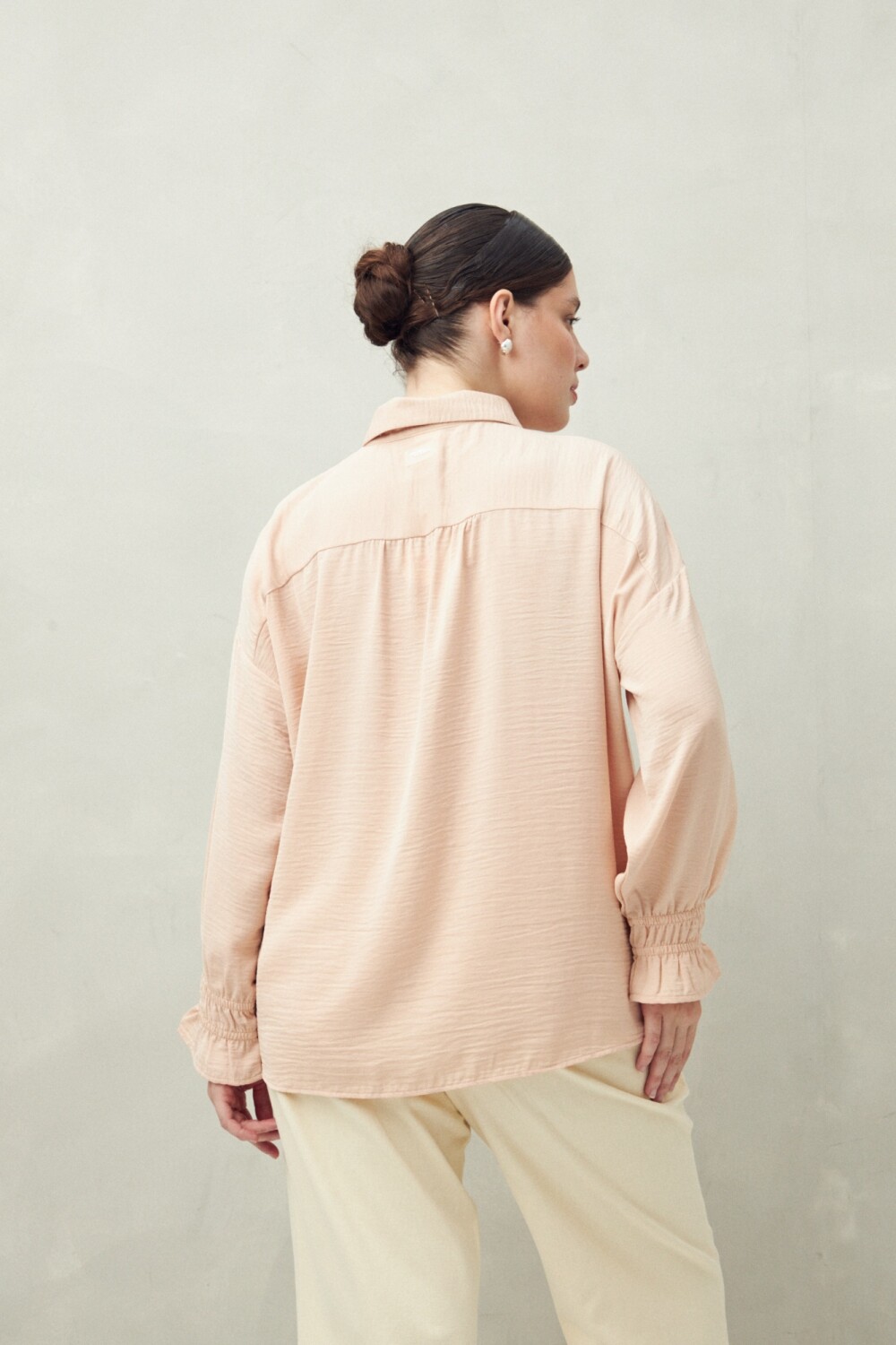 Su tejido liviano y con leve textura la convierte en un aliado de oficina que no pasa desapercibido. El corte relajado y los puños con frunces aportan comodidad y un toque actual, ideal para combinar con pantalones sastreros o denim. Una prenda versátil que fluye entre lo formal y lo casual con total naturalidad.
