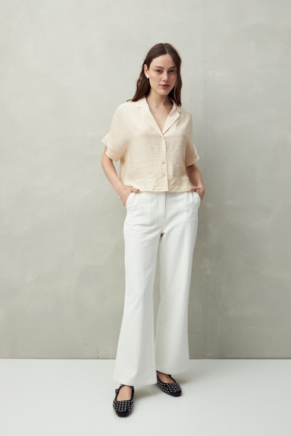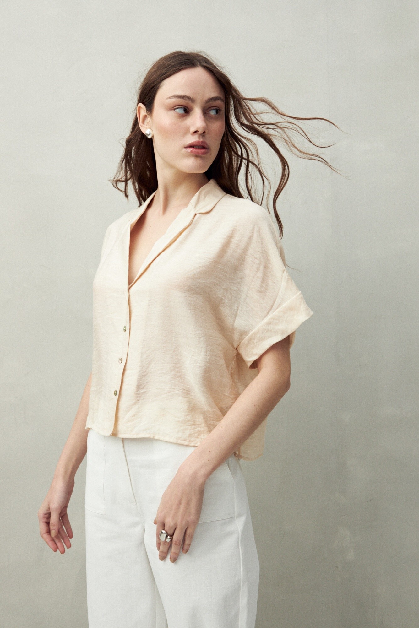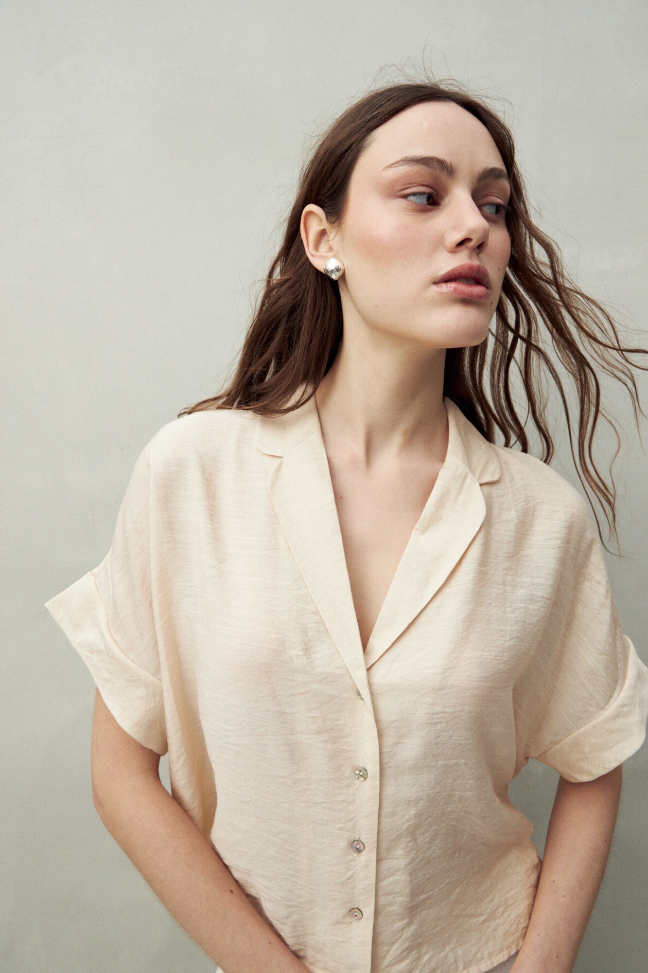 Camisa de manga corta con cuello solapa y botones de nácar al frente, confeccionada en un tejido liviano de sutil textura que aporta movimiento y frescura.