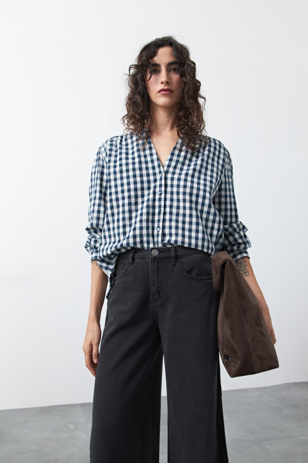El patrón vichy suma personalidad y textura visual, ideal para equilibrar denim, sastrería o incluso prendas más amplias. Las mangas largas con puño y el calce levemente holgado la convierten en una opción versátil para usar por dentro o por fuera, adaptándose a looks de oficina o propuestas más descontracturadas.