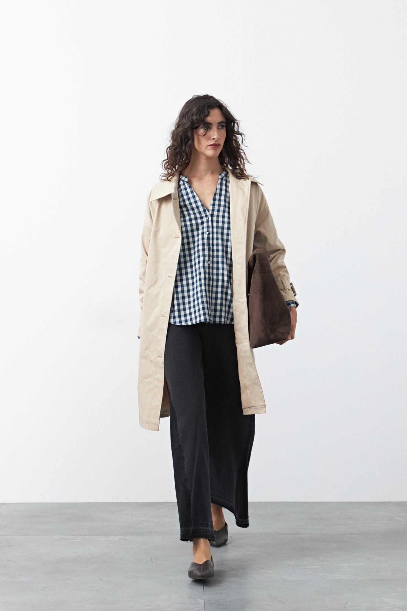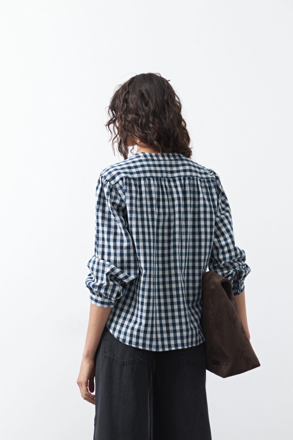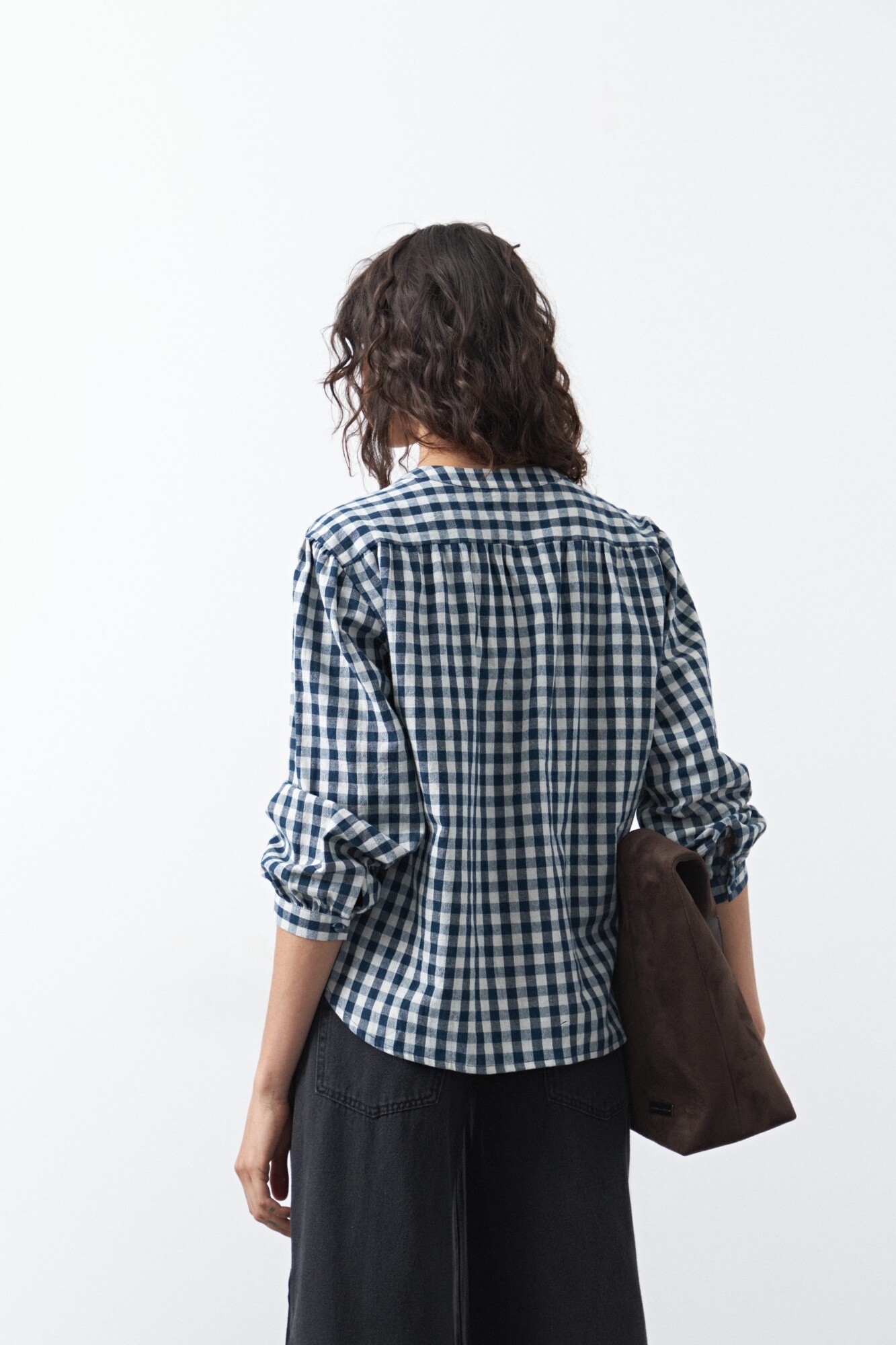 Camisa de algodón a cuadros, un clásico renovado que combina impronta atemporal con un aire relajado y en tendencia. Su escote en V con botones y el leve frunce en hombros y espalda aportan movimiento y una silueta femenina sin perder comodidad.