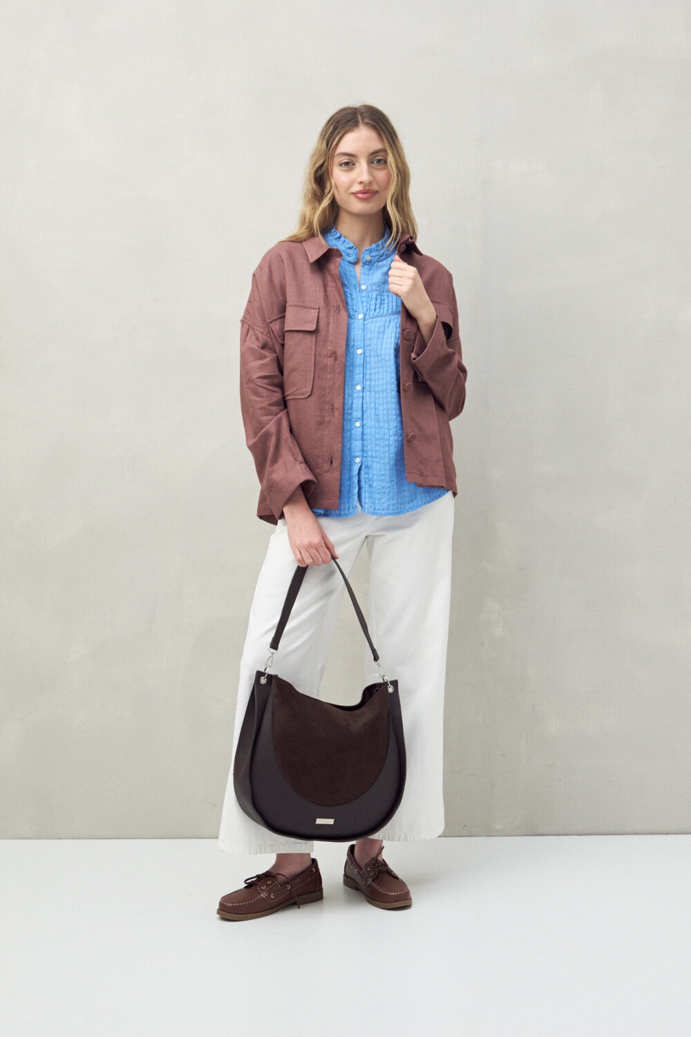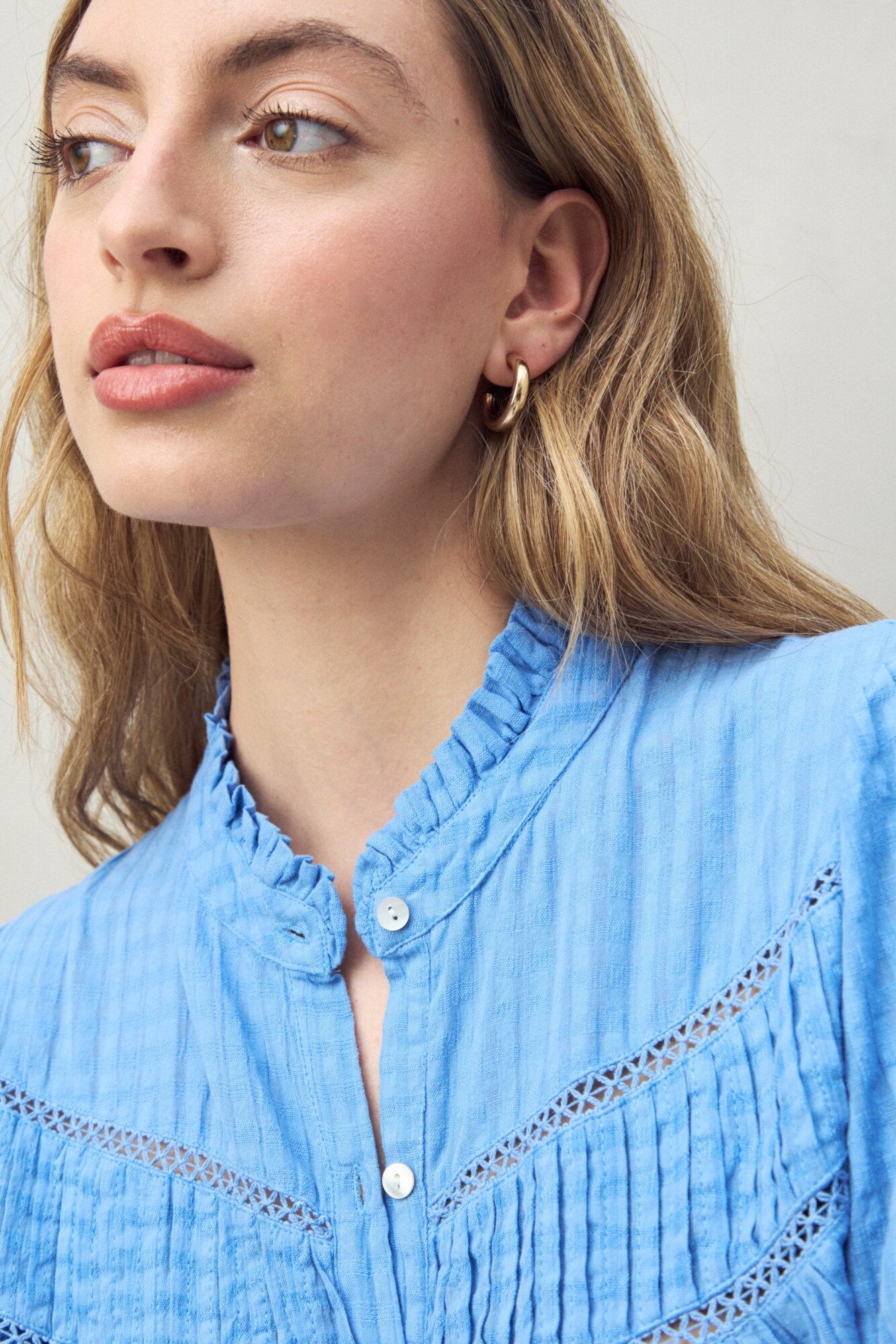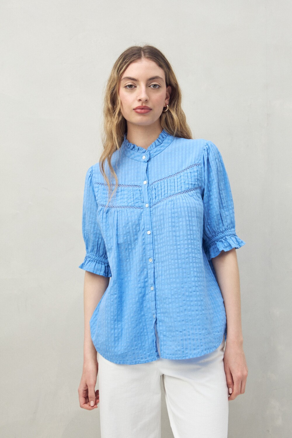 Una prenda que redefine lo romántico con un aire moderno. Esta camisa está confeccionada en gasa de algodón con textura cuadrillé, y presenta delicadas inserciones de encaje lineal que recorren el frente, generando un sutil juego de transparencias. Su cuello con pequeños volados y mangas abullonadas con puño elástico aportan un encanto femenino y fresco, ideal para los días cálidos.