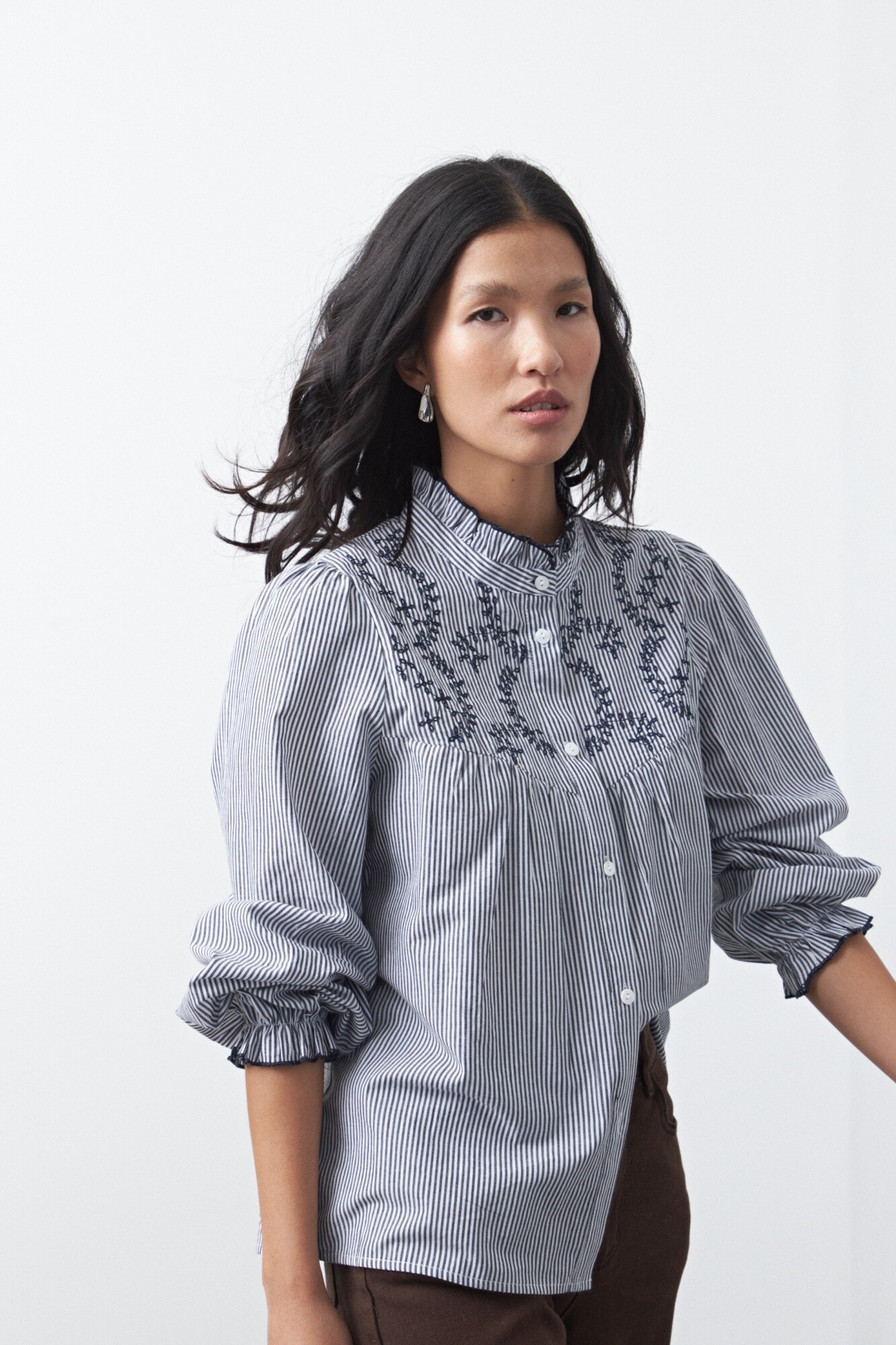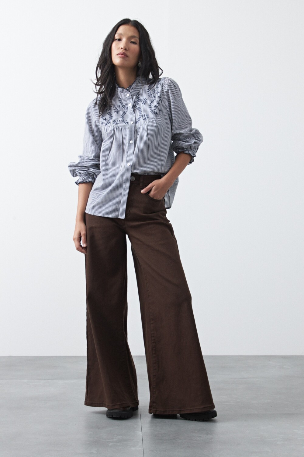 20 Camisa de manga larga bordada con inspiración romántica, una prenda que combina delicadeza y carácter en un diseño atemporal. El frente presenta bordado ornamental sobre base a rayas finas, generando un contraste sutil que aporta textura y profundidad visual.