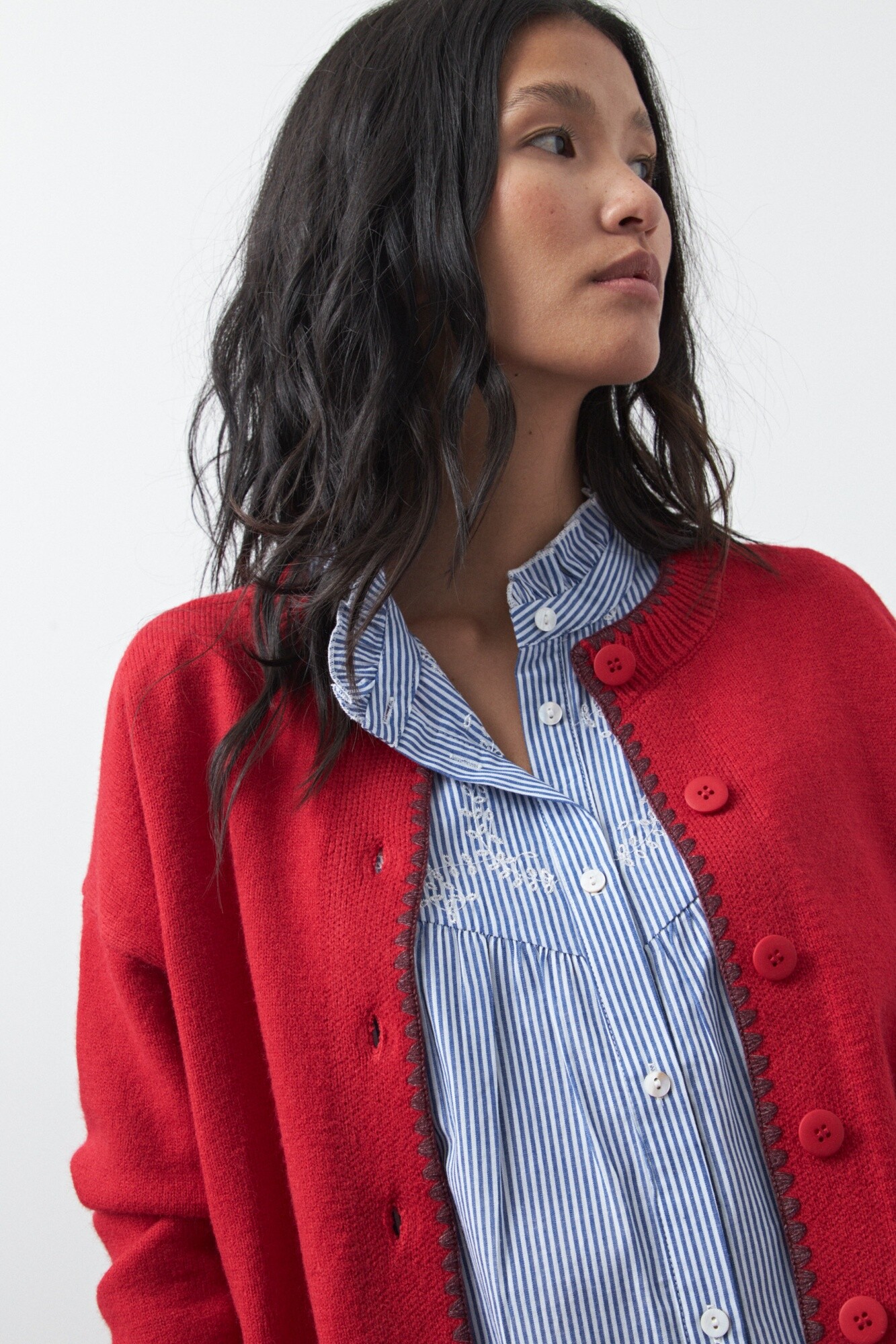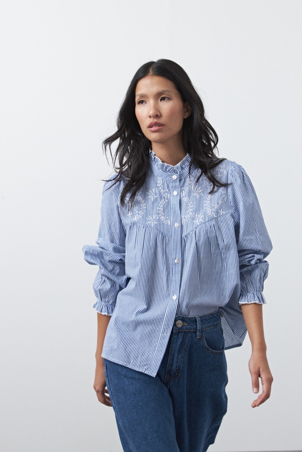 Camisa de manga larga bordada con inspiración romántica, una prenda que combina delicadeza y carácter en un diseño atemporal. El frente presenta bordado ornamental sobre base a rayas finas, generando un contraste sutil que aporta textura y profundidad visual.