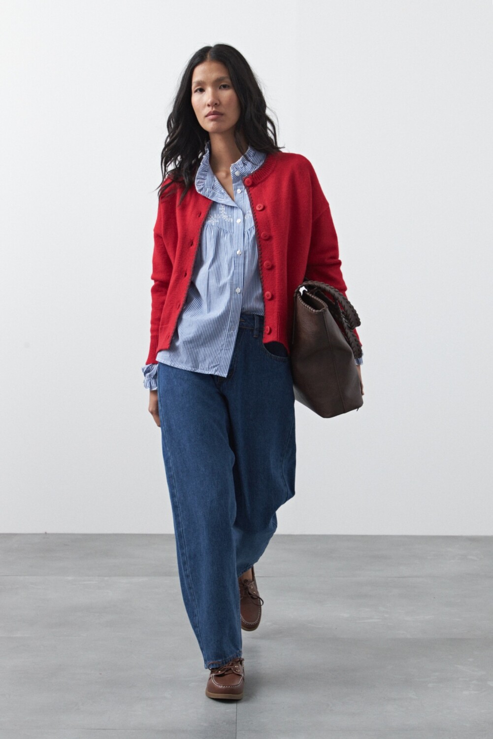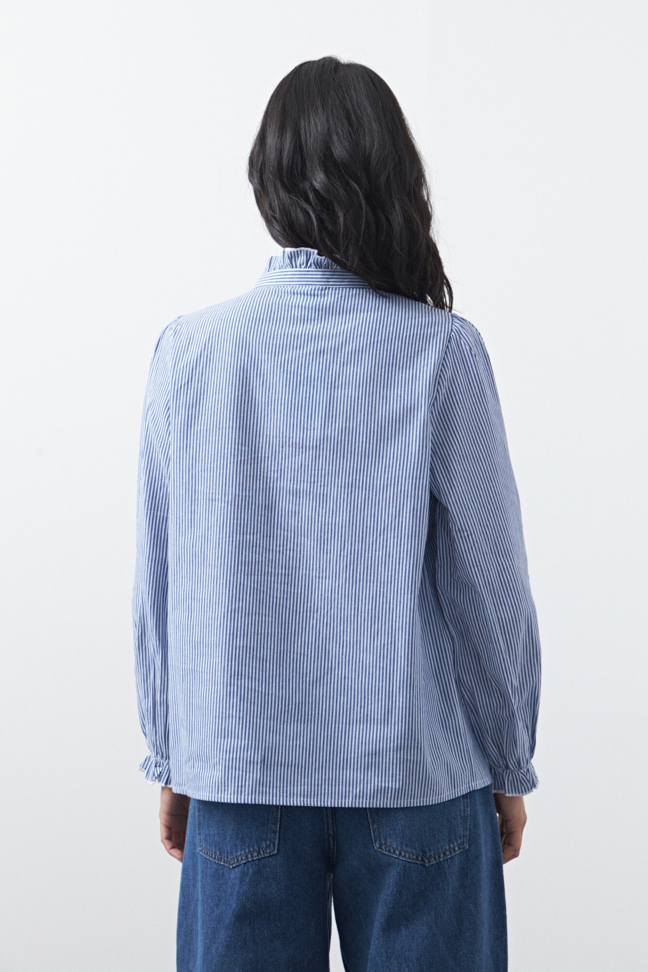 El cuello alto con leve volado y terminación bordada enmarca el rostro con un detalle femenino, mientras que los frunces en el delantero aportan caída y movimiento. Las mangas largas finalizan en puños elastizados con pequeño volado, reforzando su impronta artesanal y en tendencia.