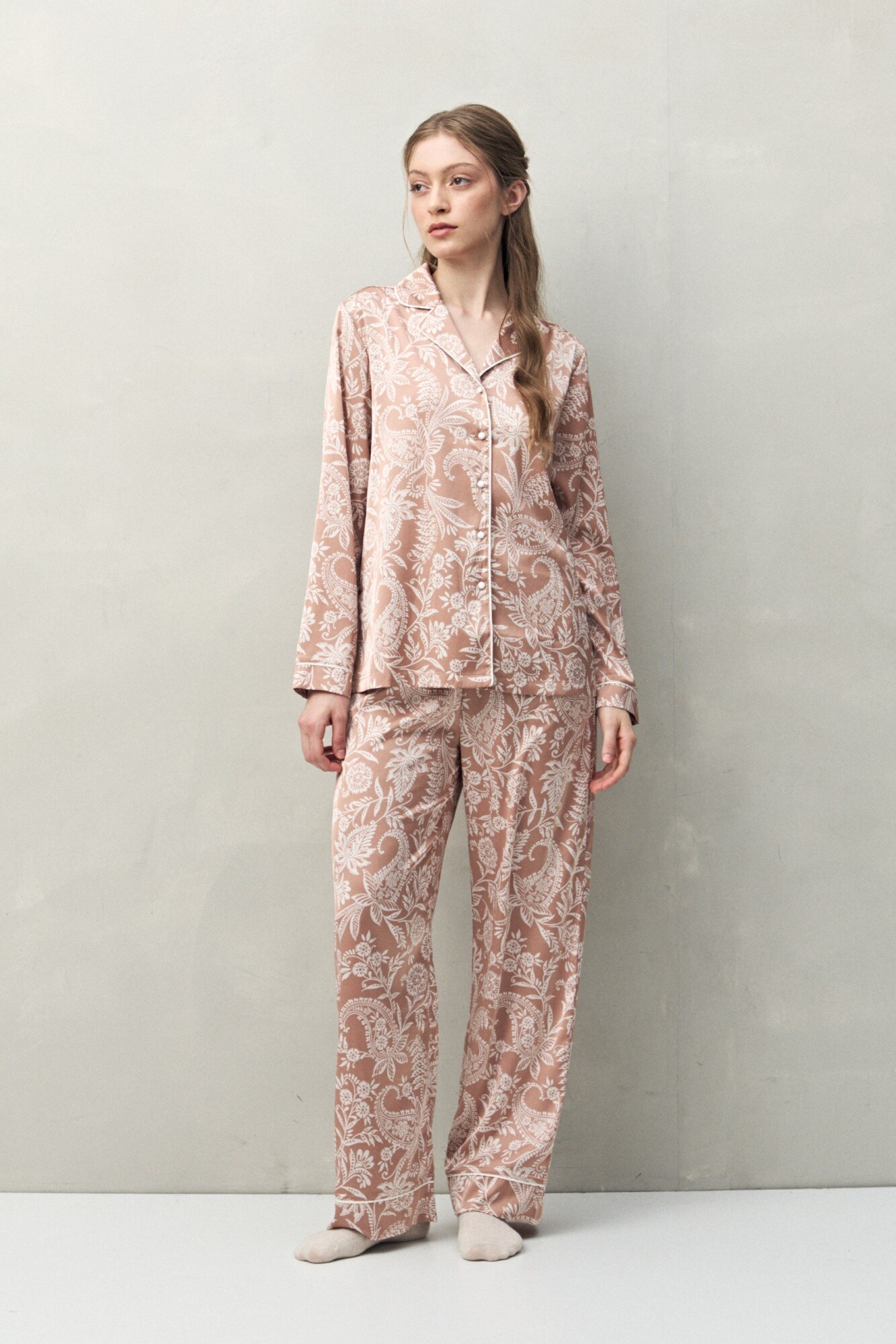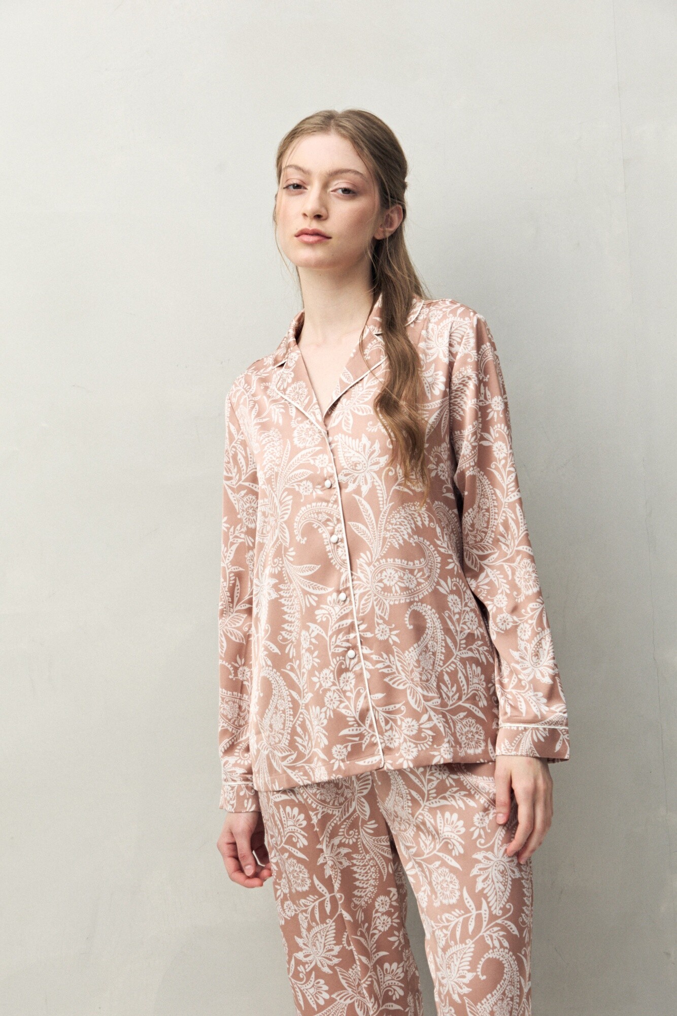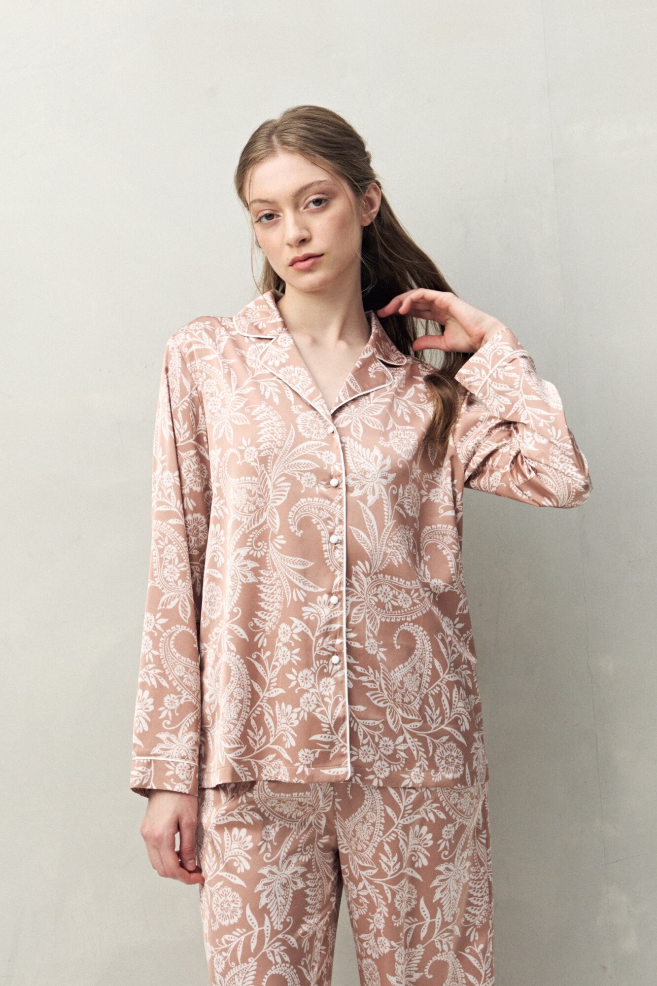 Camisa de pijama de silueta relajada, pensada para combinar comodidad y estética en partes iguales. El diseño se destaca por su estampa integral de inspiración orgánica, que aporta un aire sofisticado incluso en looks de descanso. Cuenta con cuello camisero, cartera frontal con botones y delicados vivos en contraste que enmarcan la prenda y elevan el acabado, logrando ese efecto pijama clásico con impronta moderna. La tela tiene un tacto suave y liviano, con una leve elasticidad que acompaña el movimiento y suma confort durante todo el uso.