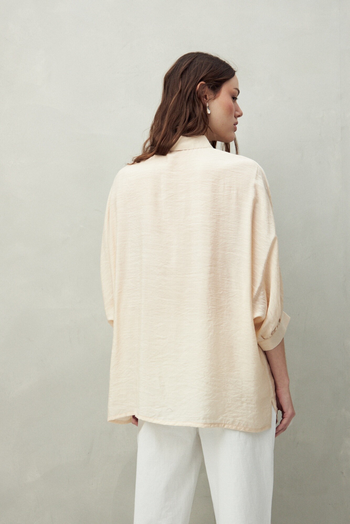 Camisa fluida de calce relajado con cuello clásico y mangas amplias tres cuartos.
