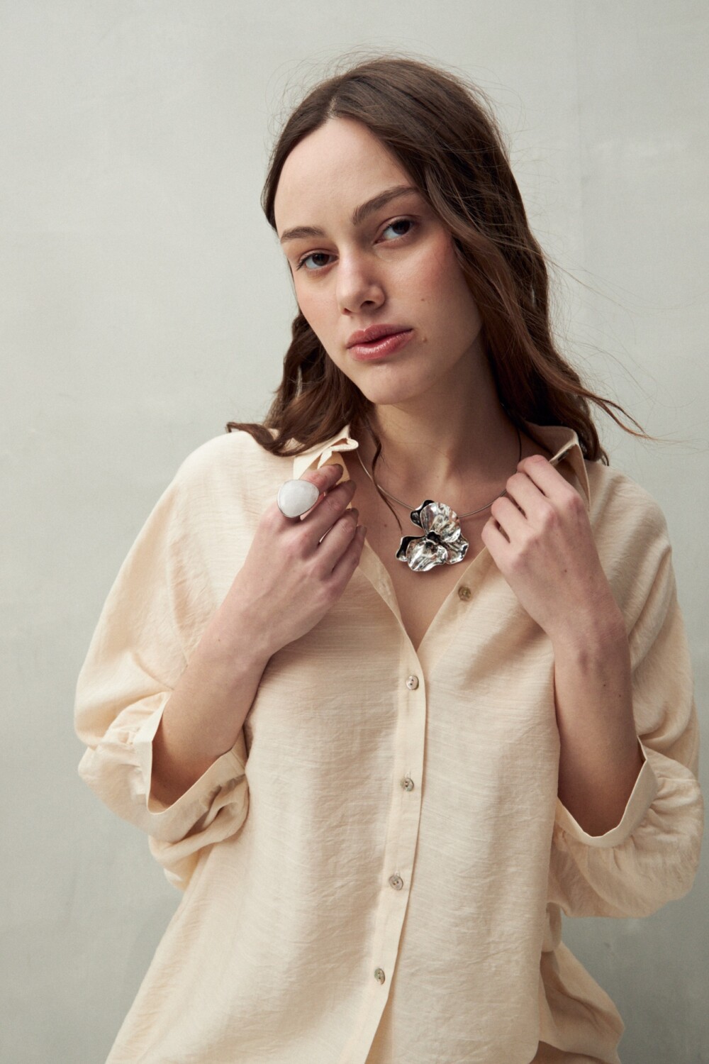Su textura suave y caída natural realzan el movimiento de la prenda, mientras que los botones nacarados aportan un acabado delicado. Un básico atemporal que se adapta tanto a looks casuales como más pulidos.