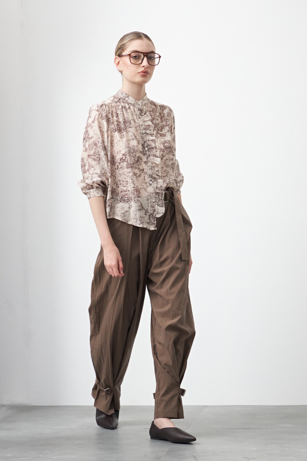 Camisa de estampa romántica de inspiración barroca, con un diseño delicado que combina motivos ornamentales y un aire clásico actualizado. De cuello con delicados bolados y botones anacarados. Las mangas largas con puño suavemente ajustado acompañan la silueta sin rigidez, logrando un equilibrio entre estructura y fluidez. Ideal para sumar un toque sofisticado tanto a looks de día como a propuestas más formales.