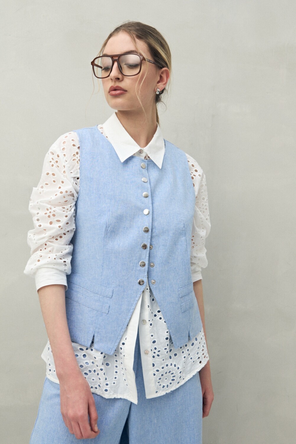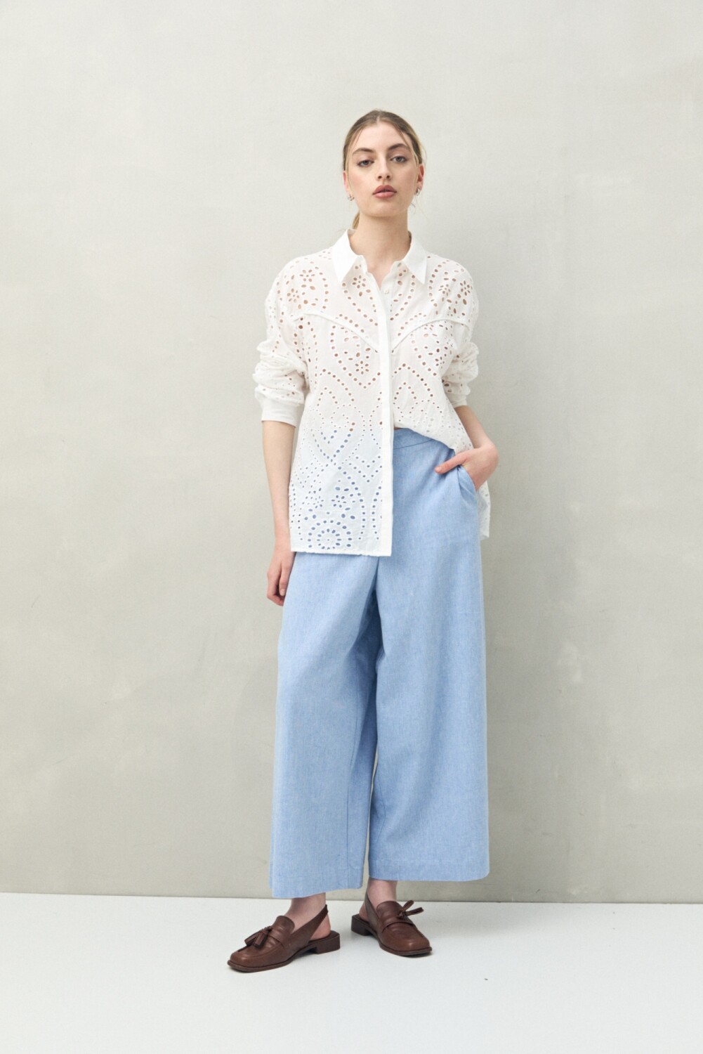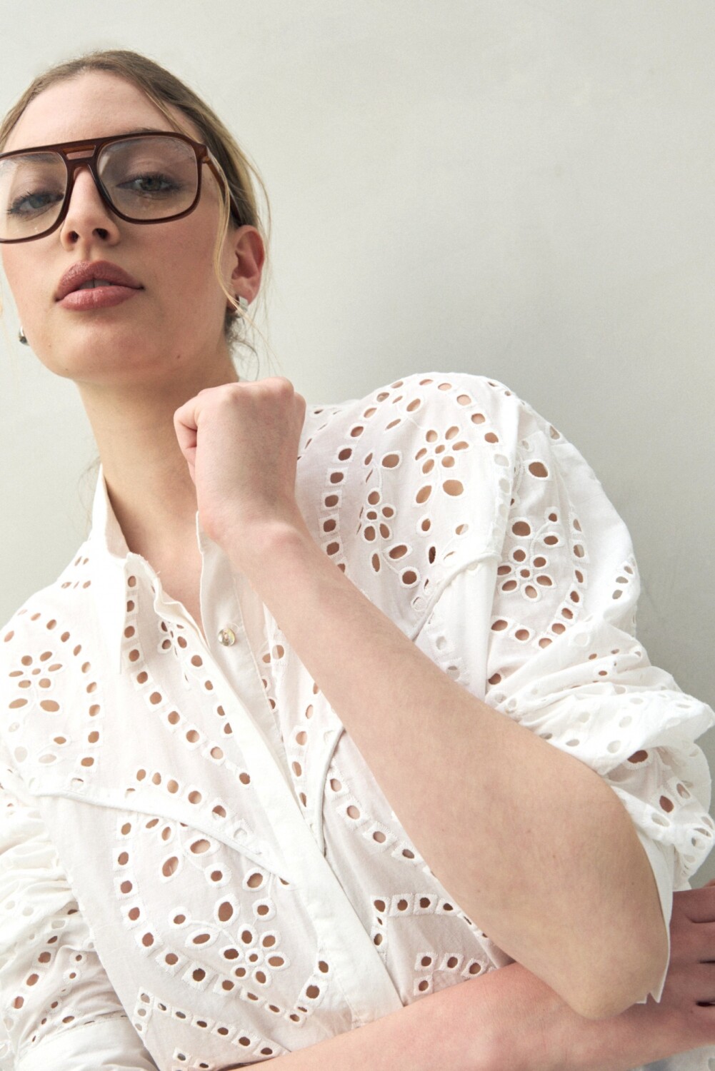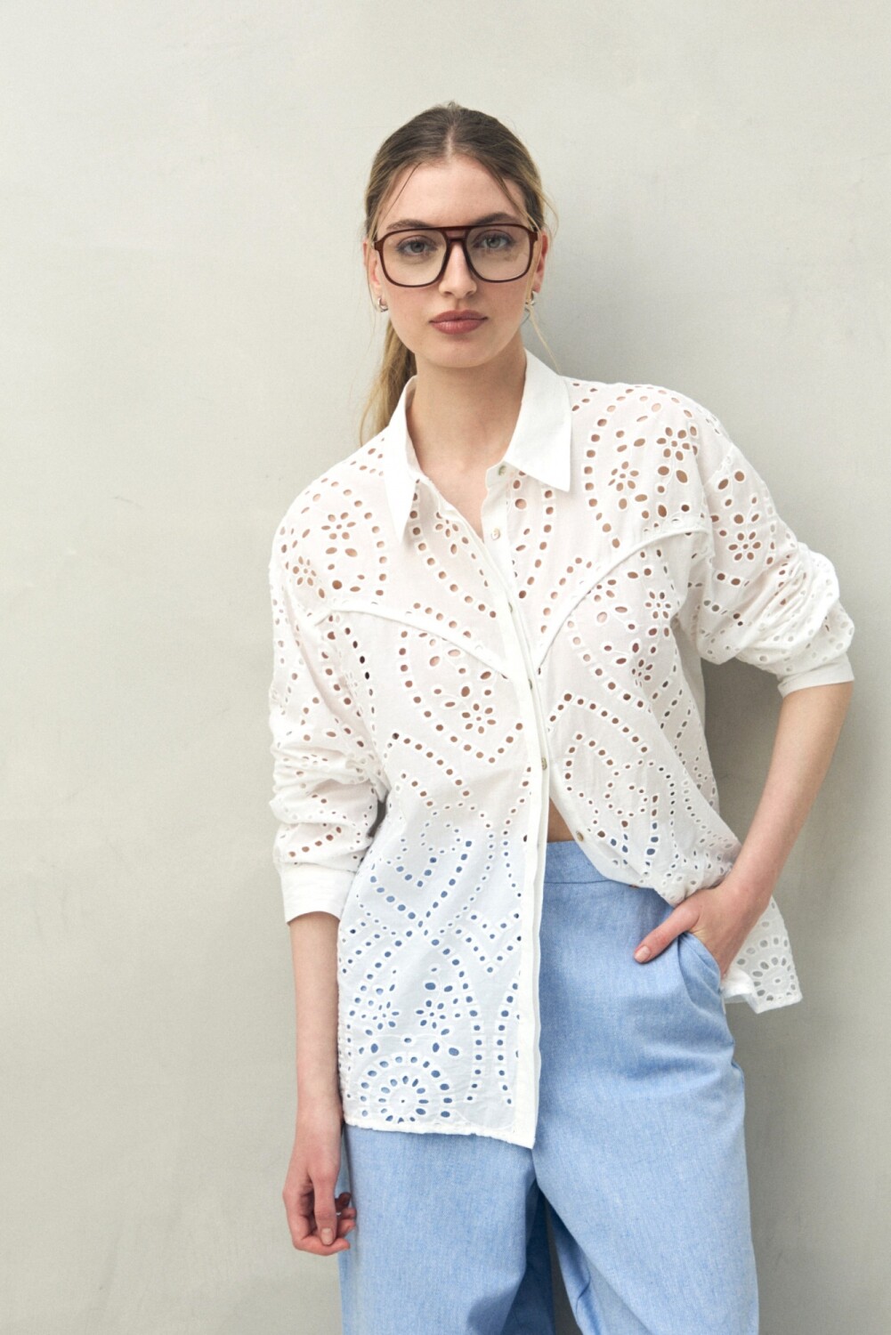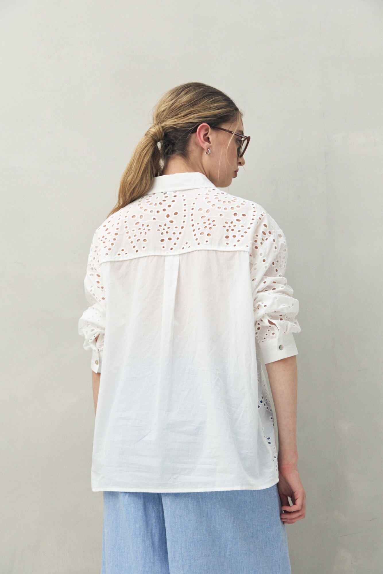 Camisa de manga larga con trabajo de broderie que aporta textura y un aire artesanal. Presenta cuello clásico, recortes que enmarcan la silueta y botones al frente. Una prenda femenina y versátil, ideal para elevar conjuntos de día con un toque distintivo.