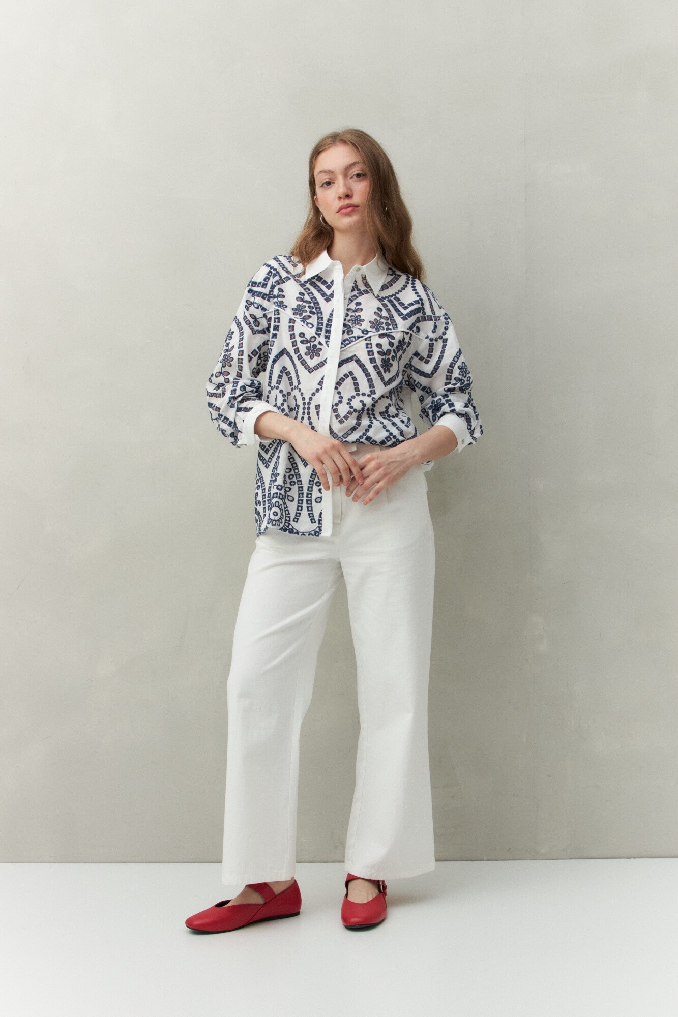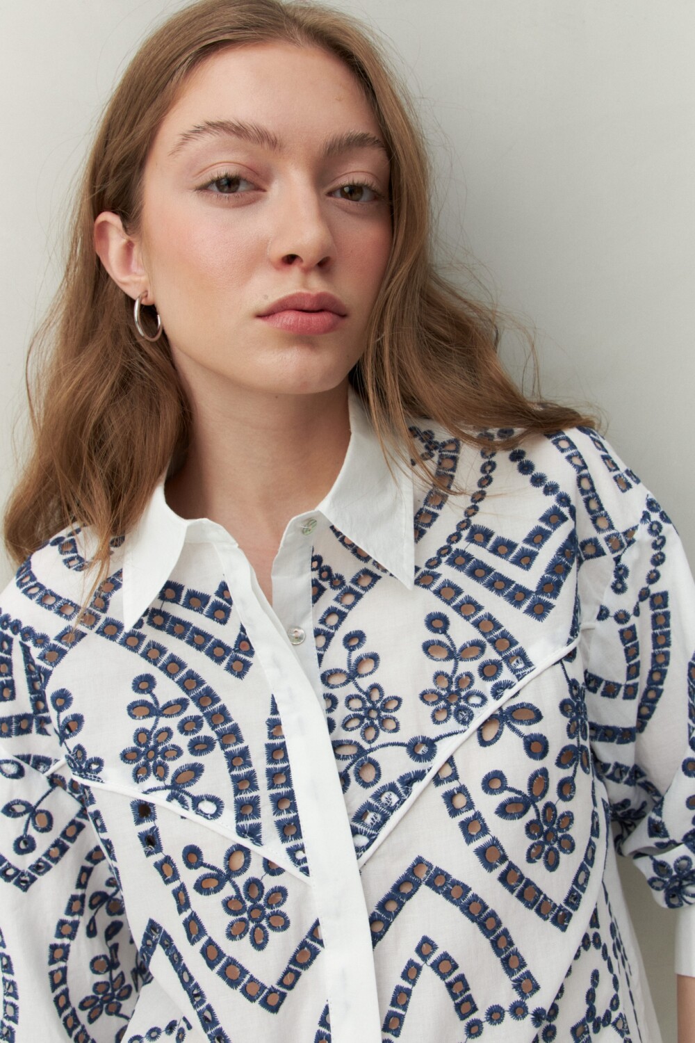 Camisa de manga larga con trabajo de broderie que aporta textura y un aire artesanal. Presenta cuello clásico, recortes que enmarcan la silueta y botones al frente. Una prenda femenina y versátil, ideal para elevar conjuntos de día con un toque distintivo.