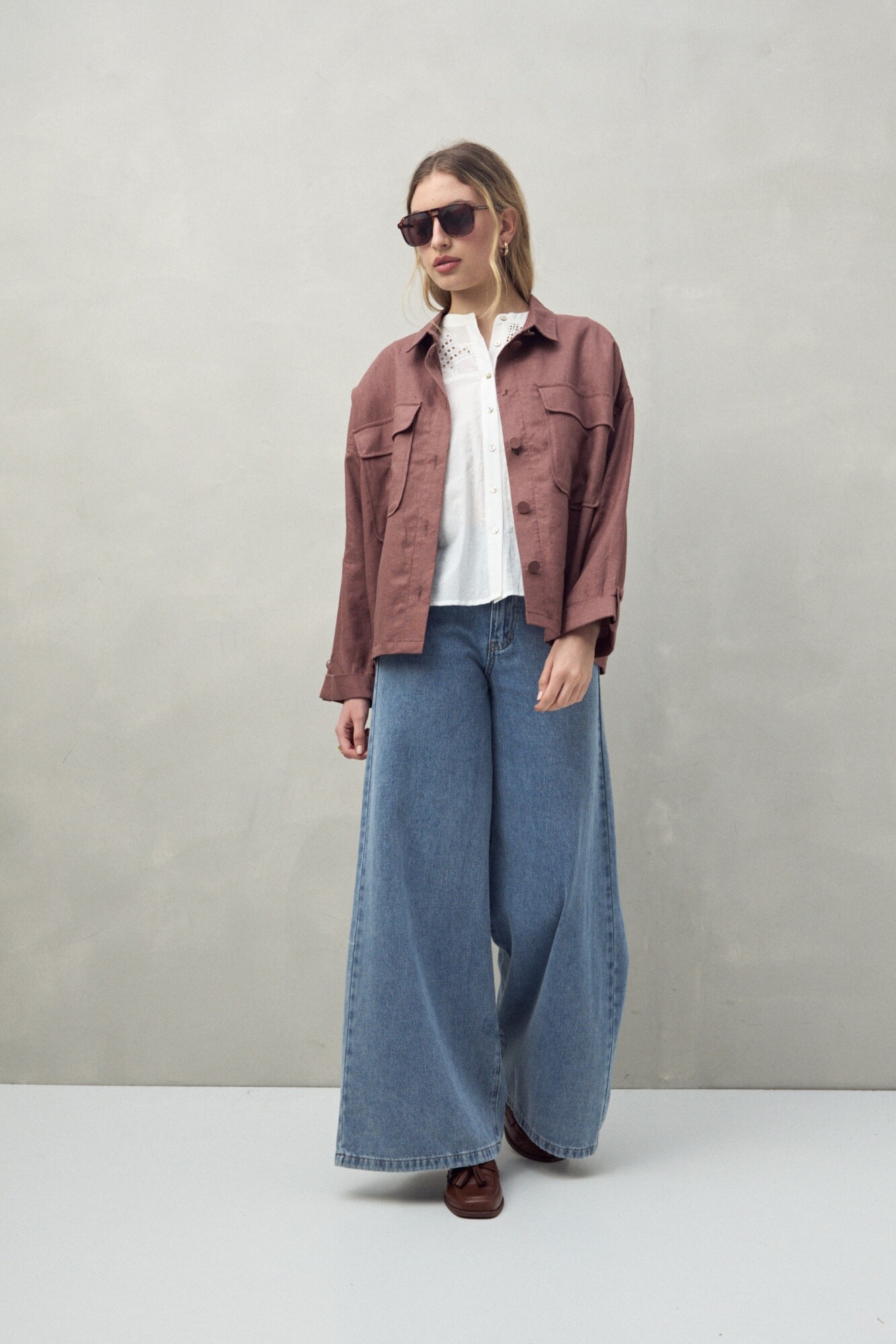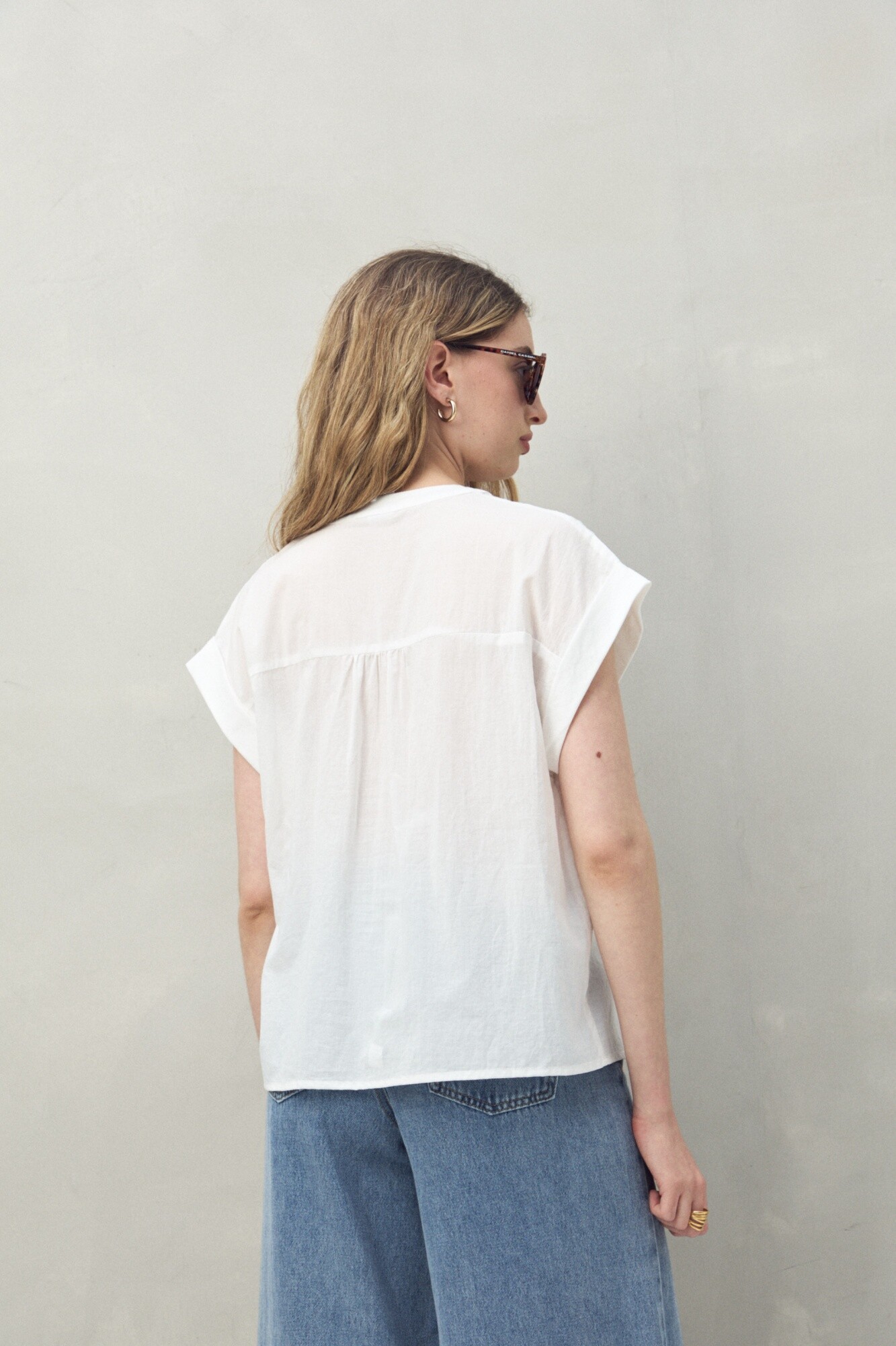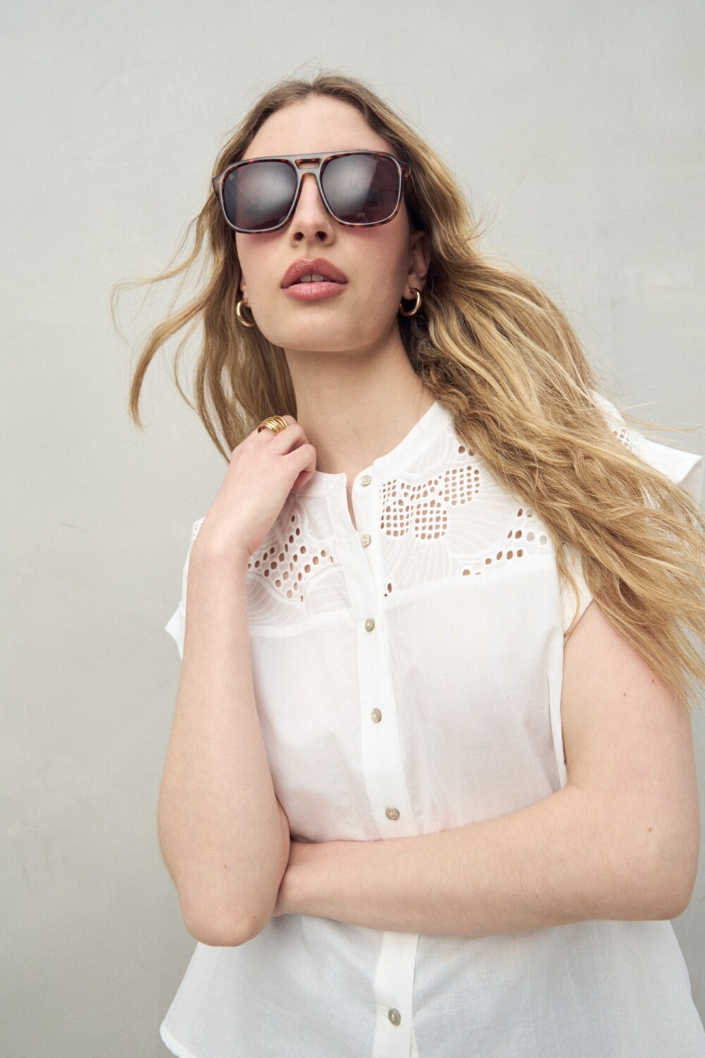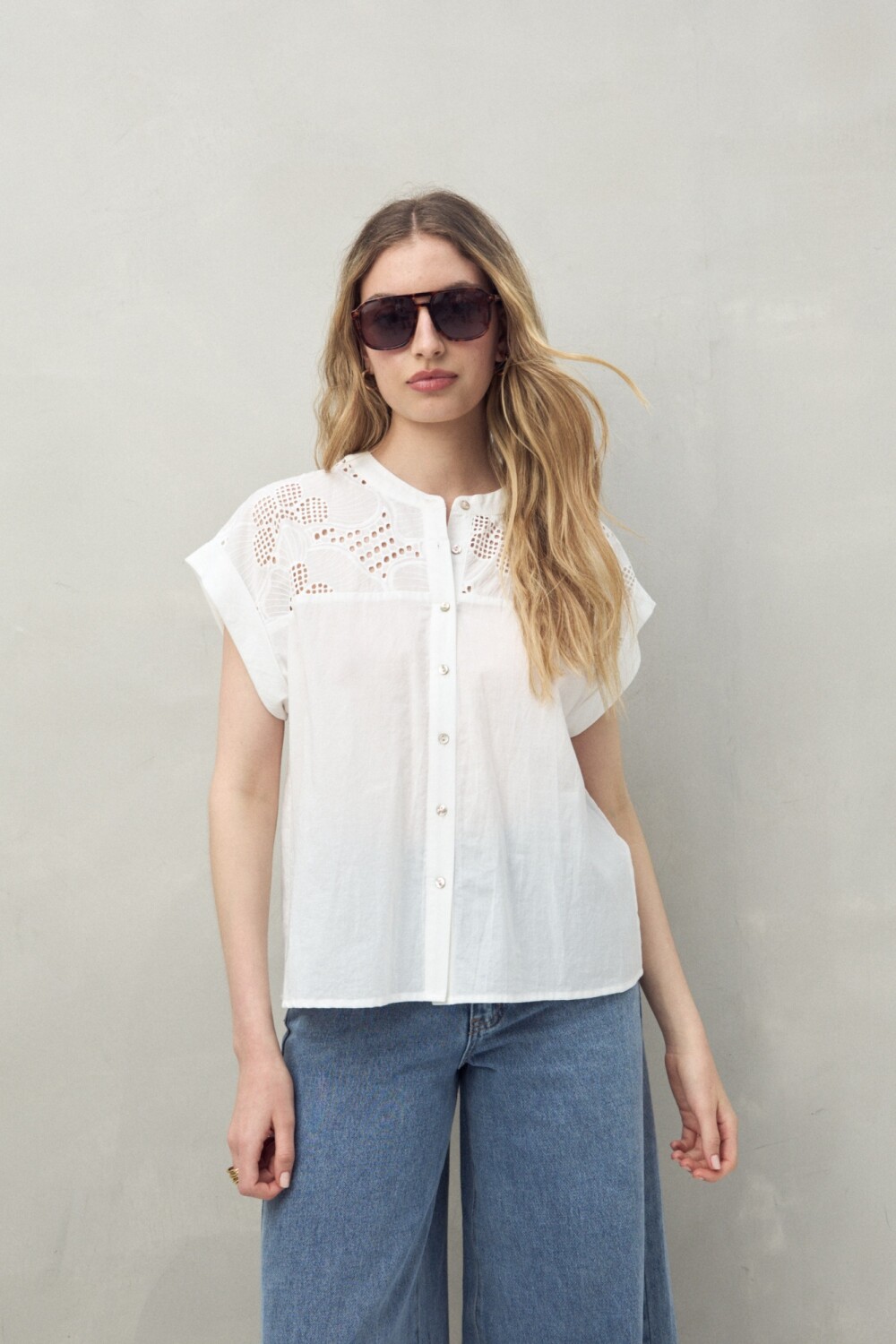 Camisa sin mangas confeccionada en 100% algodón, con delicados calados y bordados que aportan textura y un aire artesanal. Su cuello mao y abotonadura central le dan un toque moderno y versátil, ideal para combinar con jeans o pantalones amplios. Una prenda fresca y femenina, clave para elevar cualquier look de verano.