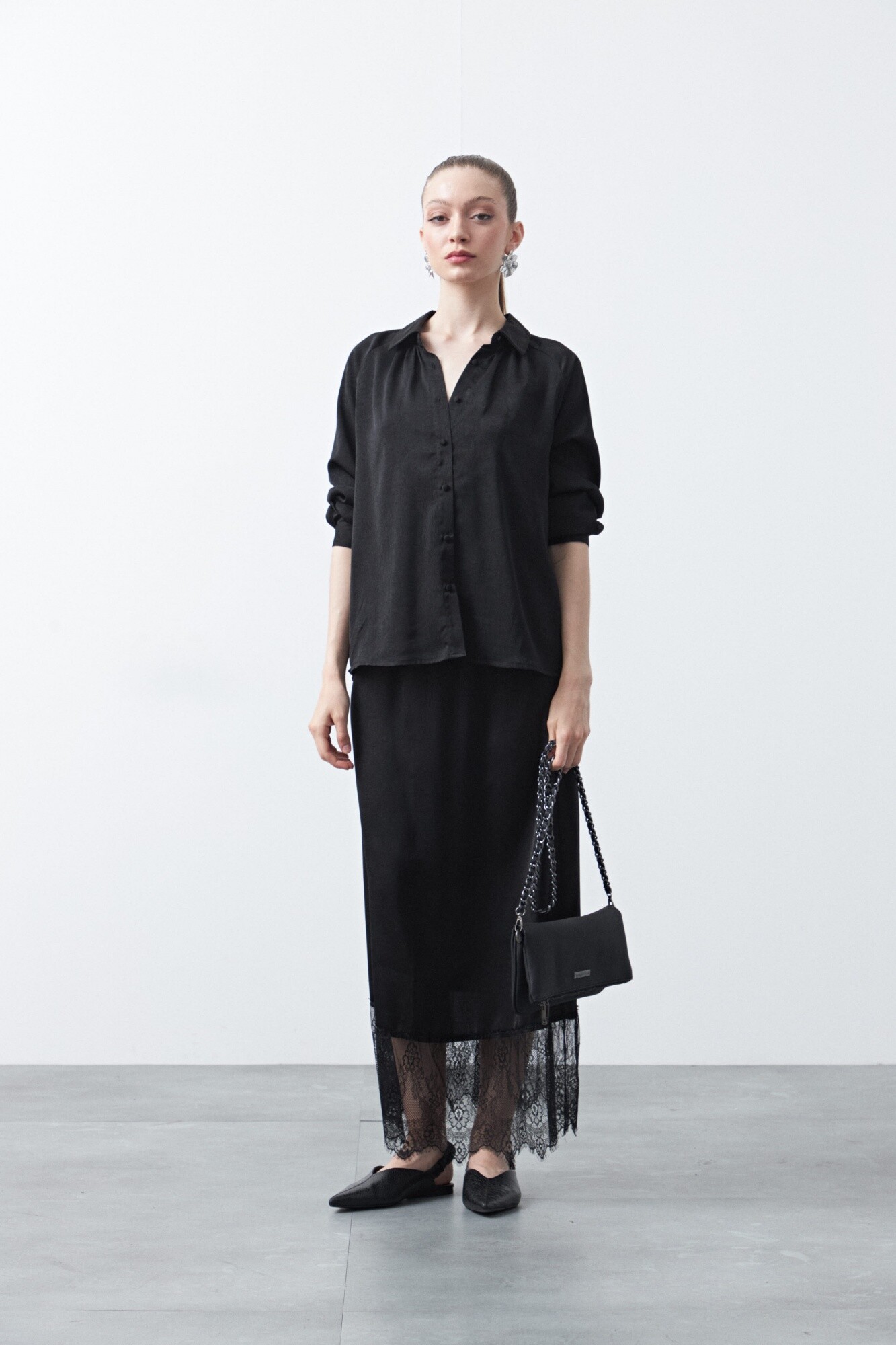 Camisa de caída fluida con escote en V suave y botonadura frontal forrada que aporta una terminación delicada. El diseño de líneas limpias se equilibra con una silueta relajada, ideal para estilizar el torso sin marcar. Una opción elegante y estilizada para ocasiones tanto diurnas como nocturnas.
