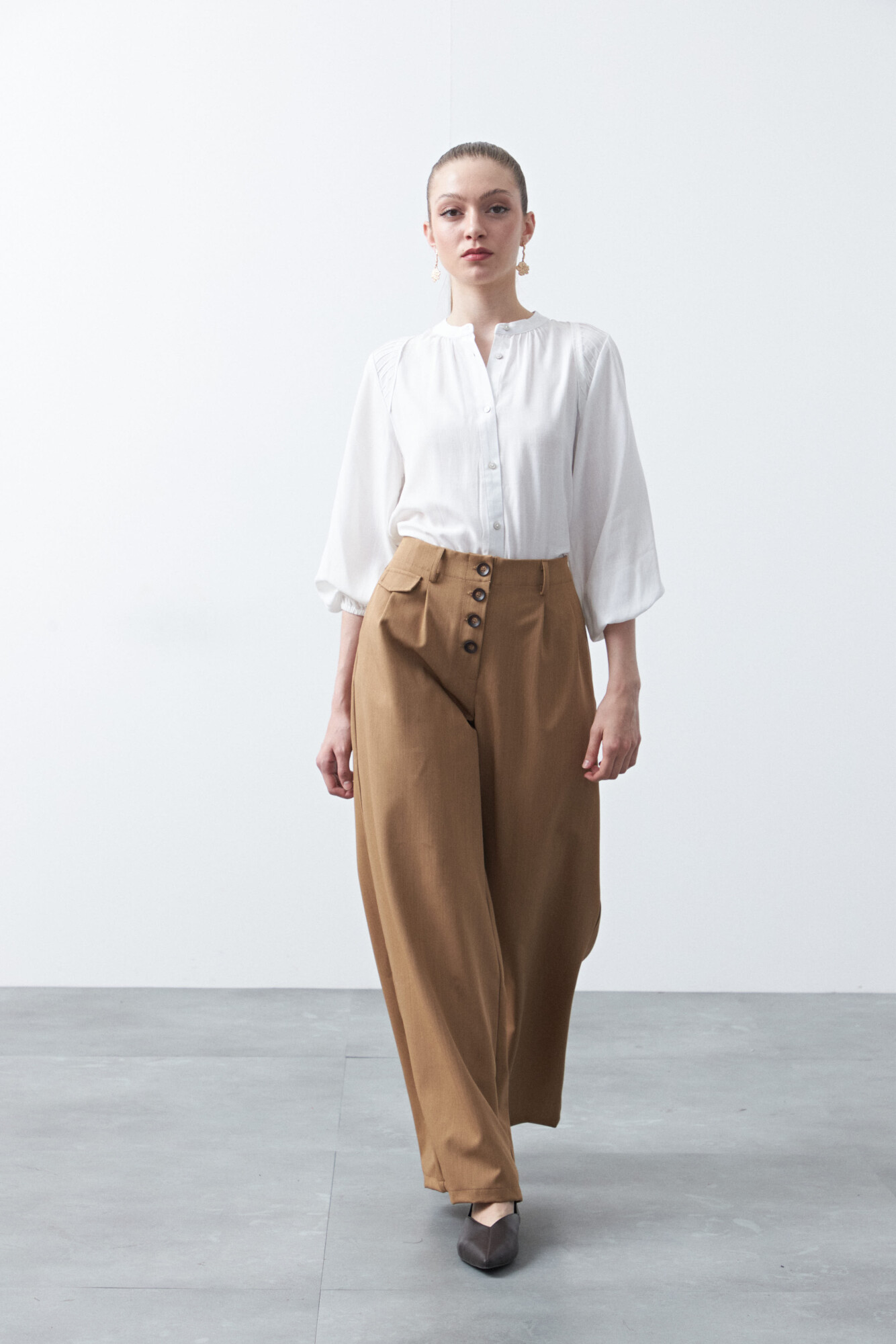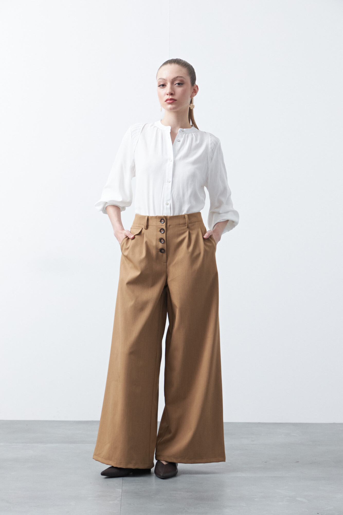 Camisa de manga larga de silueta relajada, confeccionada en tejido de caída fluida que aporta movimiento y confort. Presenta un delicado trabajo de tablas en la zona de los hombros, que suma textura y un detalle diferencial al diseño, junto con costuras prolijas que realzan la calidad de la prenda.