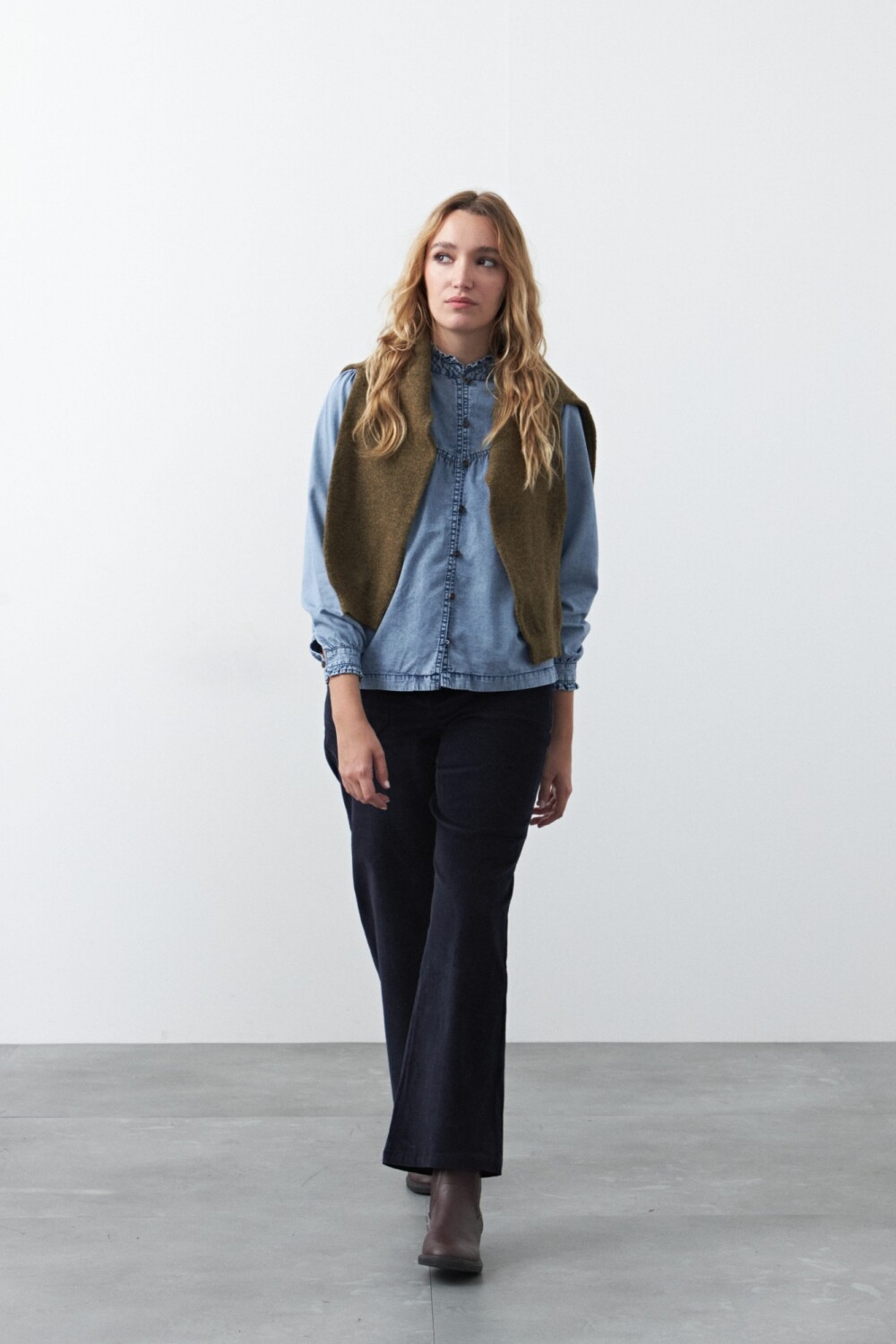 Camisa de manga larga con cuello mao y terminación levemente fruncida que aporta un aire romántico y actual. De calce relajado, se destaca por sus recortes con pespuntes visibles que estructuran la prenda y suman textura. Una opción versátil que eleva cualquier look, ideal para combinar tanto en clave casual como más arreglada.