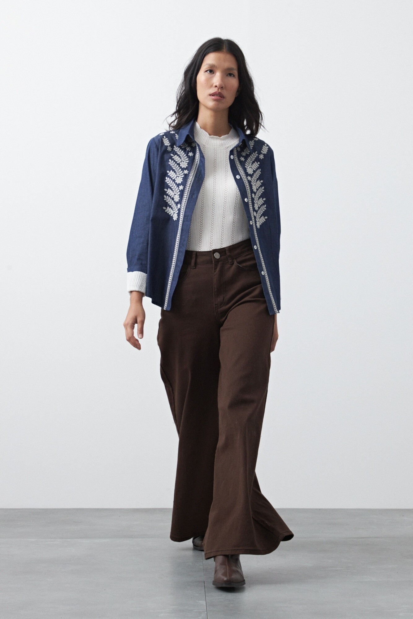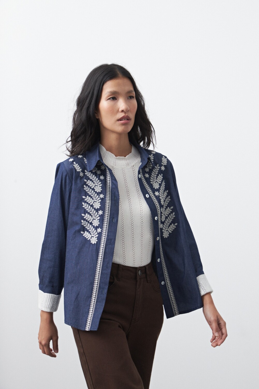 Camisa de manga larga bordada con impronta artesanal y silueta relajada, ideal para sumar textura y personalidad al look. El frente presenta bordado floral simétrico que enmarca la botonadura y aporta un detalle protagonista, elevando el diseño con un acabado delicado y en tendencia.