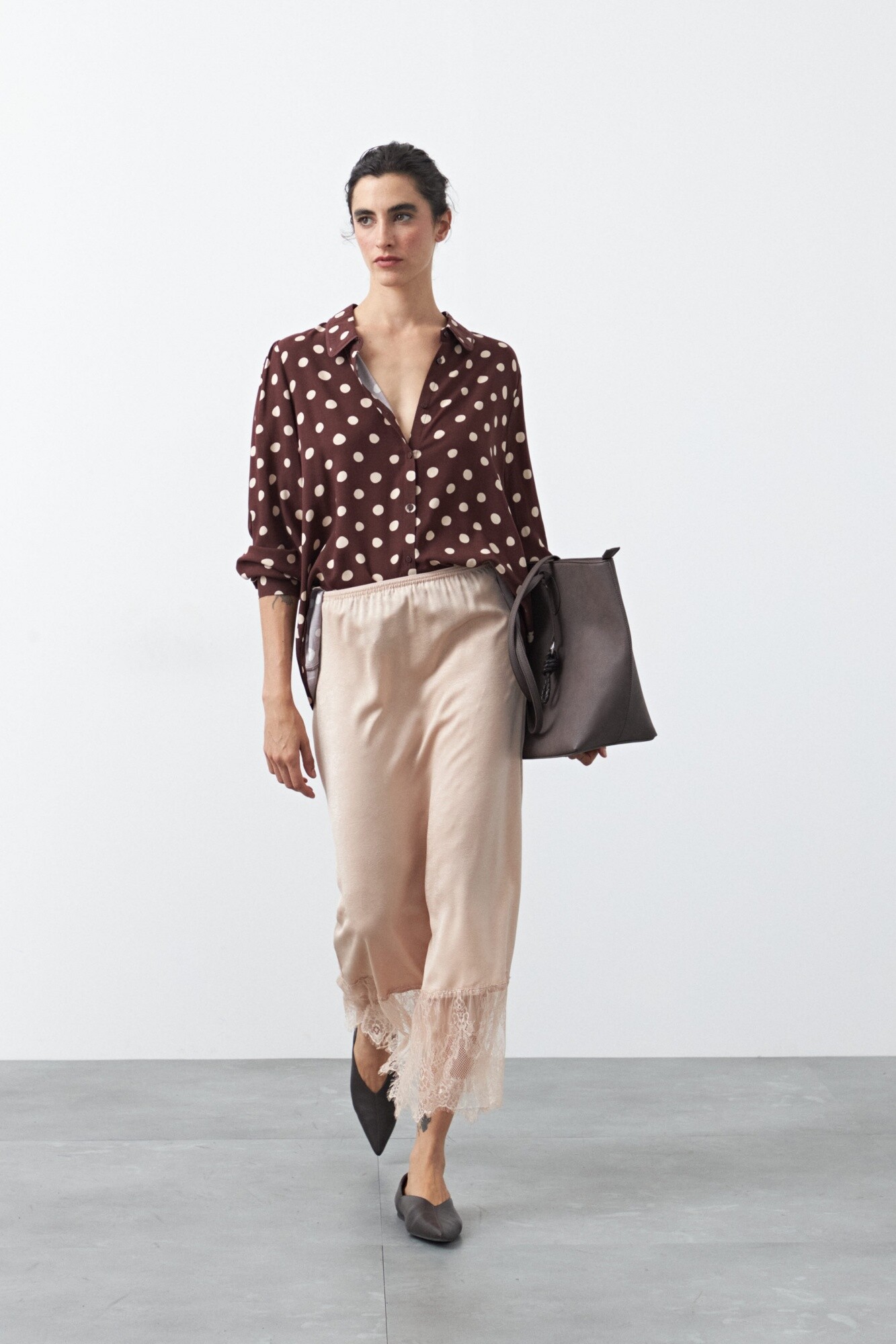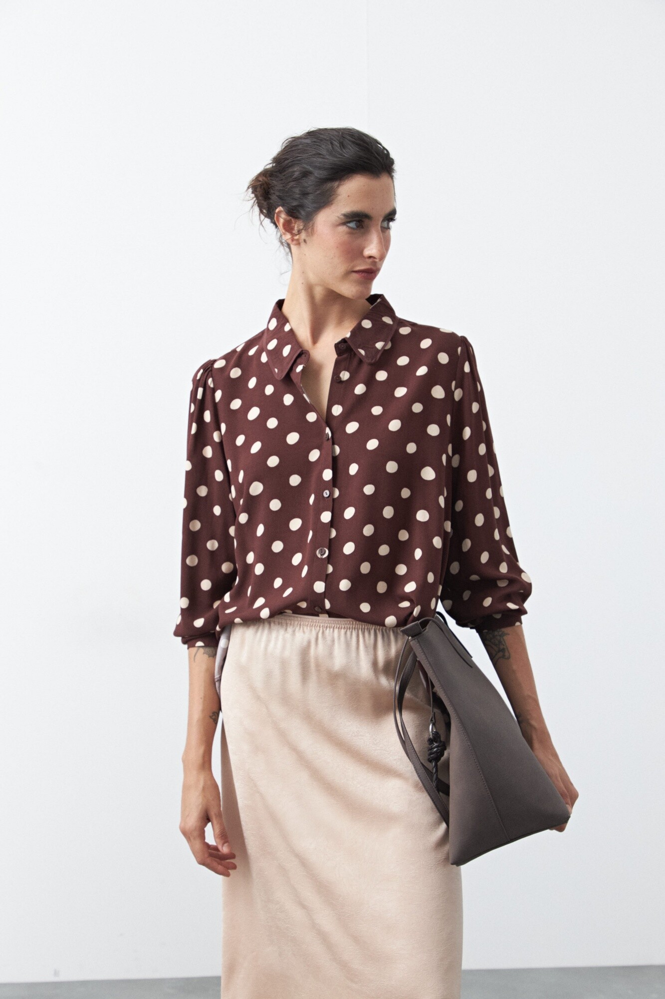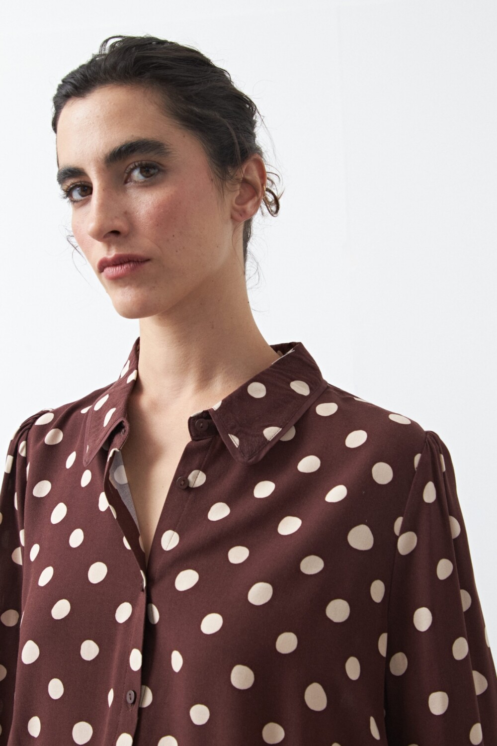 Camisa estampada de manga larga confeccionada en tejido liviano que acompaña el movimiento y aporta una caída fluida. El diseño se destaca por el detalle del cuello, con terminación sutil que suma carácter y eleva la prenda, logrando un equilibrio justo entre lo clásico y lo actual.