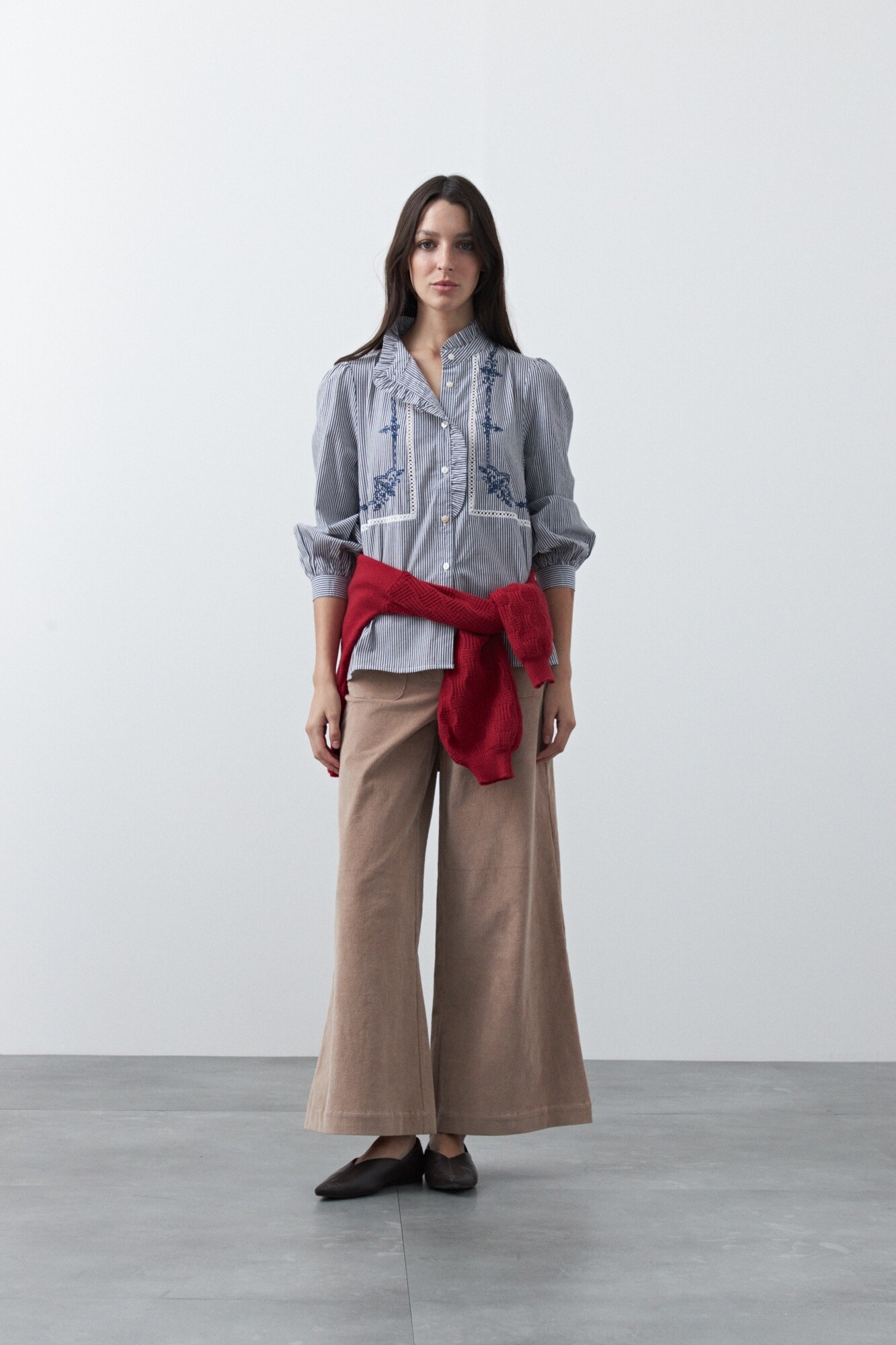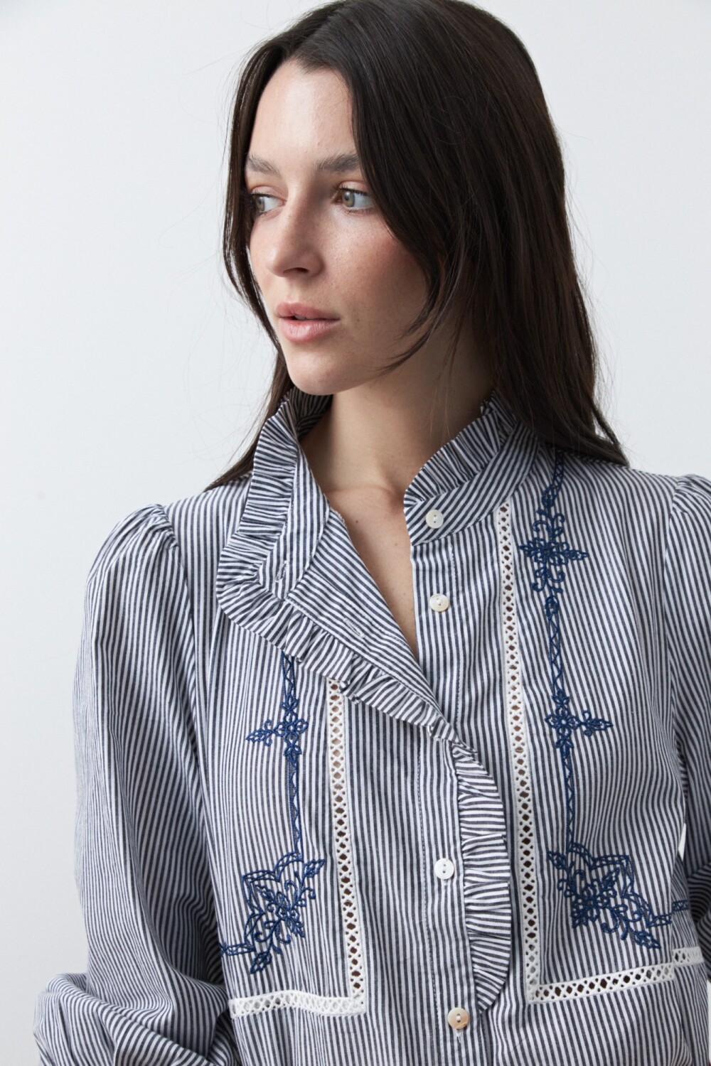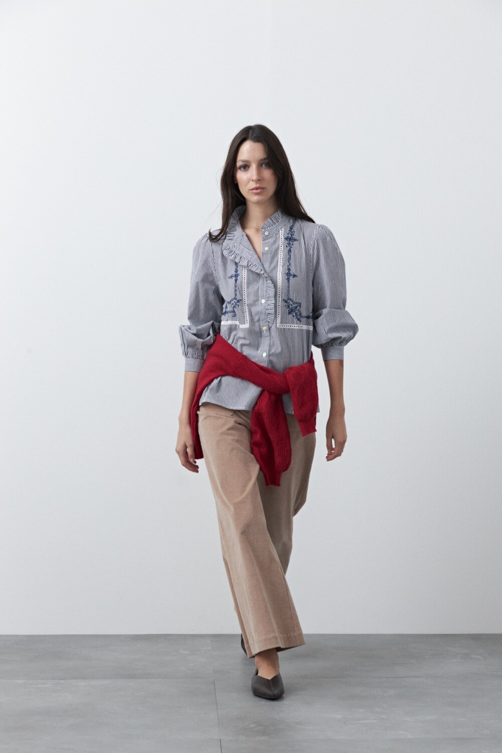 20 Camisa de rayas con cuello mao y detalle de volado que enmarca el escote, sumando un toque romántico y sofisticado. Presenta bordados delicados y recortes con calados que aportan textura y elevan el diseño, mientras su calce relajado la convierte en una prenda versátil para distintos momentos del día.