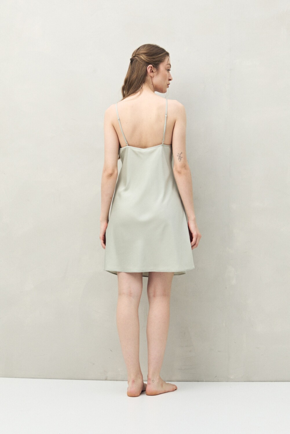 Confeccionado en tejido satinado con leve elasticidad, se destaca por su tacto suave y confortable. Presenta escote en V con recorte bajo busto que aporta un calce favorecedor, tiras finas regulables y una estructura liviana que acompaña el movimiento sin ajustar. Una prenda cómoda y elegante, ideal para sumar bienestar y un toque sofisticado al descanso.