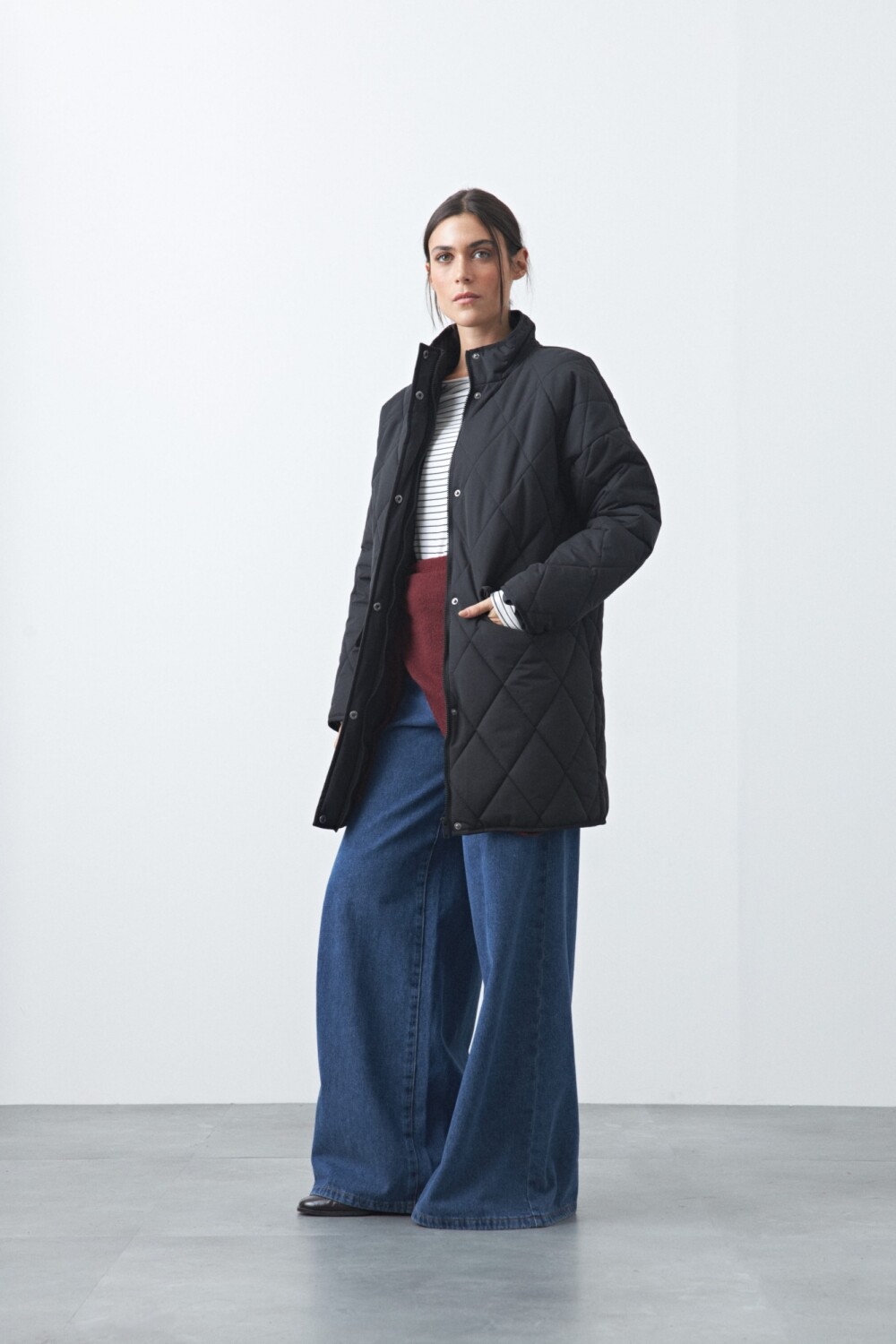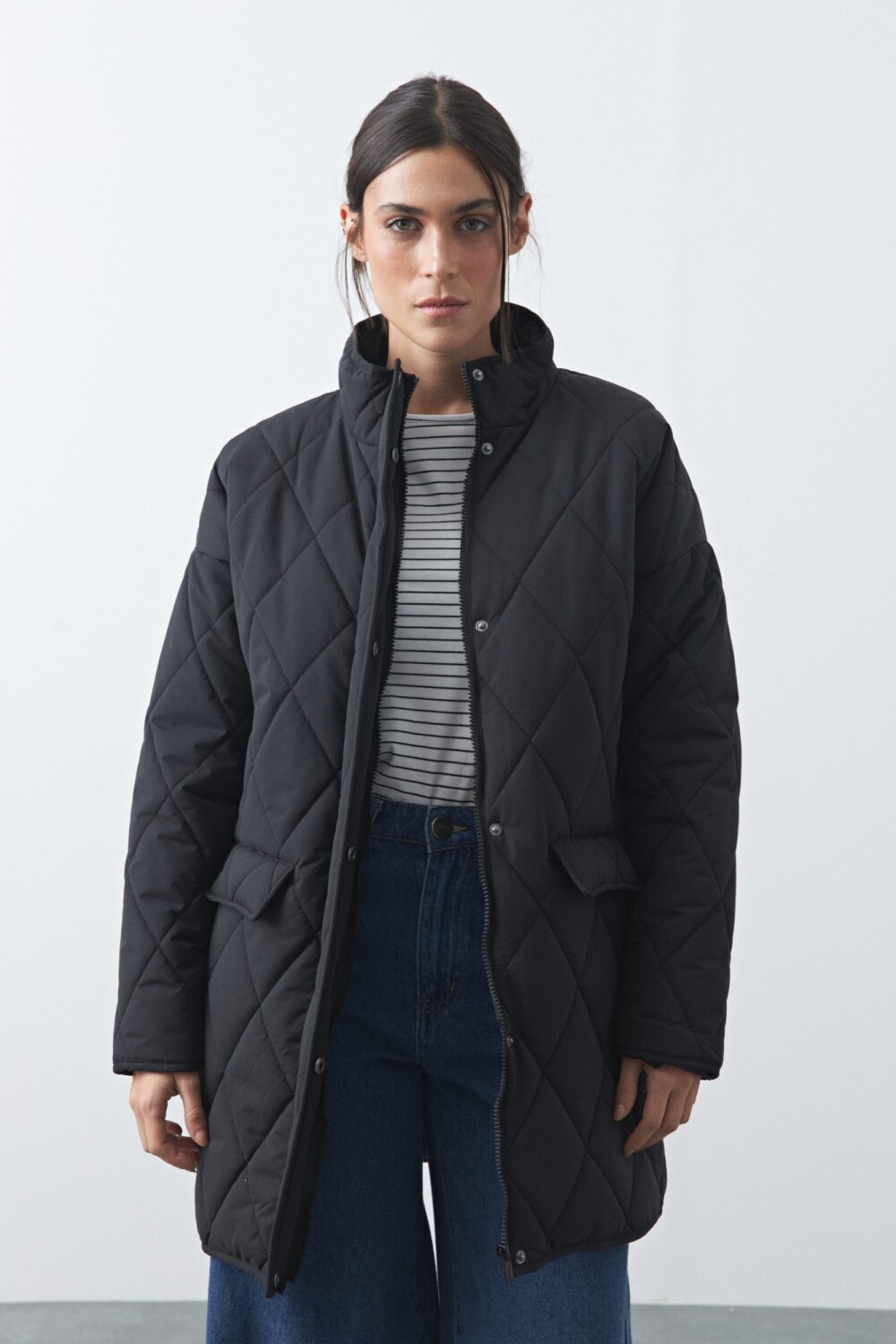 Campera capitoneada de largo medio, con cuello alto, cierre frontal y broches a presión. los bolsillos con solapa suman funcionalidad y un toque urbano. Ideal para acompañar looks de invierno con una silueta cómoda, canchera y fácil de combinar.