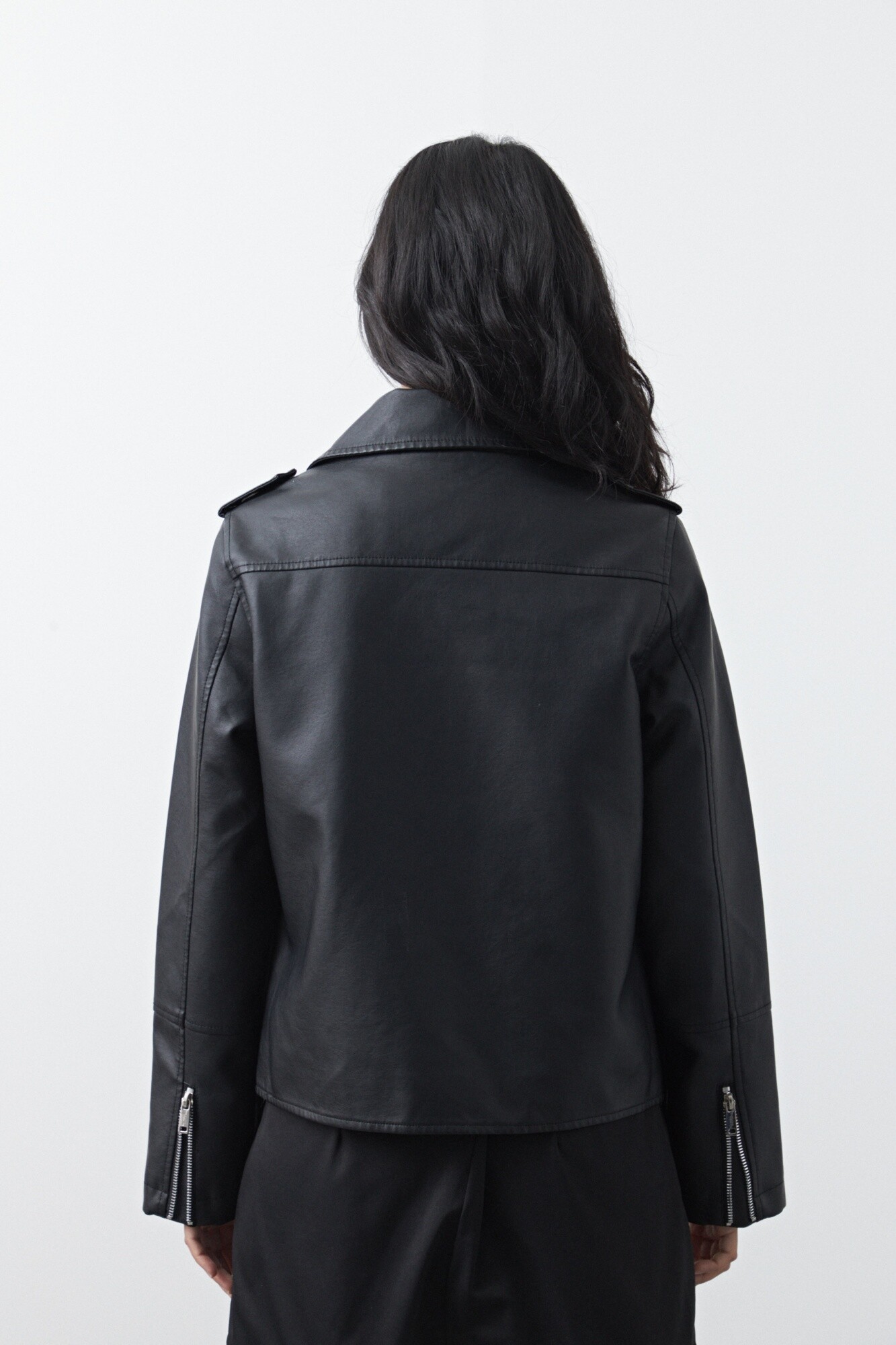 Su diseño con cierre diagonal, solapas amplias y herrajes metálicos refuerza ese espíritu original, mientras que el material aporta estructura y un acabado liso que eleva cualquier look. Perfecta para contrastar con prendas más delicadas o potenciar outfits minimalistas con un toque de carácter.