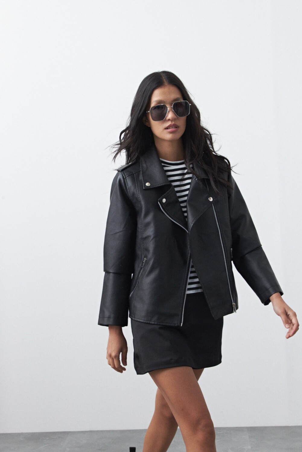 Campera en símil cuero de inspiración biker, una prenda icónica que nació a comienzos del siglo XX como abrigo funcional para motociclistas y que con el tiempo se convirtió en símbolo de rebeldía, actitud y estilo urbano. Hoy es un clásico indiscutido del guardarropa femenino: canchera, versátil y absolutamente atemporal.