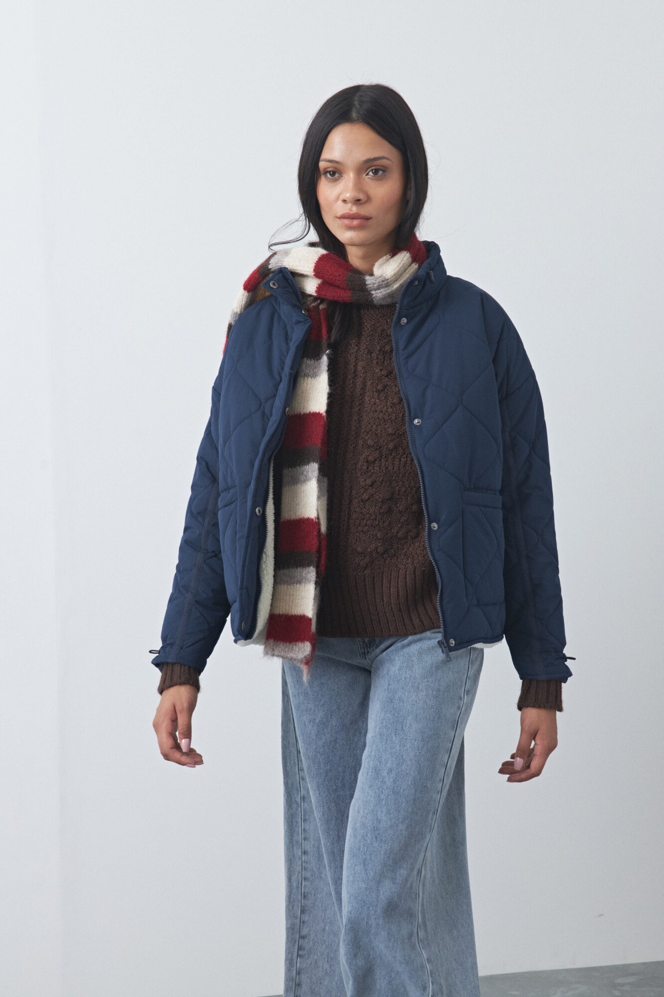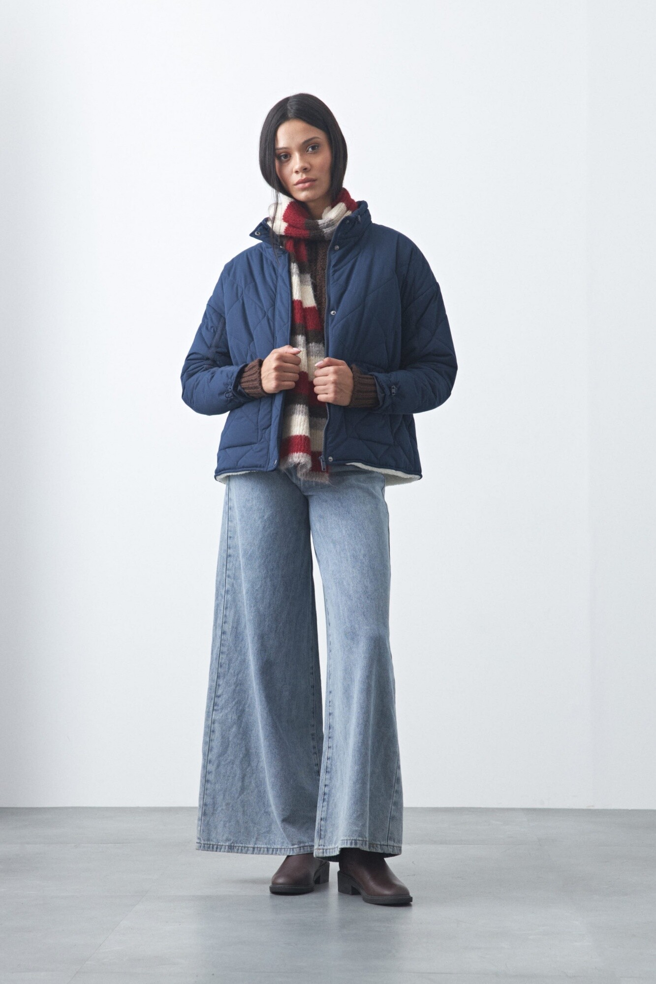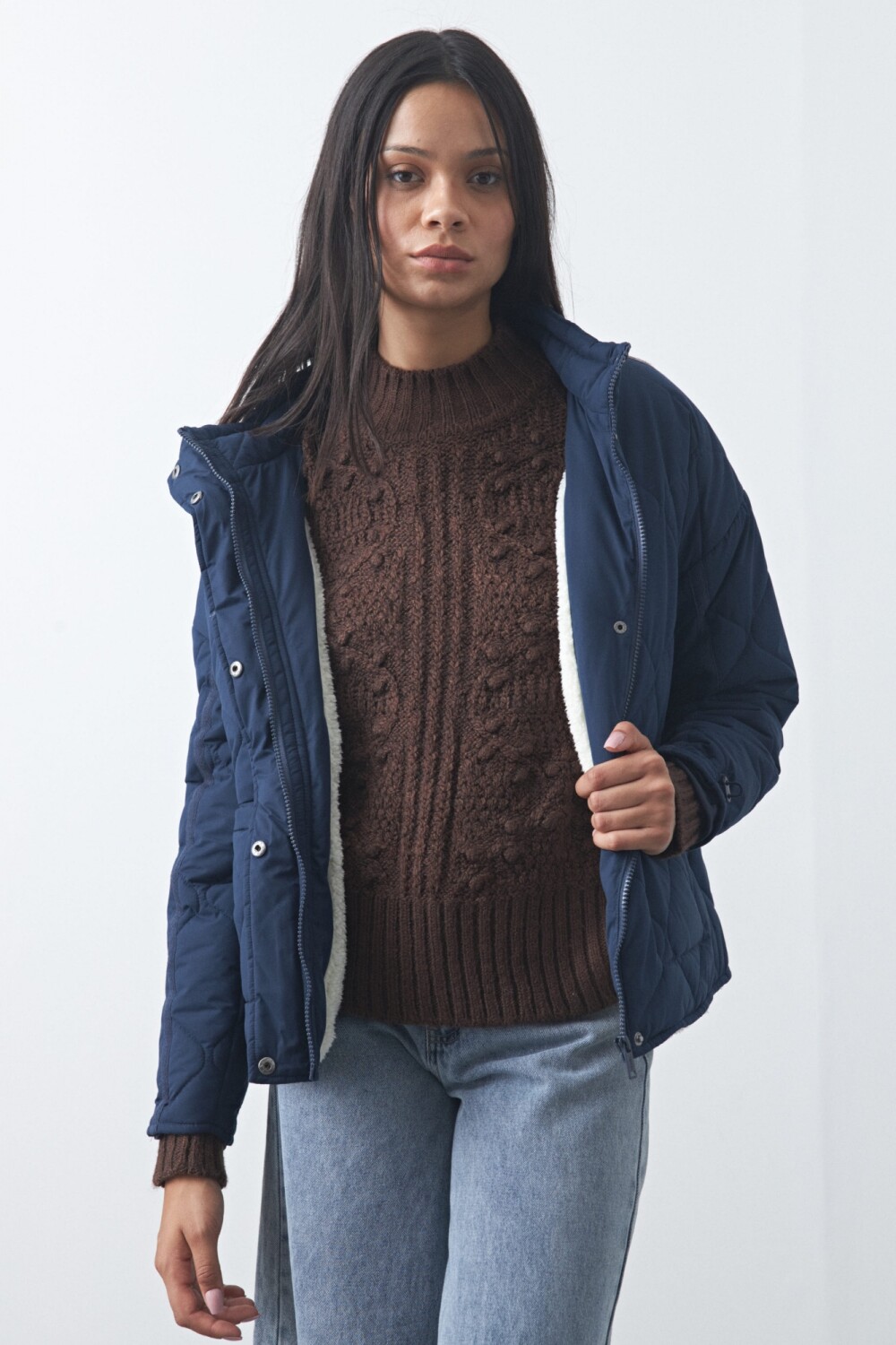 Campera de nylon de silueta corta y relajada, con cuello alto y cierre frontal que protege del frío. Su diseño acolchado aporta abrigo sin sumar peso, mientras que los bolsillos amplios la hacen práctica para el día a día. Interior forrado con textura suave tipo corderito que suma confort térmico. Una opción versátil y en tendencia para completar looks urbanos con comodidad.